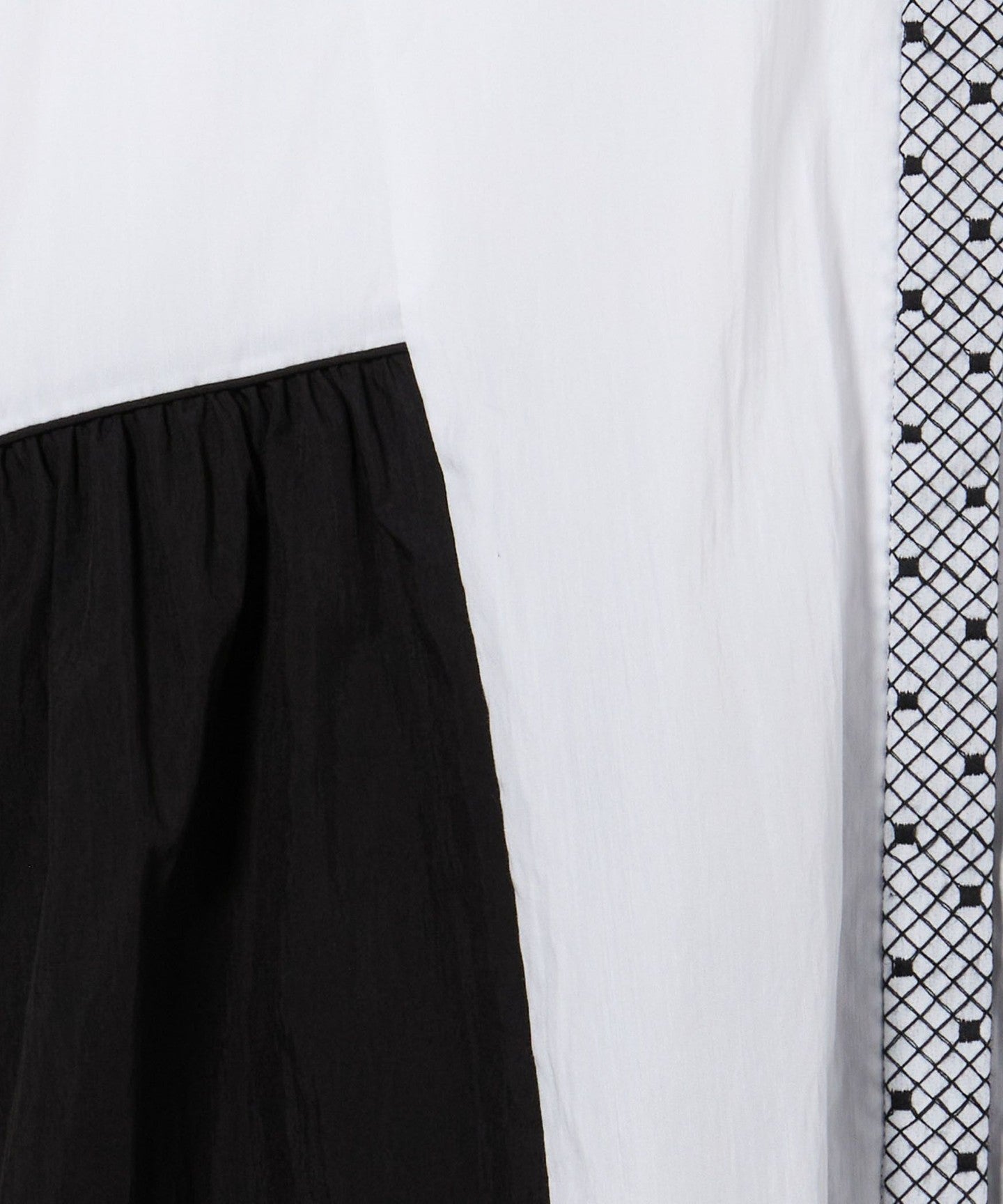 - Off-white has black embroidery and piping.