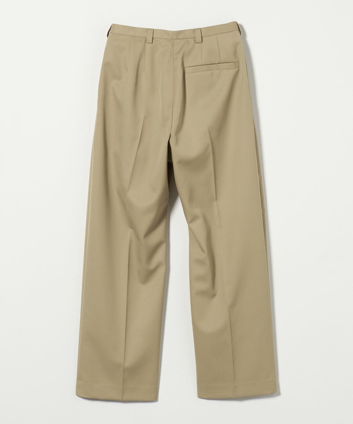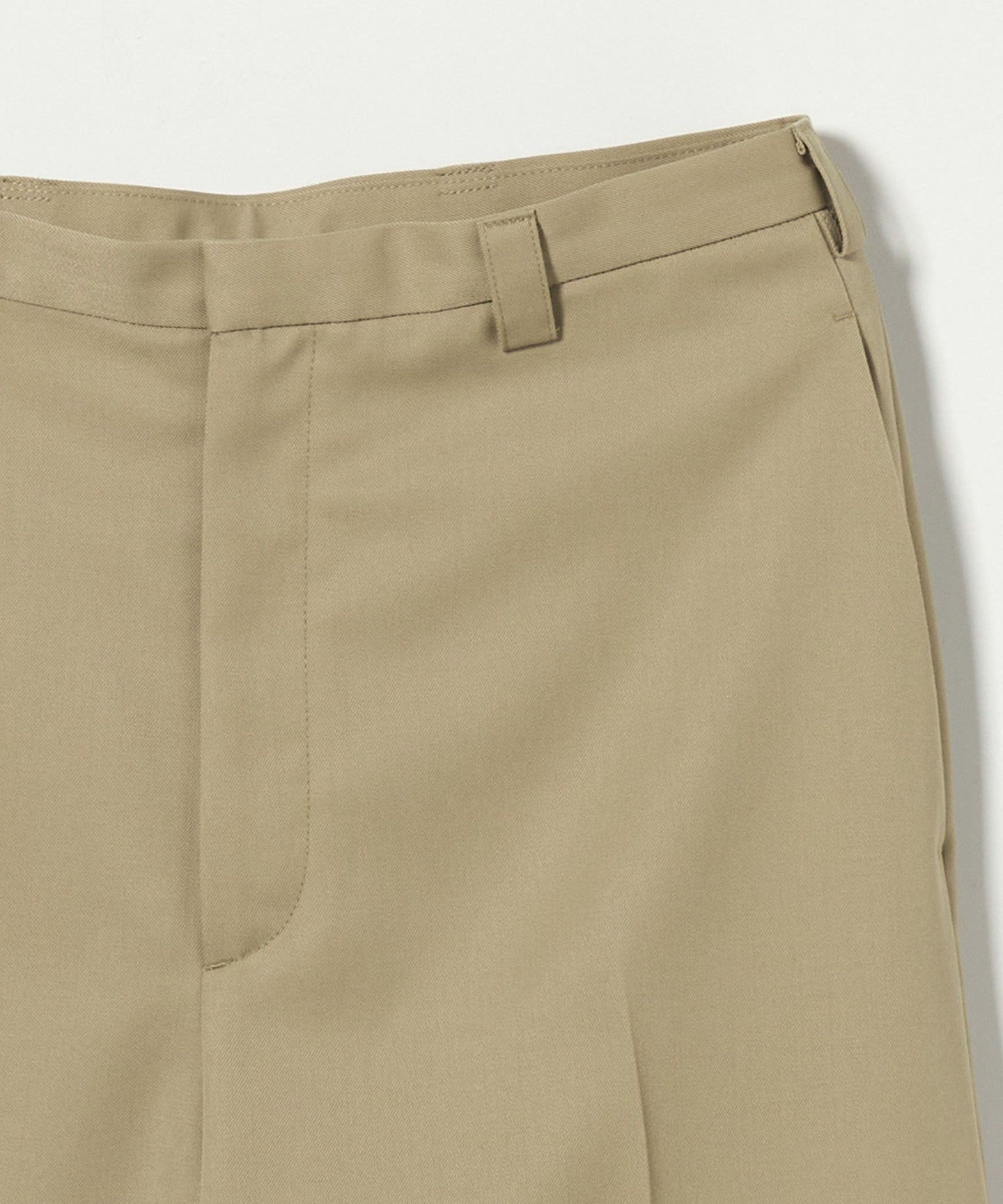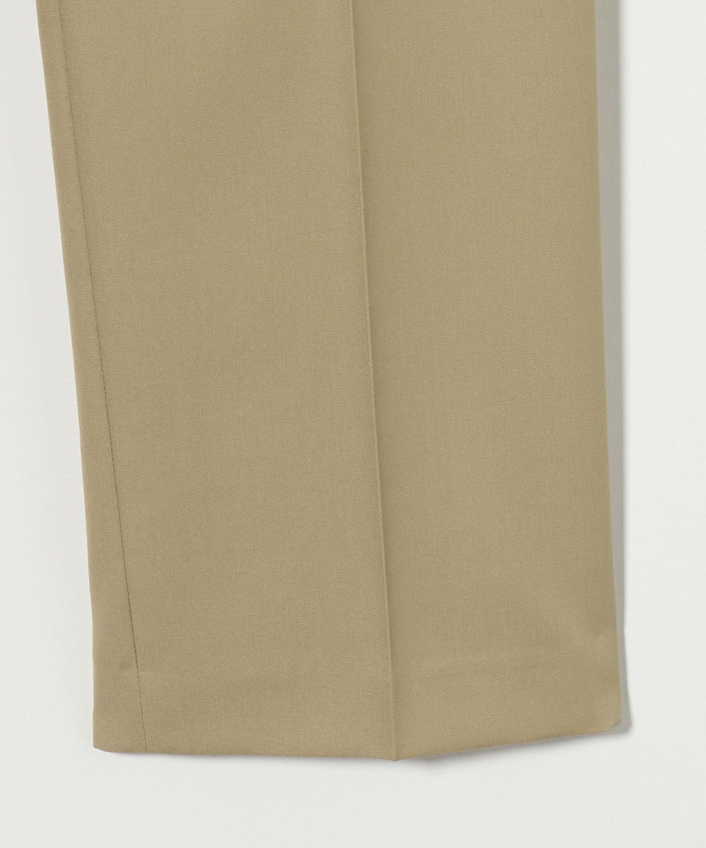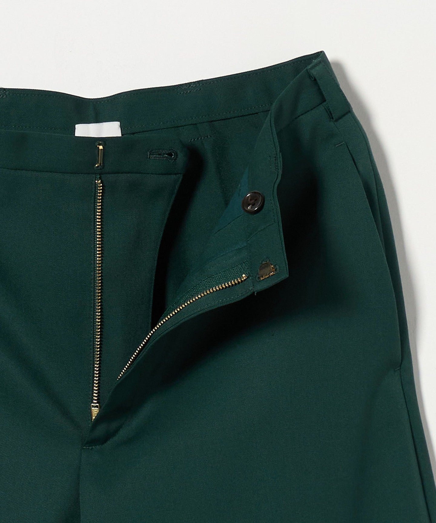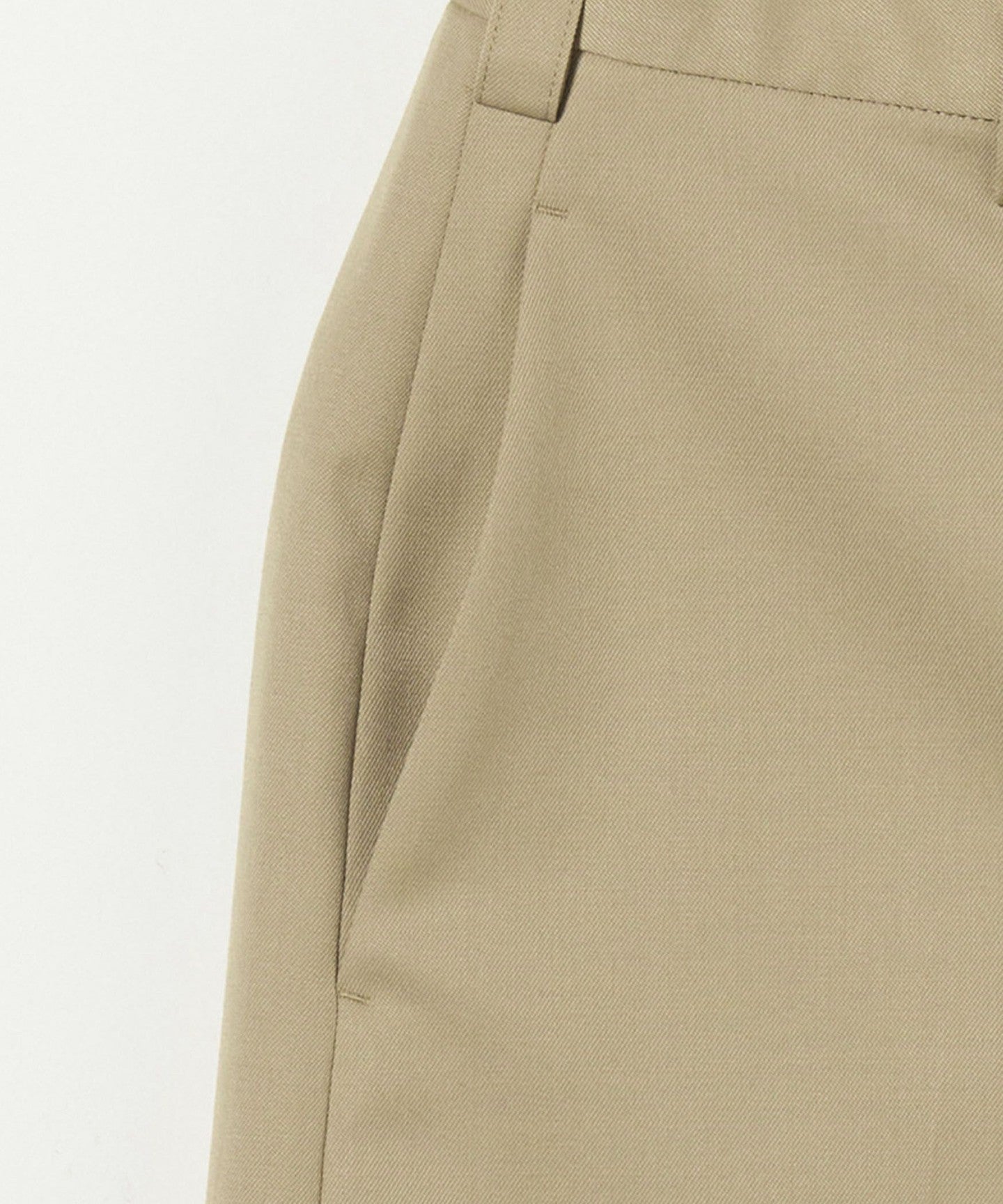 This masculine item is made from a fabric with just the right amount of tension, woven at a high density from a blend of polyester and wool, but it also features a clean silhouette with a center crease that emphasizes the vertical lines.