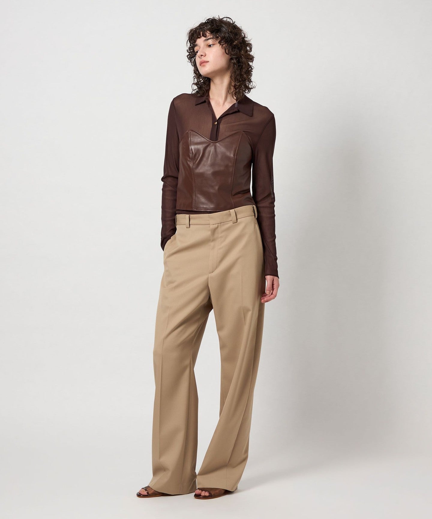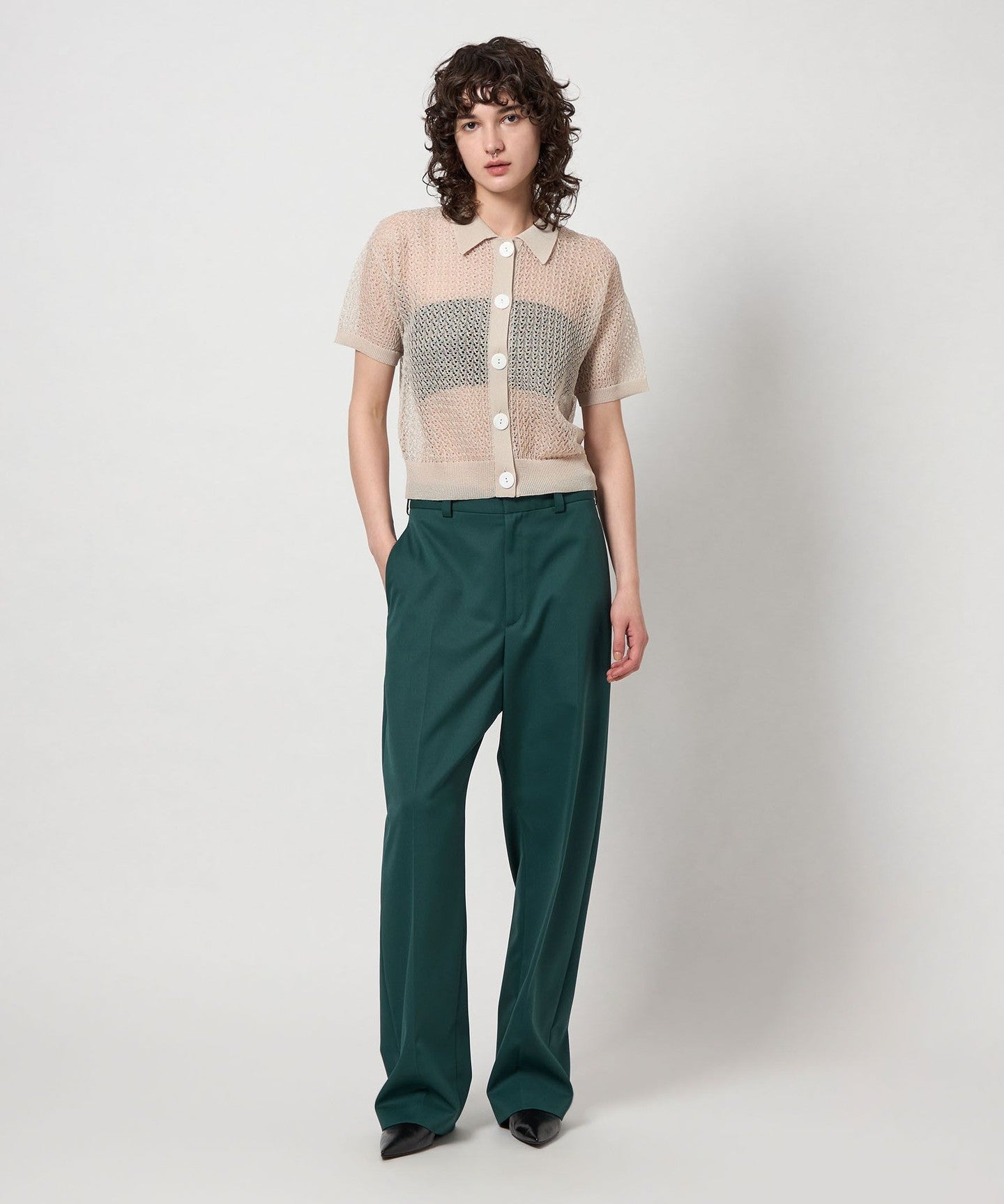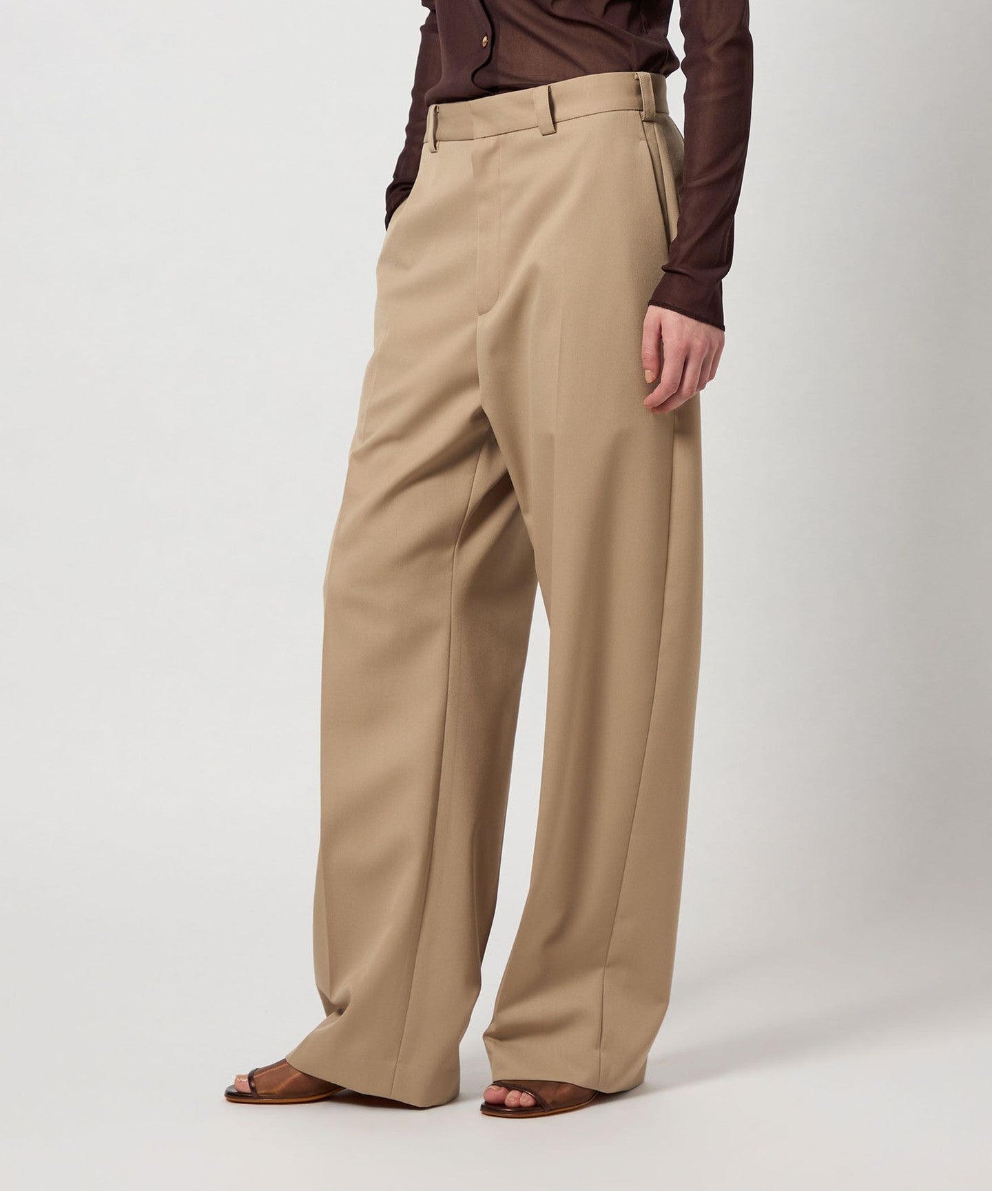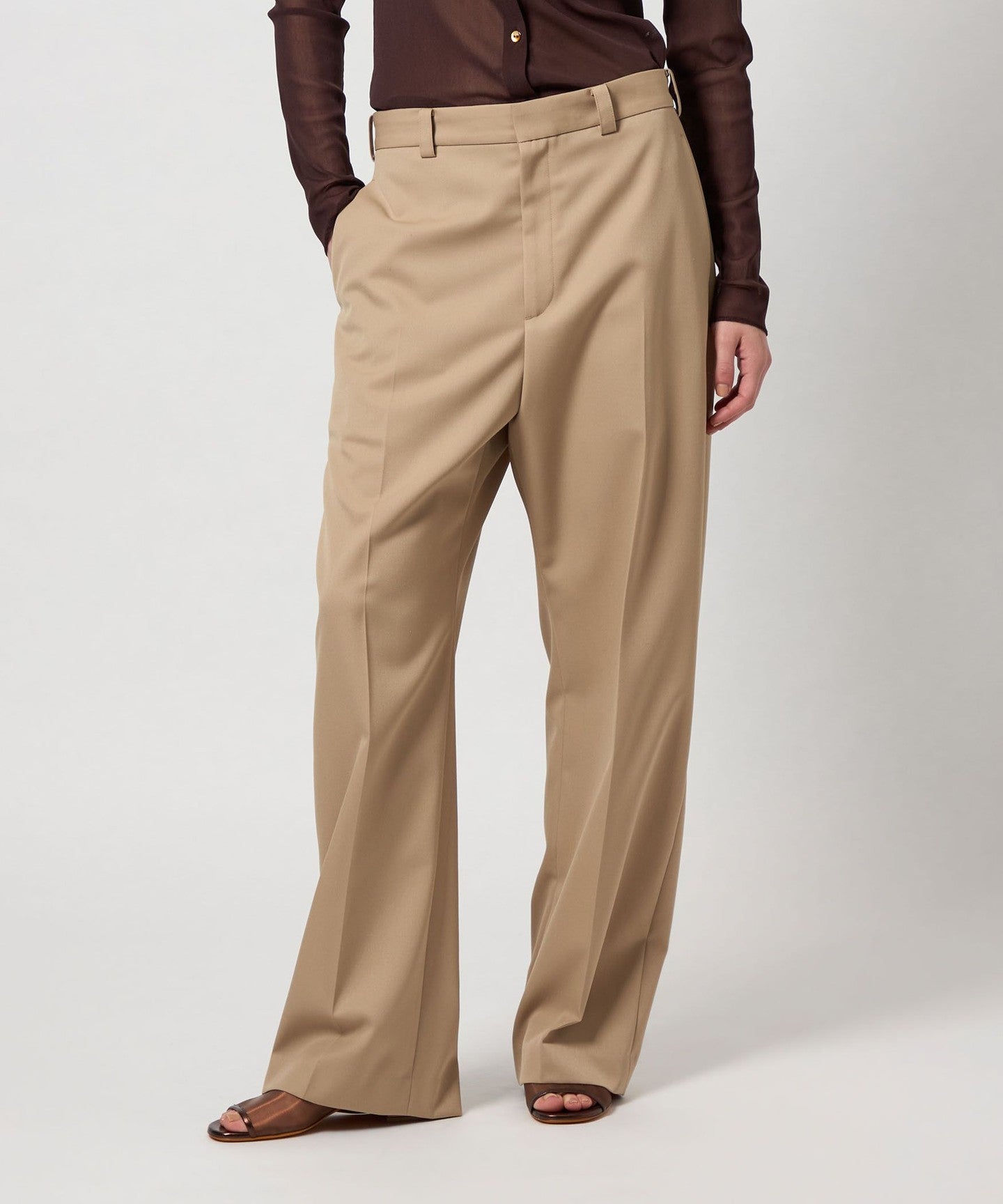This masculine item is made from a fabric with just the right amount of tension, woven at a high density from a blend of polyester and wool, but it also features a clean silhouette with a center crease that emphasizes the vertical lines.