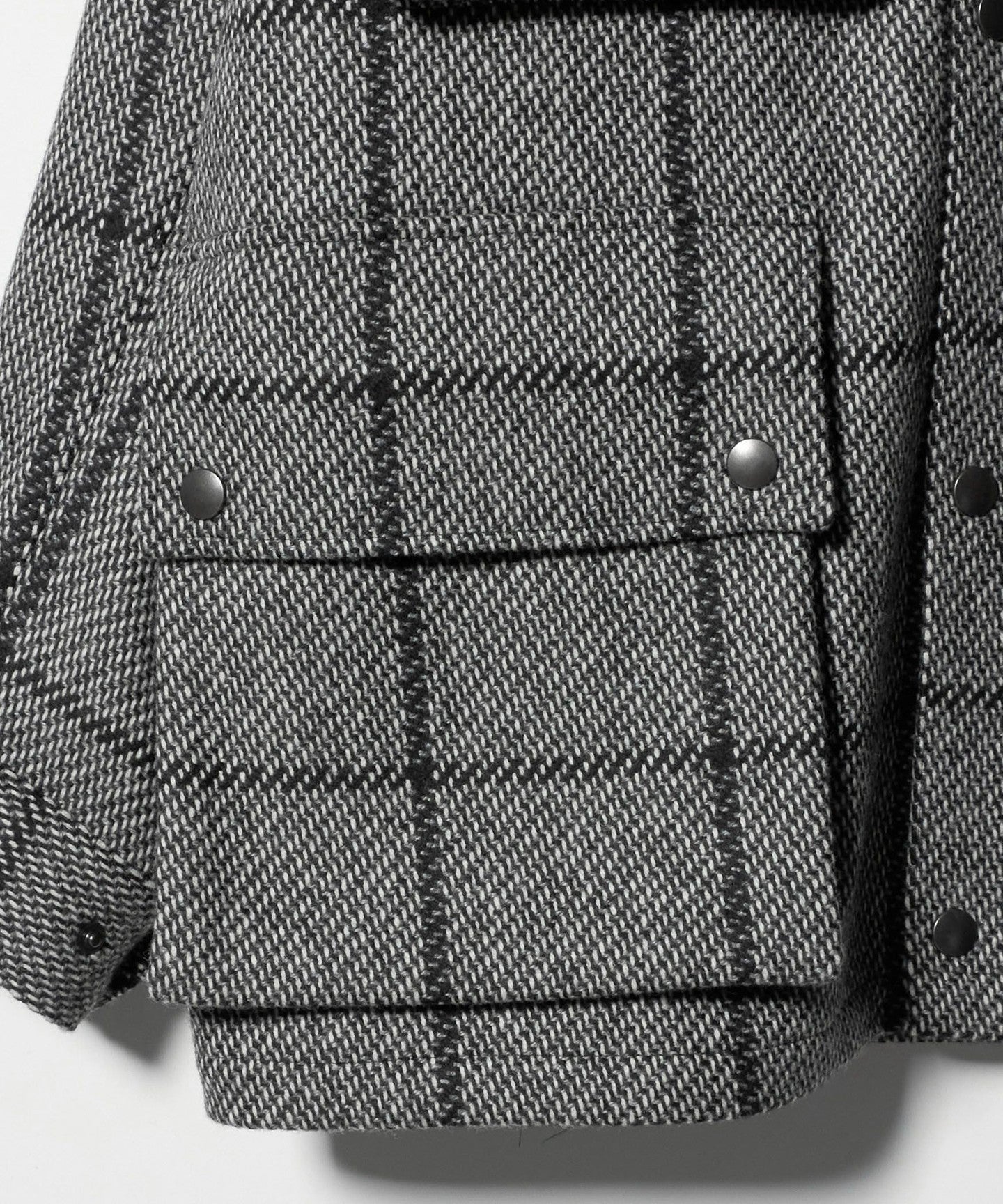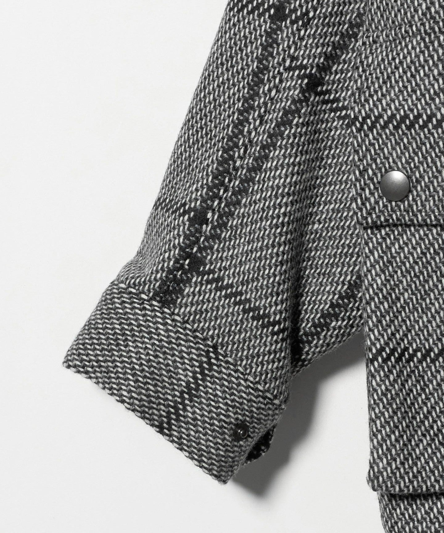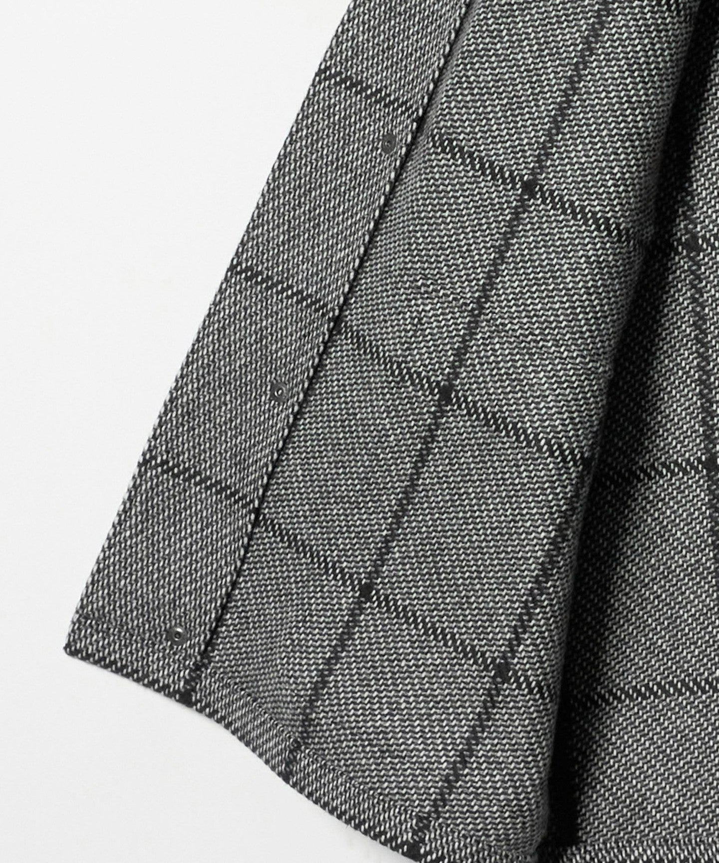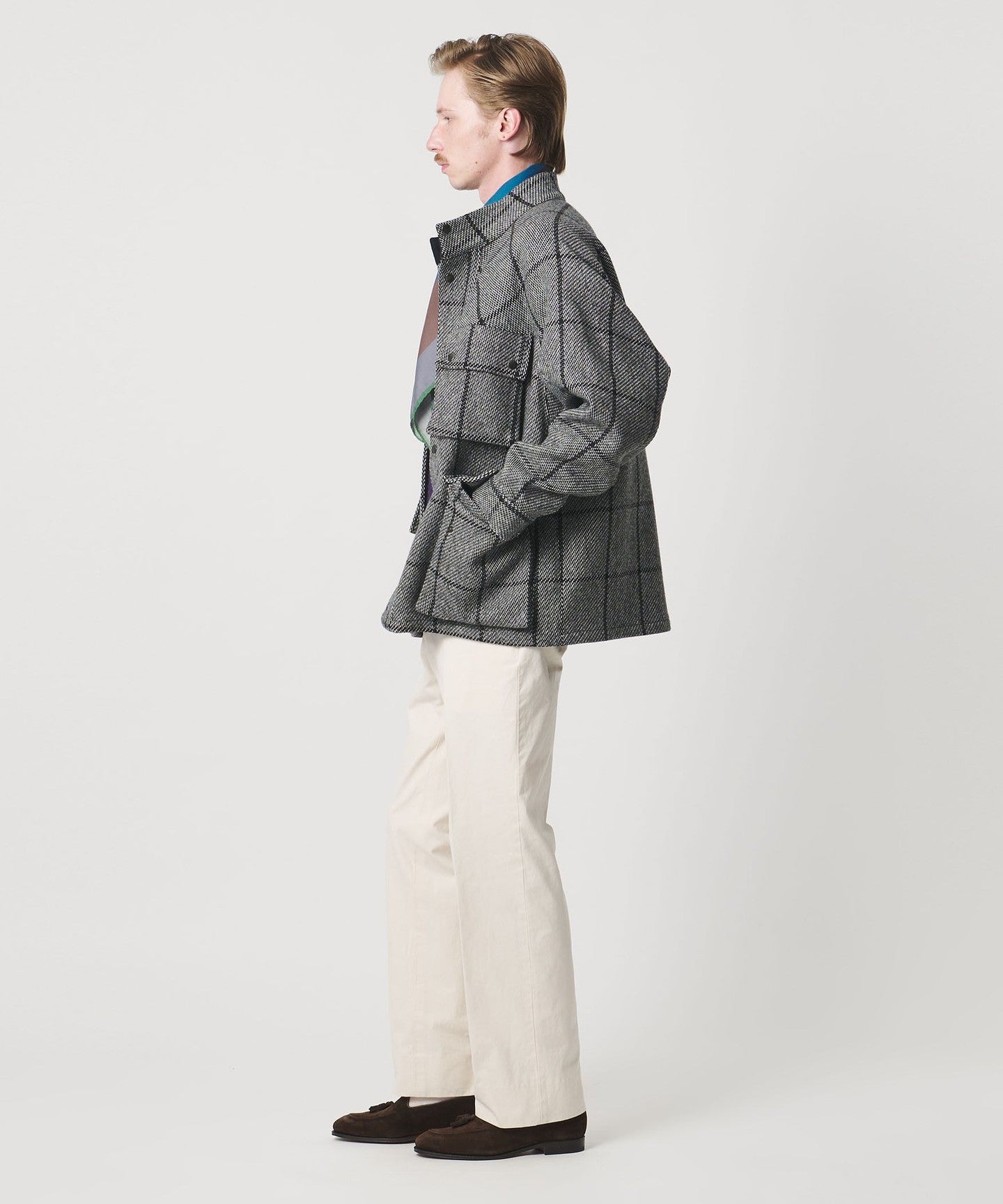 「KYNOCH」社製の白黒配色の杢糸を使ったクラシカルなウィンドウペン柄のツイード素材を使用。