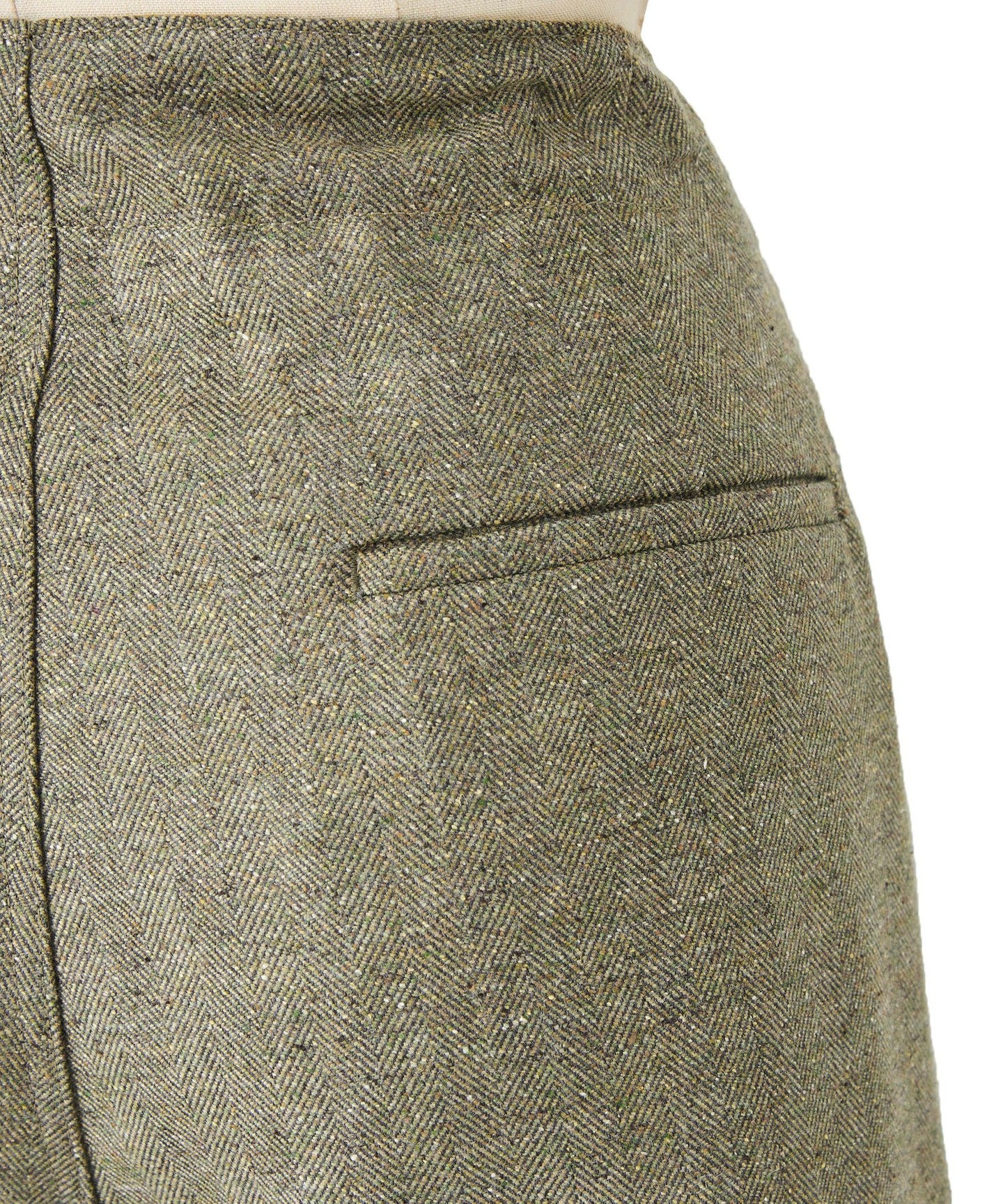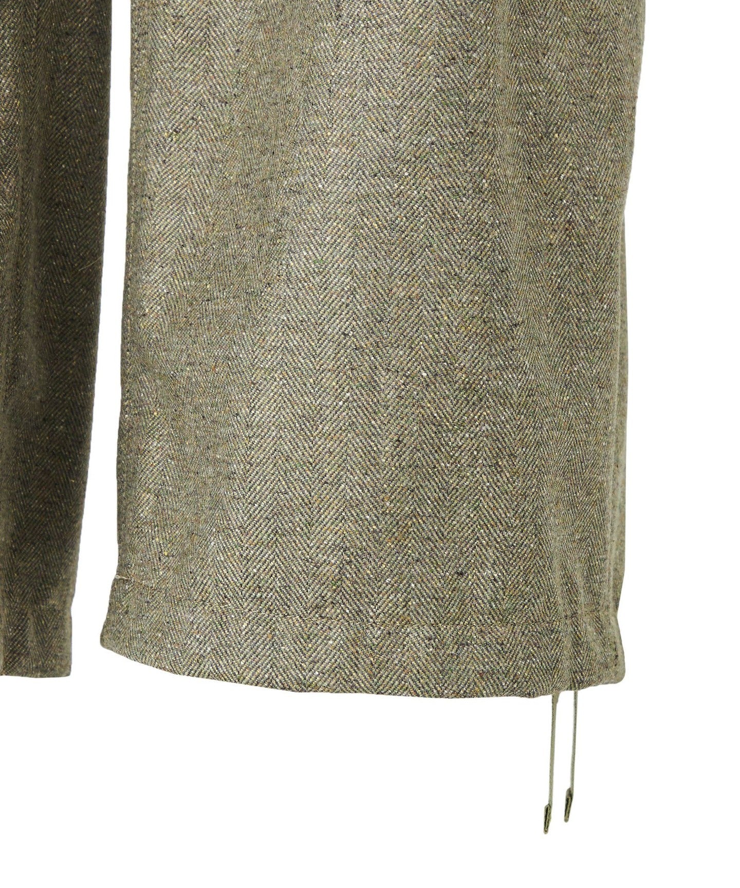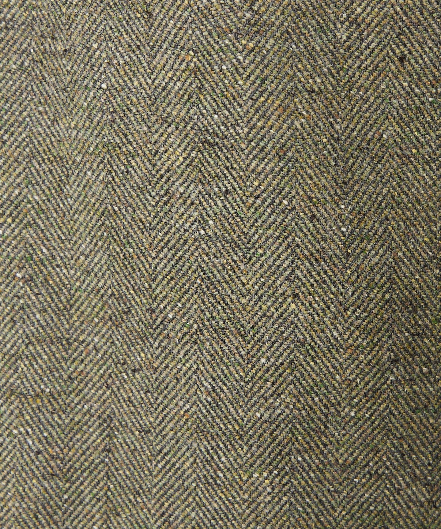 The fabric has an expressive herringbone pattern with multi-colored neps woven into it.
