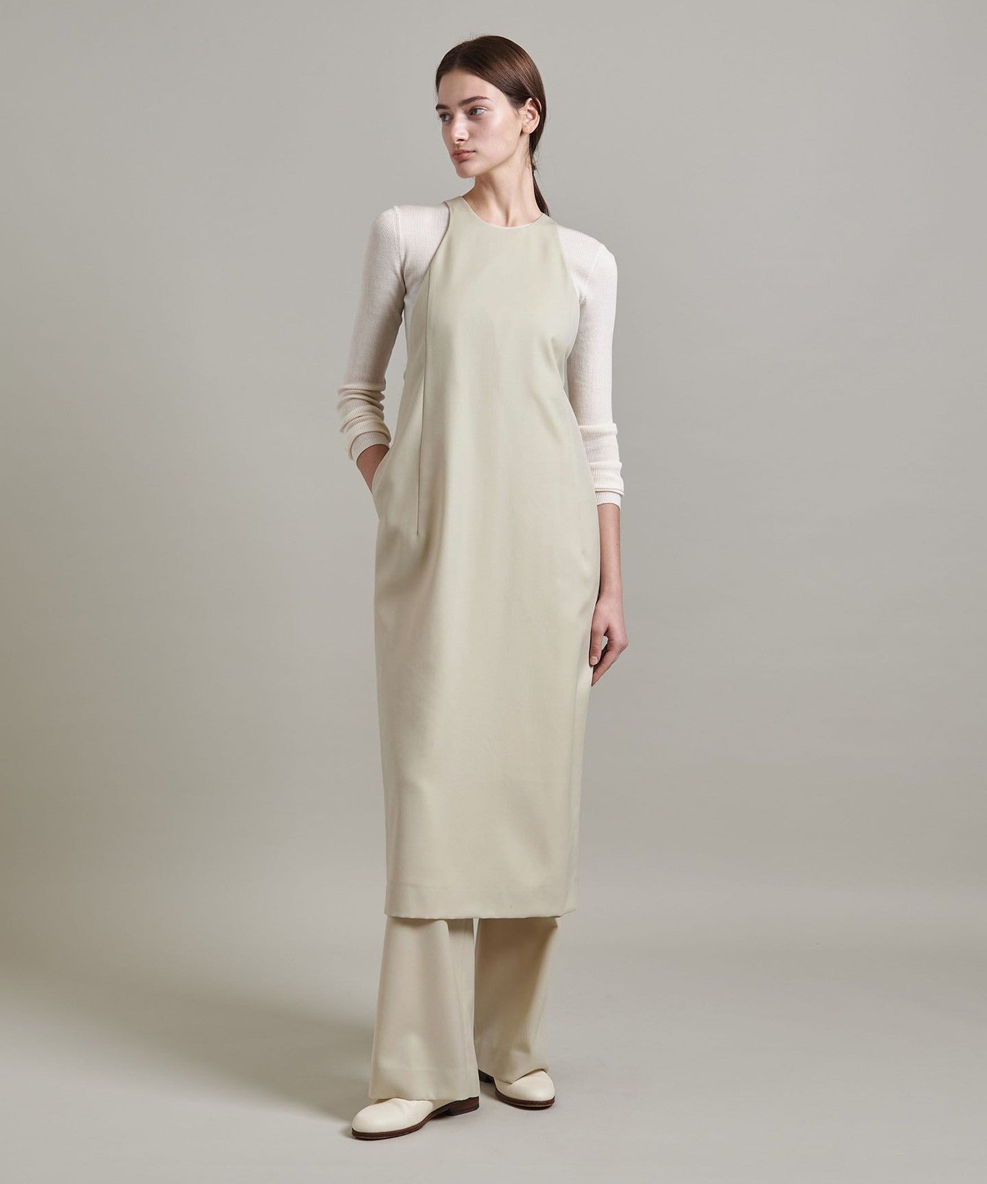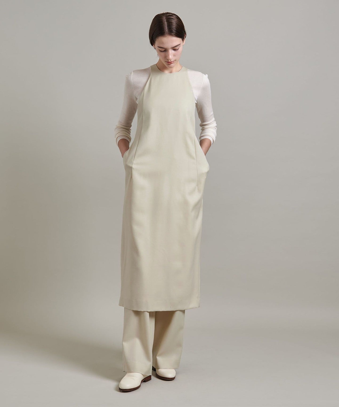 The key feature of this knee-length apron dress is the beautiful curves of the neck and armholes, which resemble American sleeves.