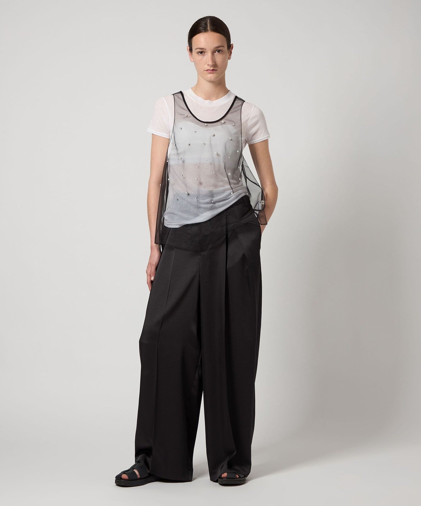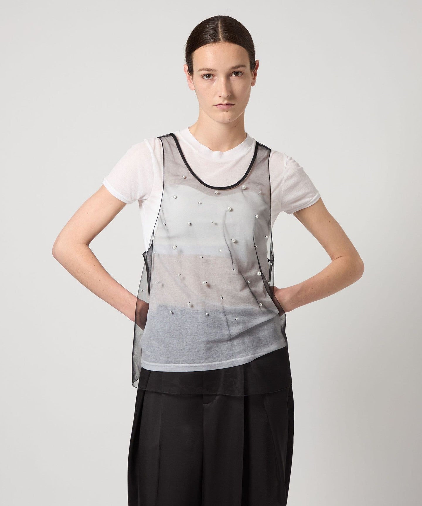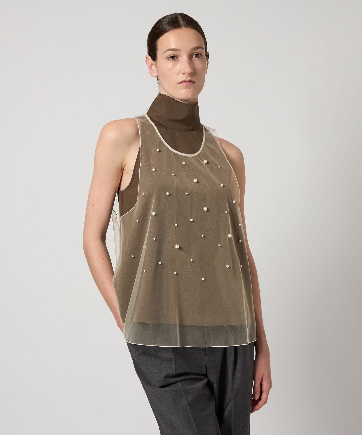A sleeveless blouse with randomly placed imitation pearl beads.