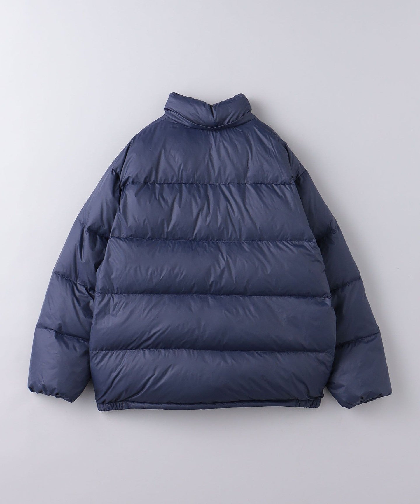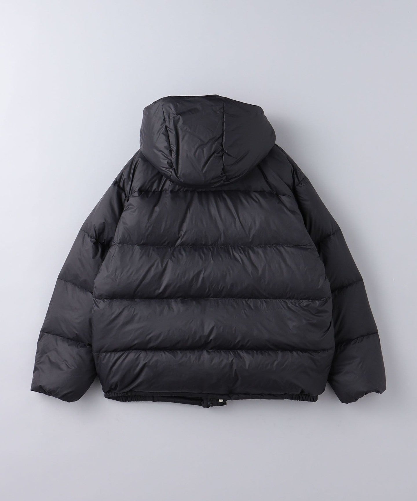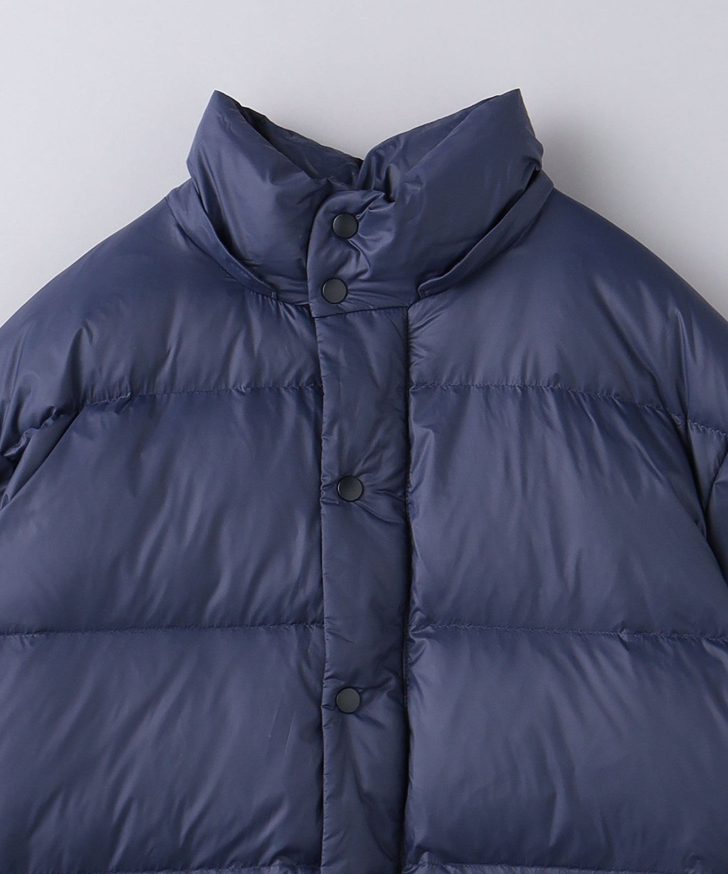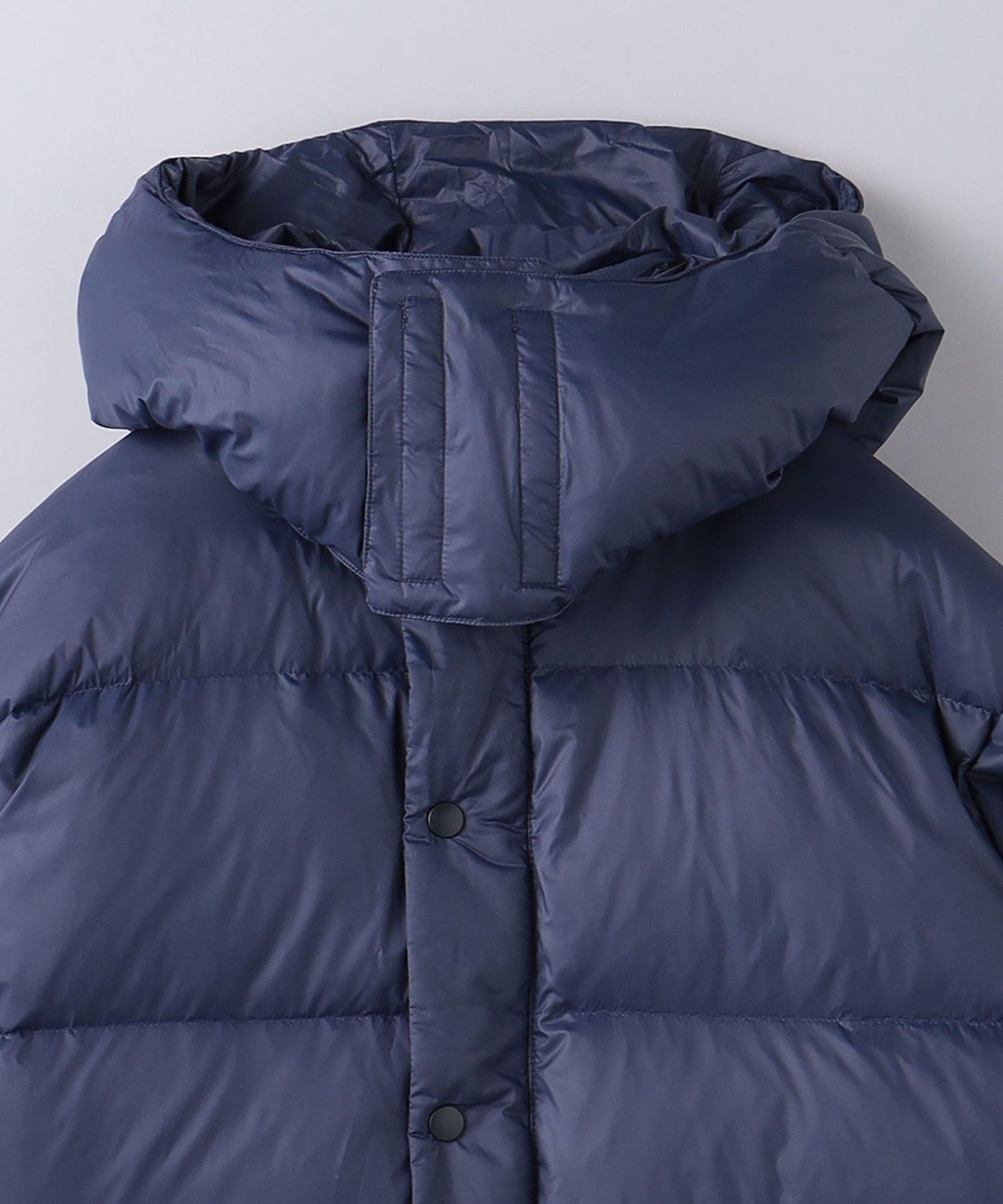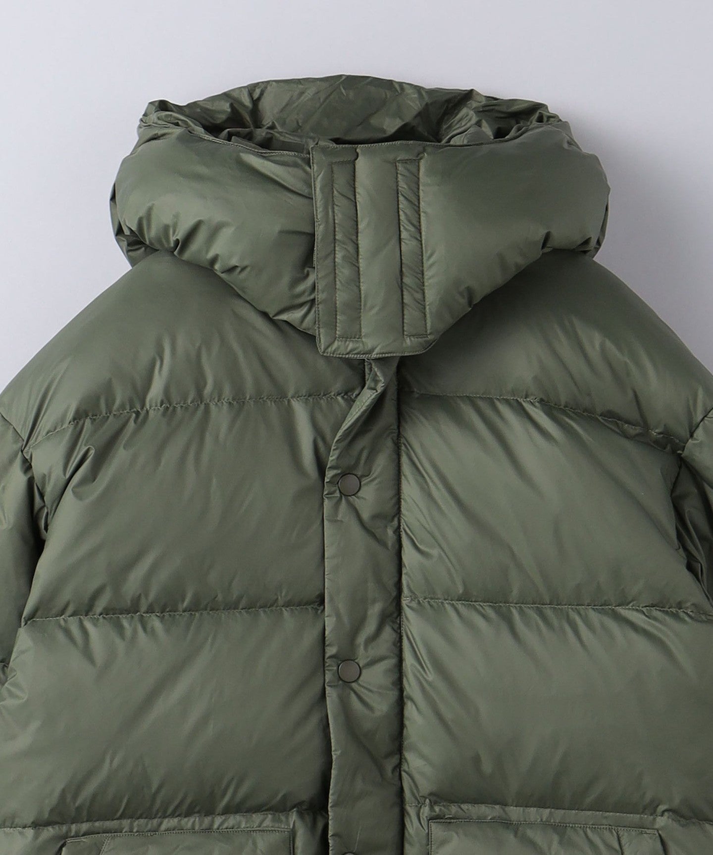 This down jacket features a moderate length and a relaxed, rounded silhouette.