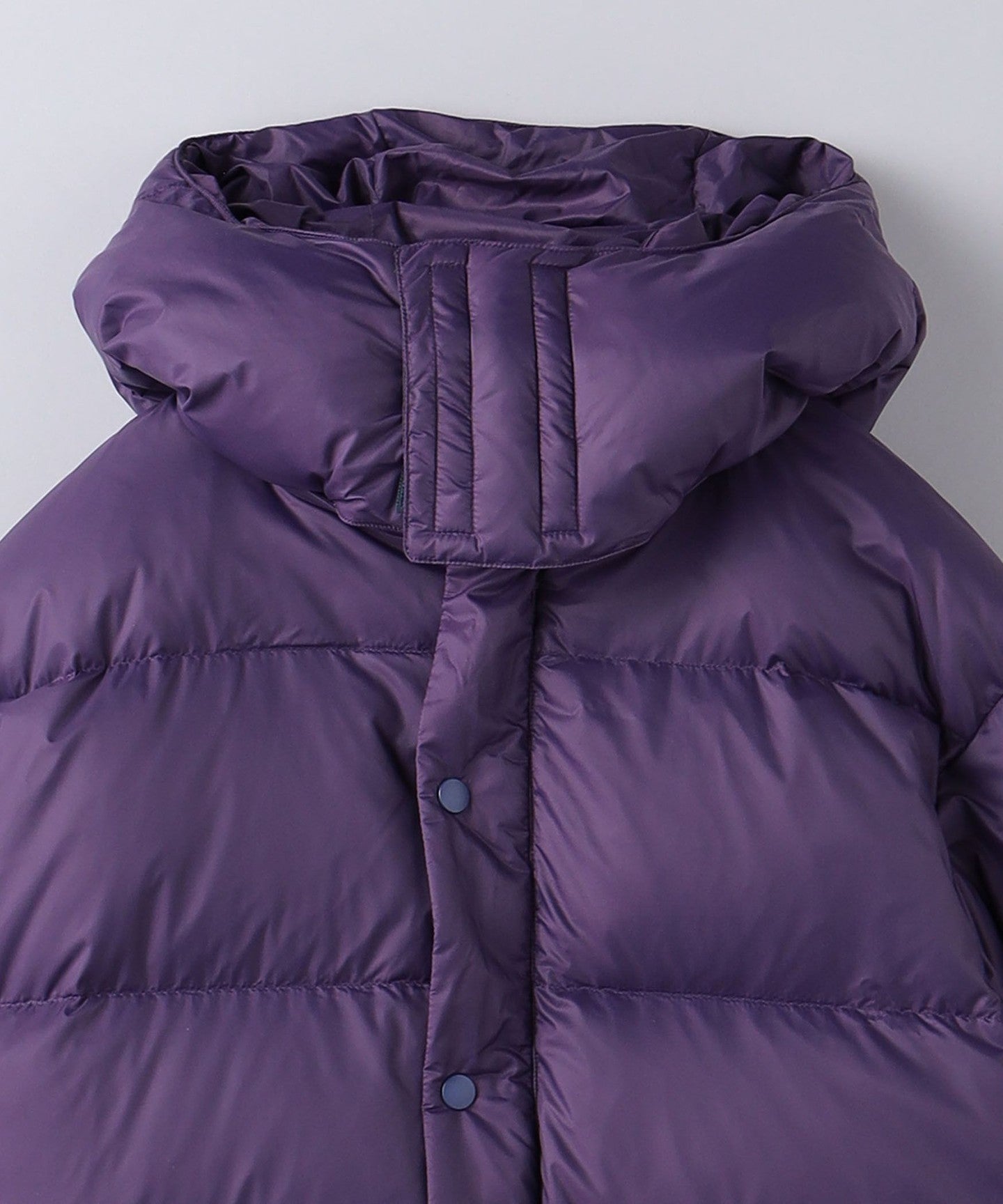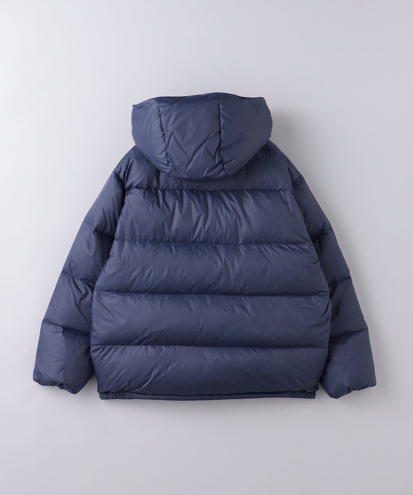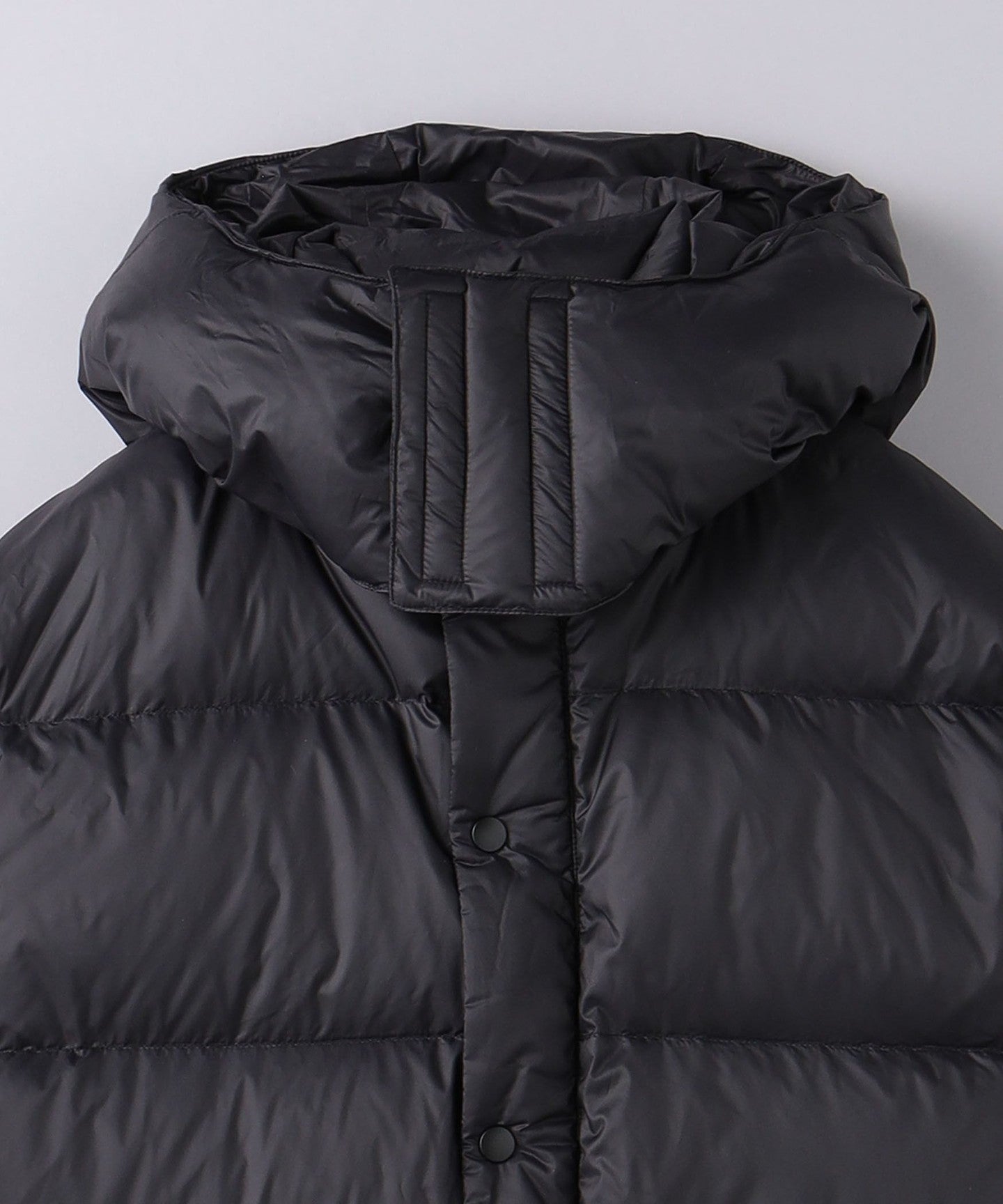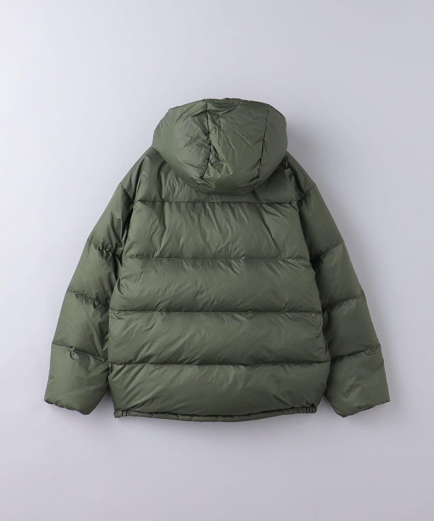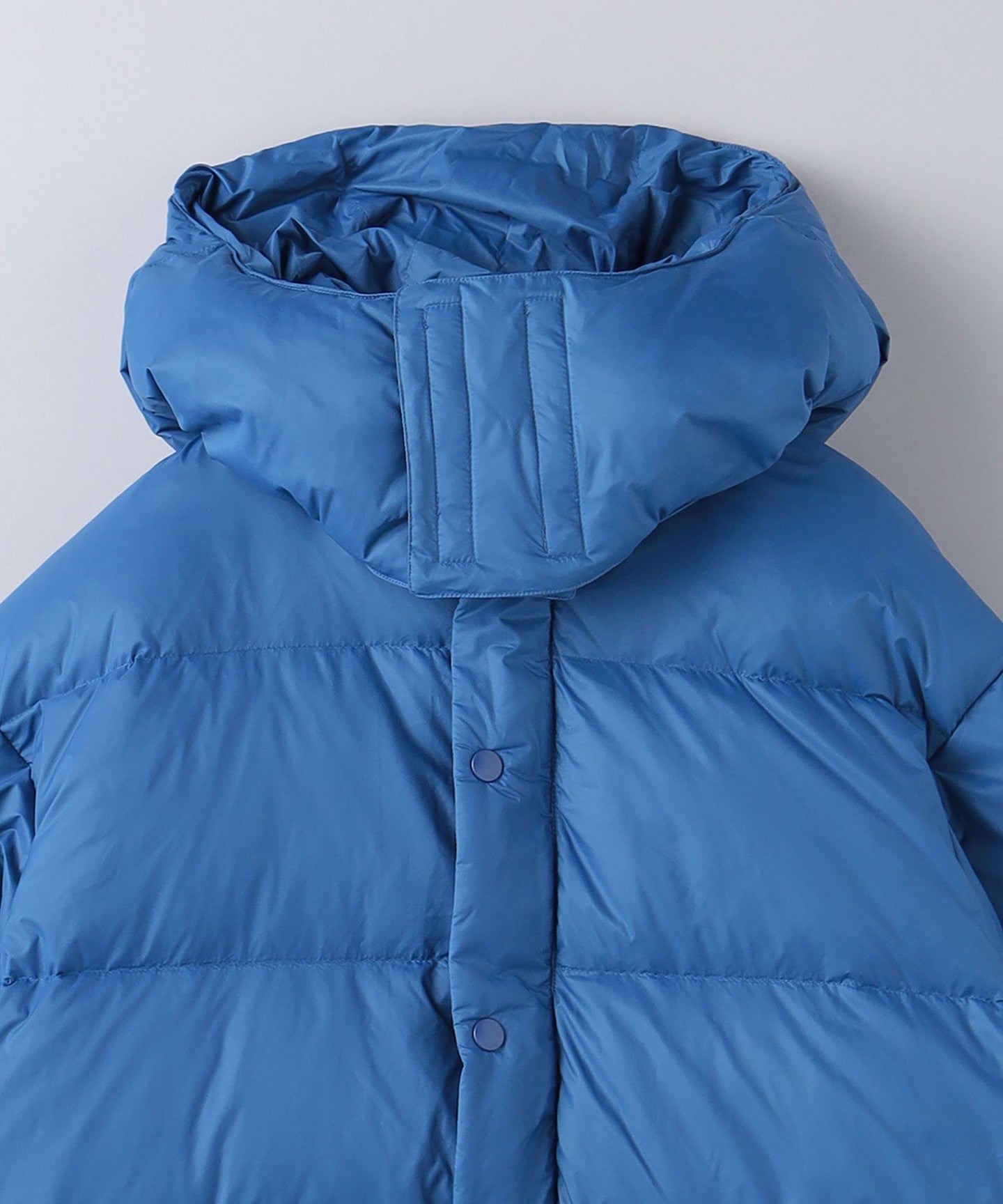 This down jacket features a moderate length and a relaxed, rounded silhouette.