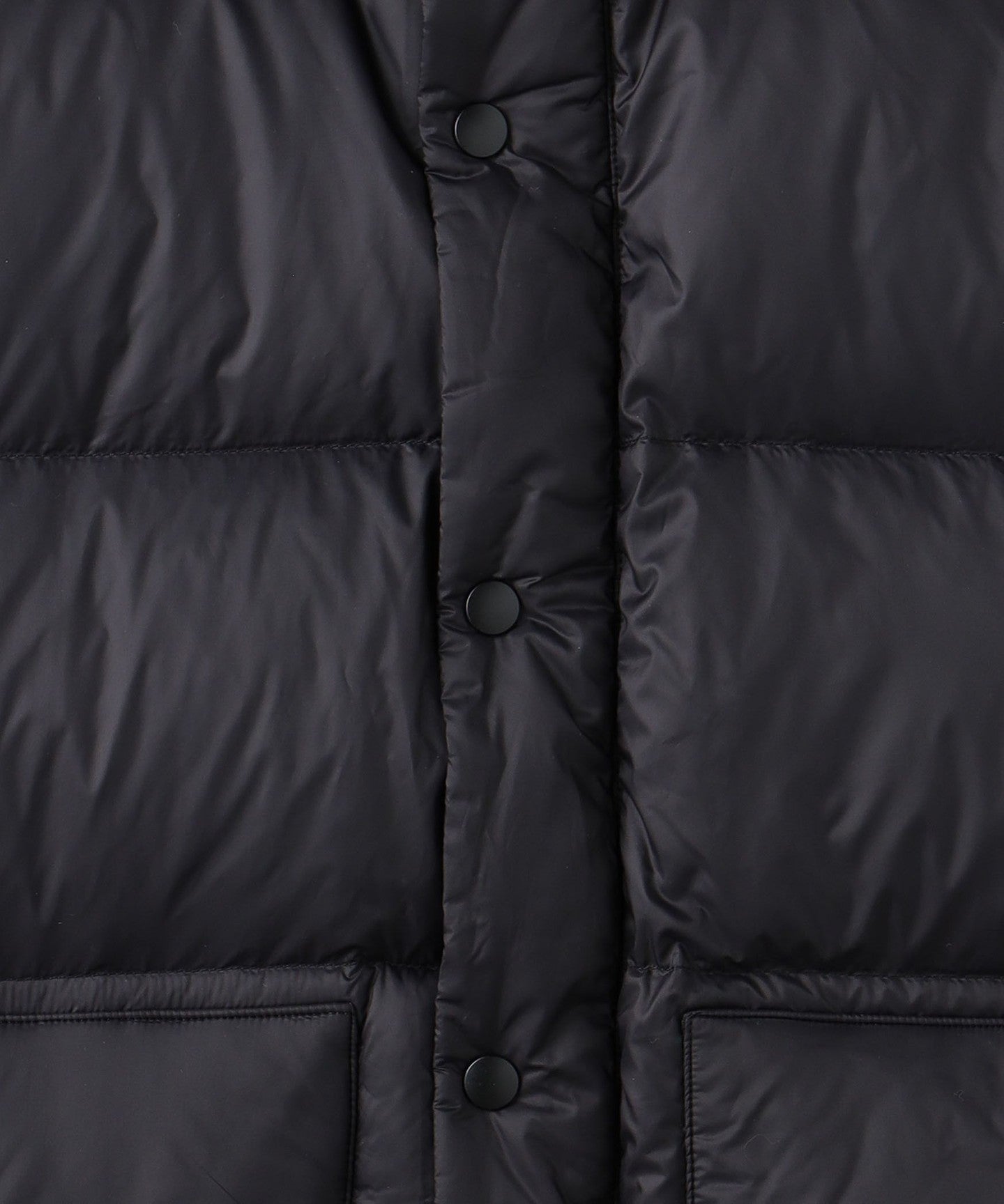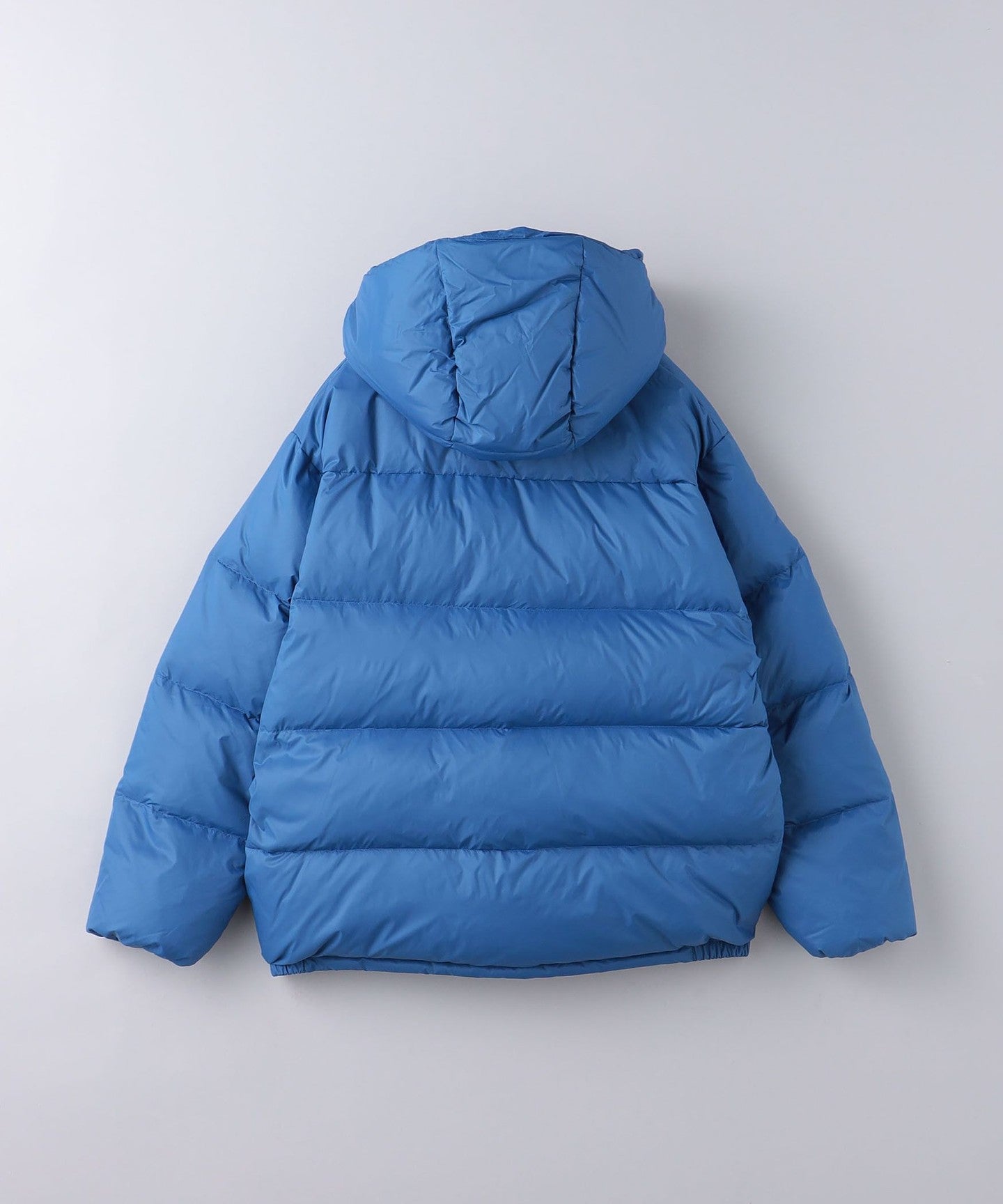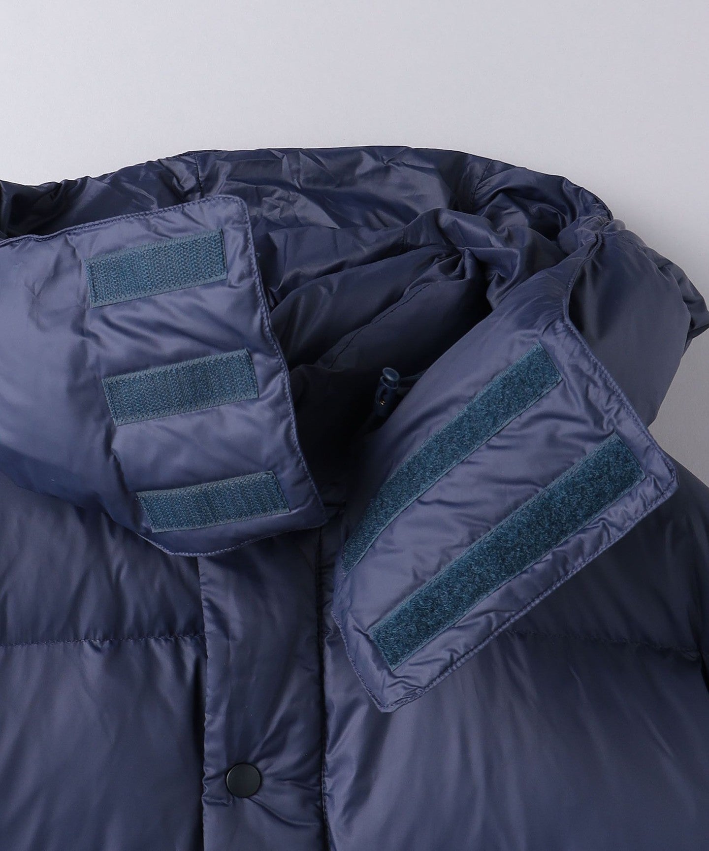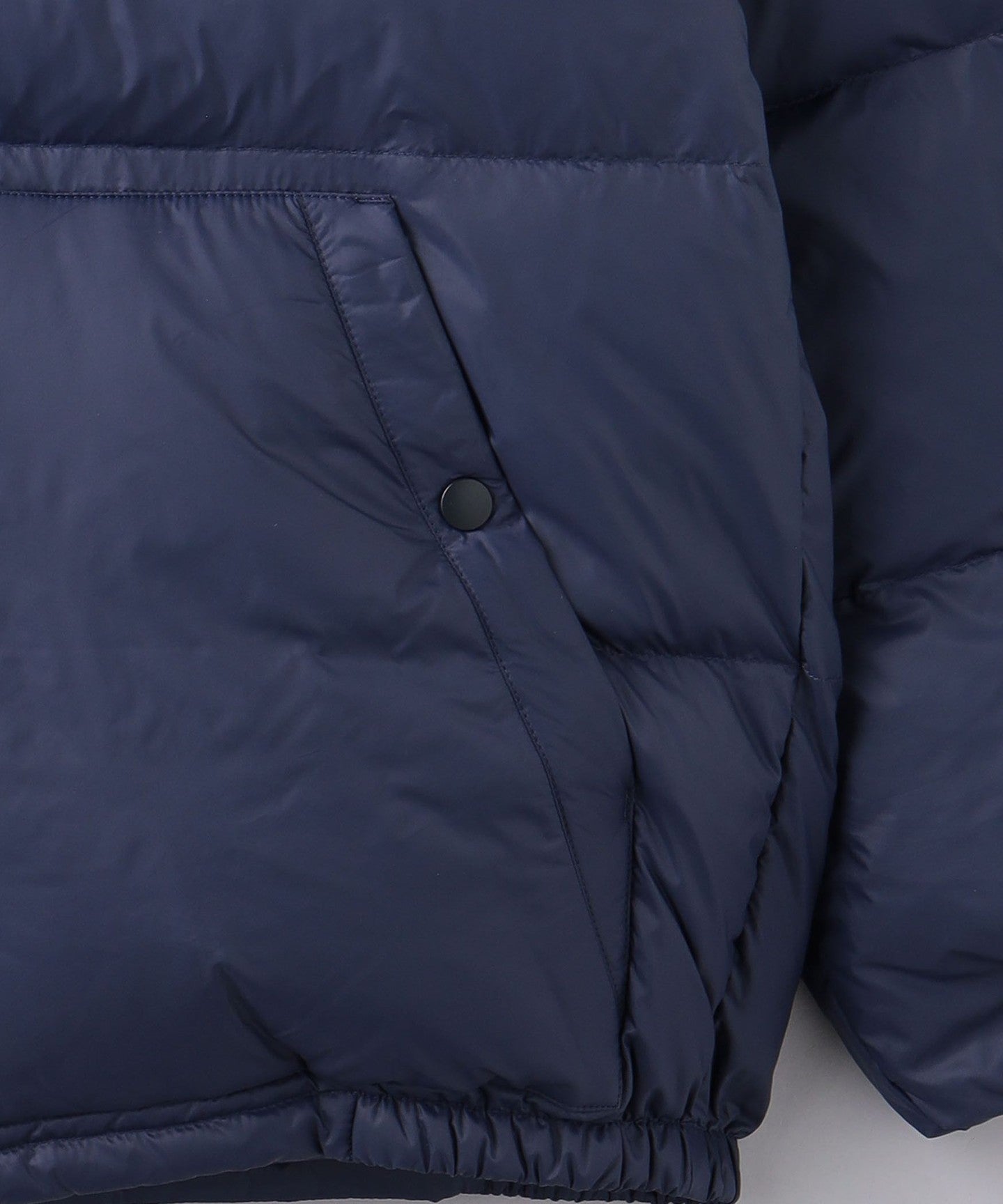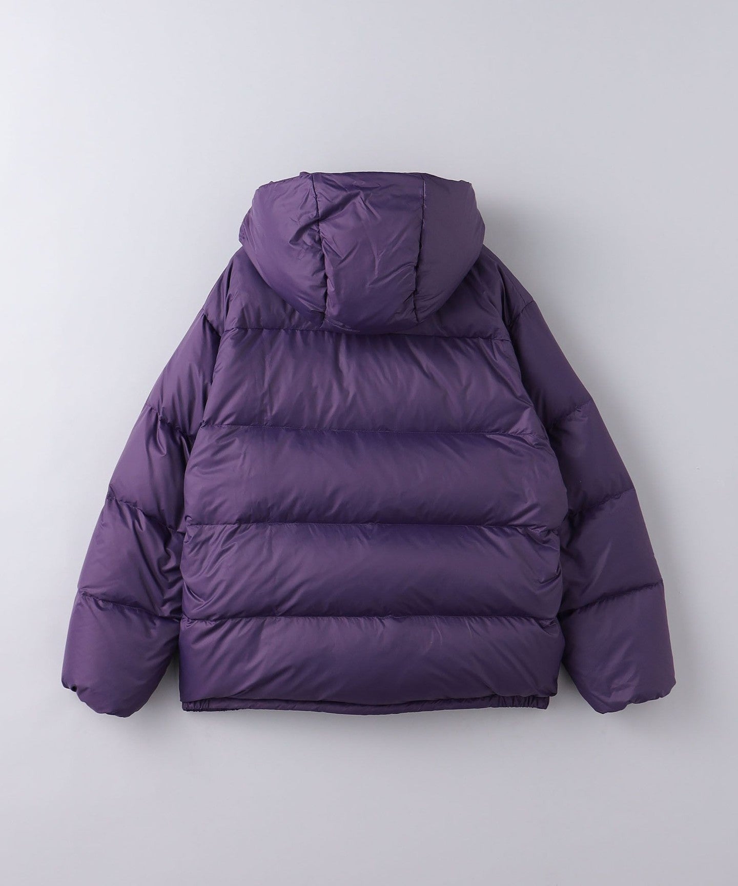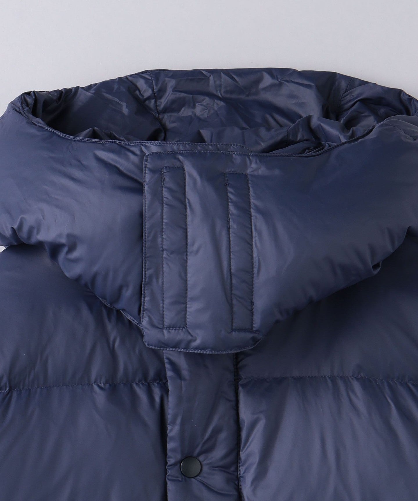 This down jacket features a moderate length and a relaxed, rounded silhouette.