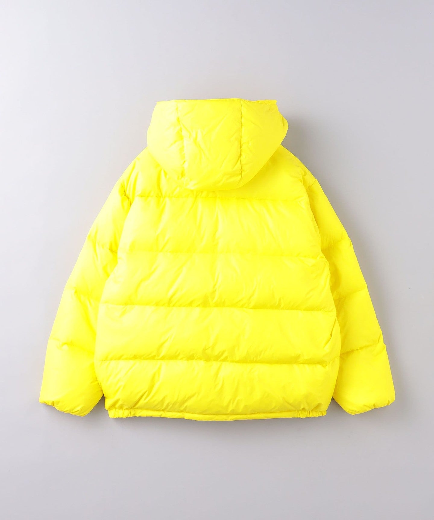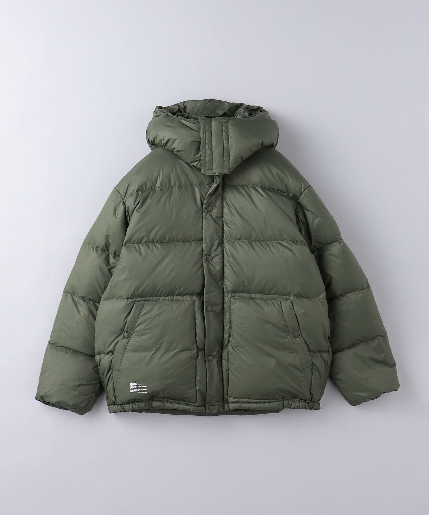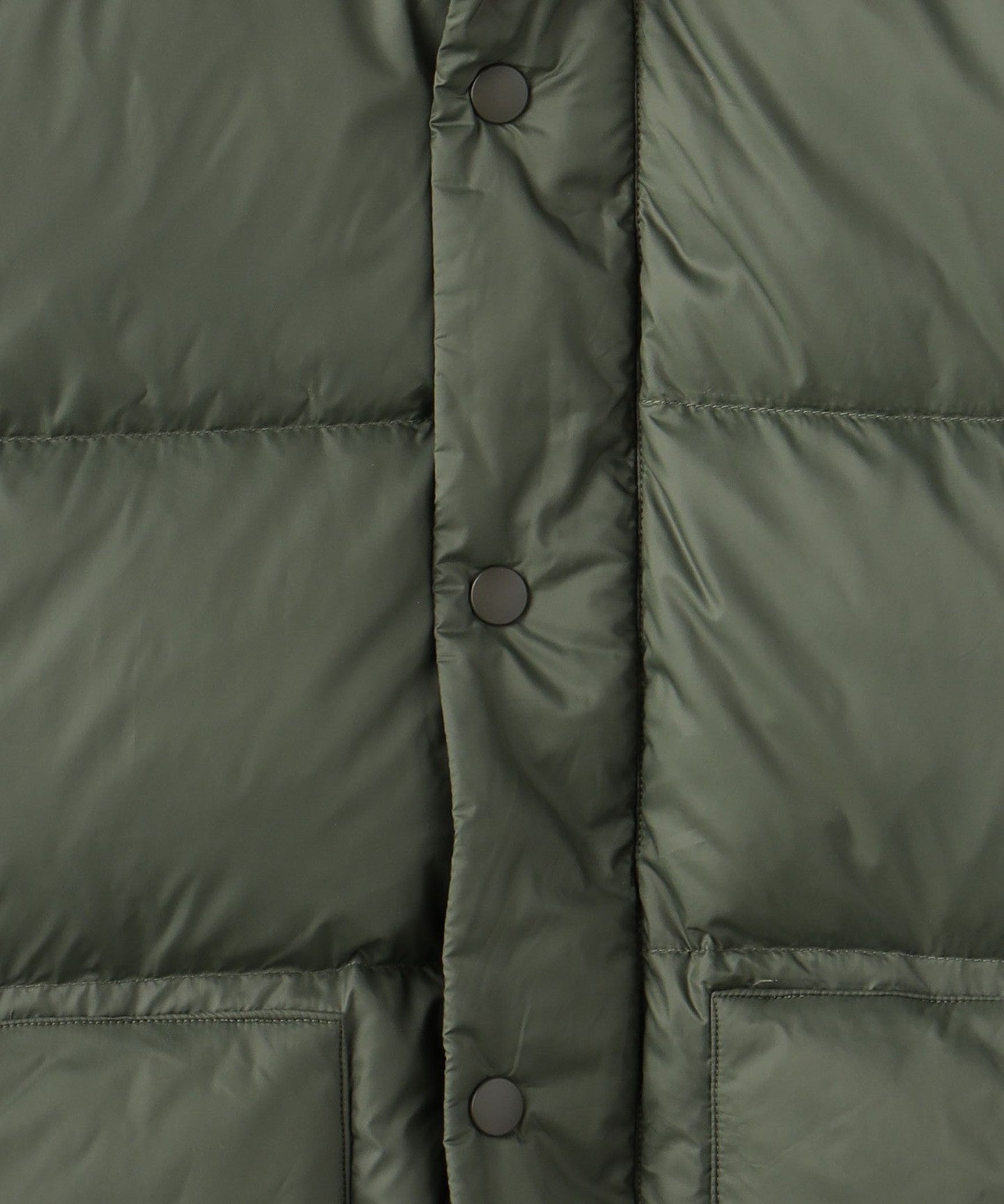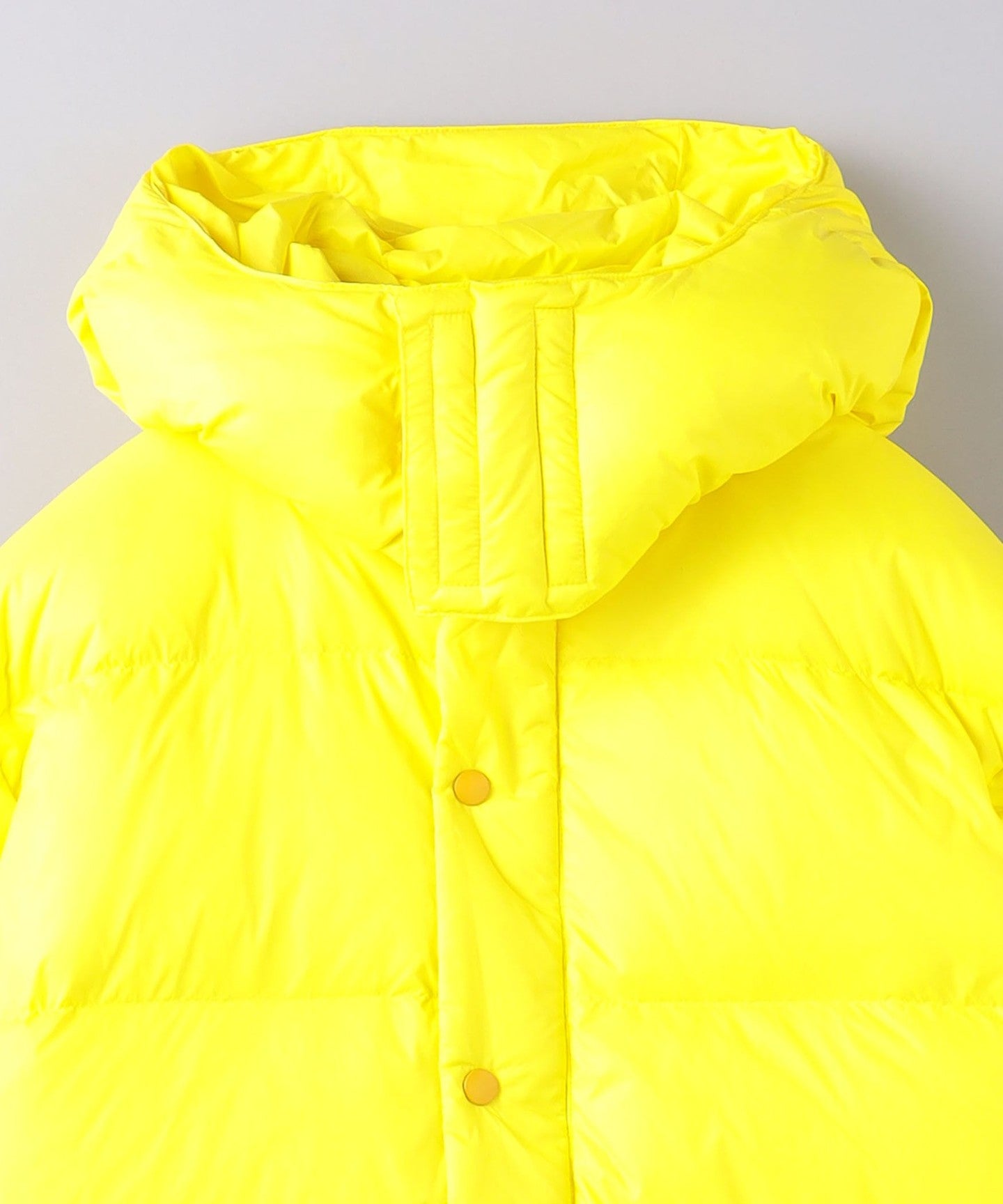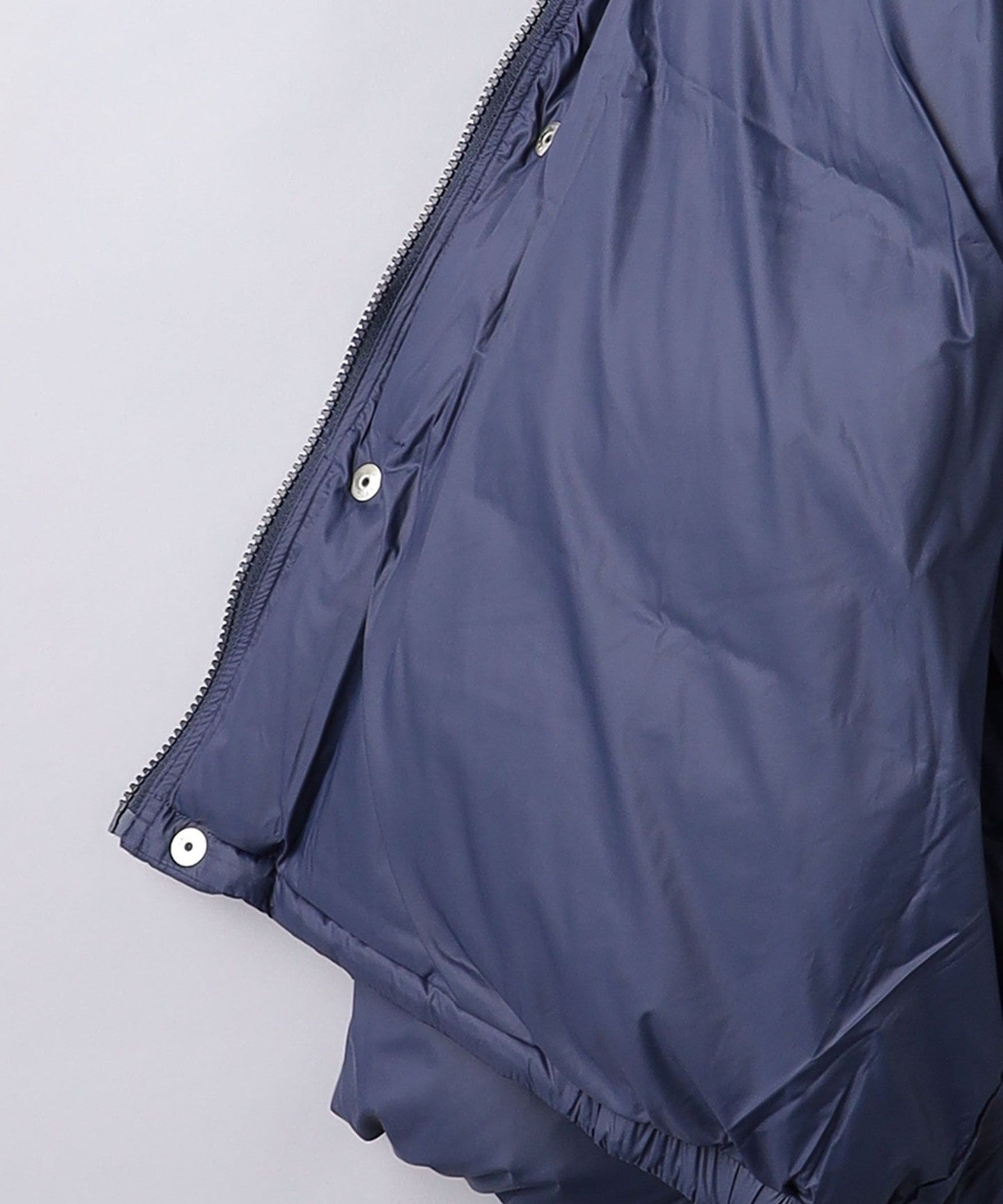 This down jacket features a moderate length and a relaxed, rounded silhouette.