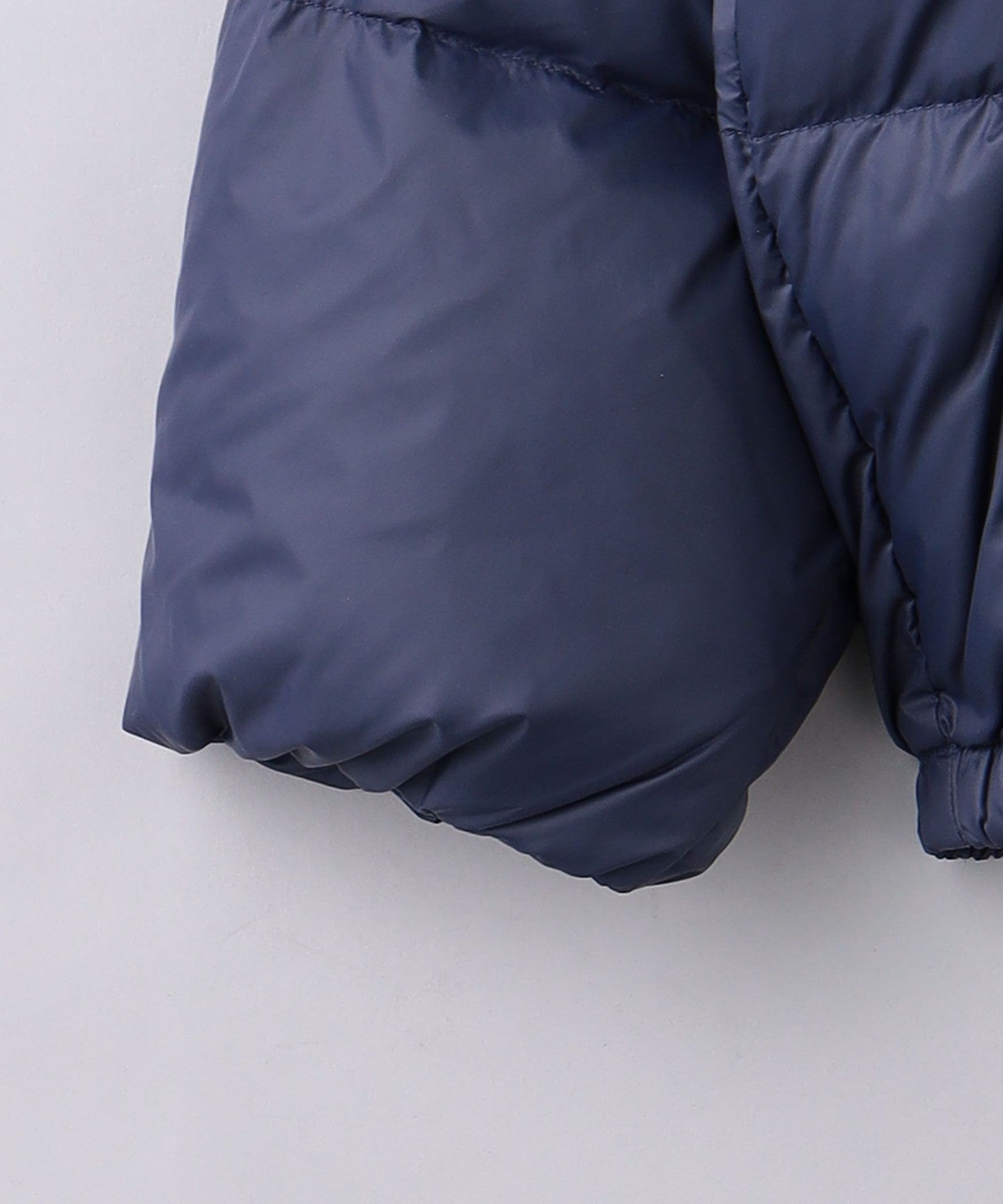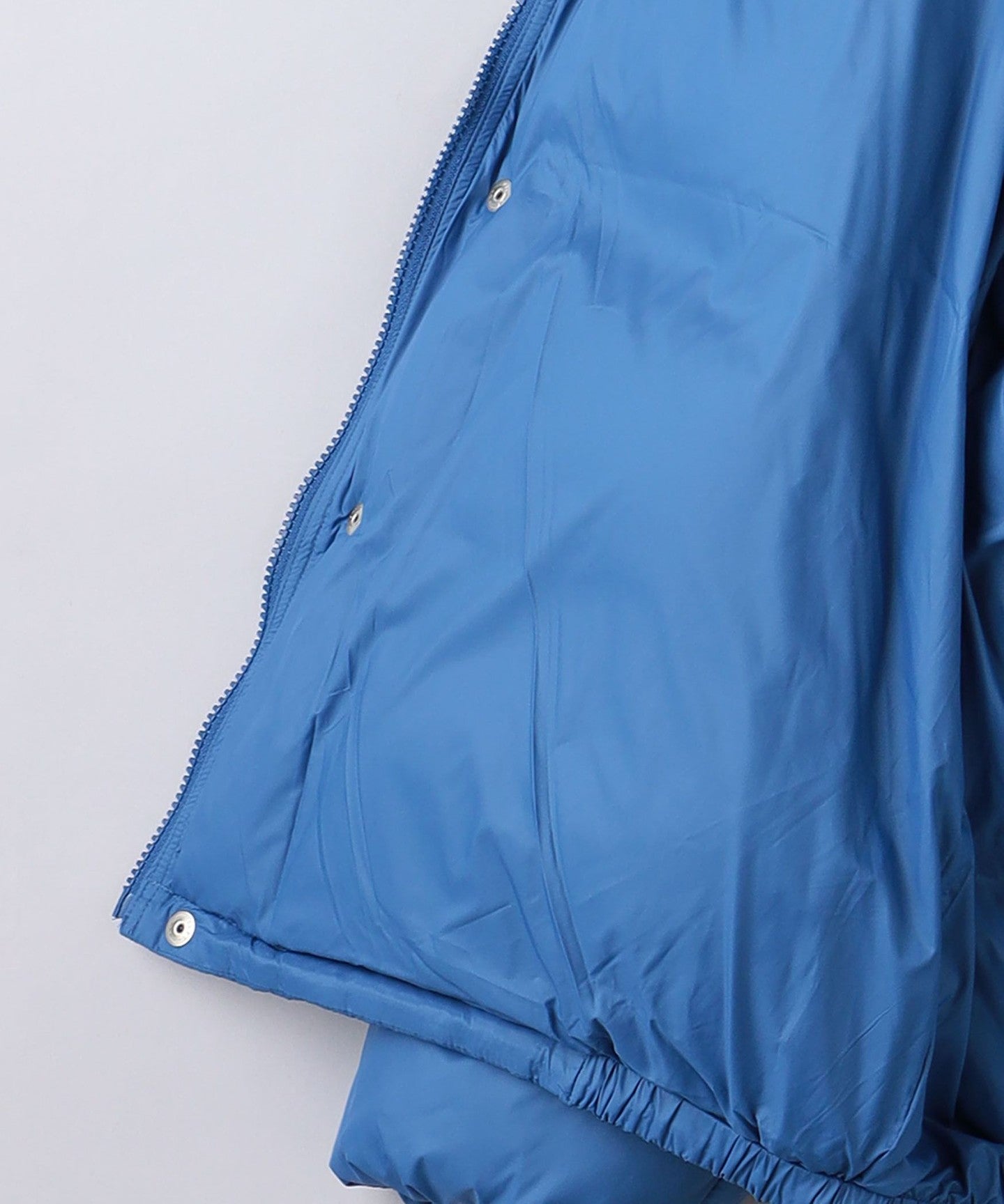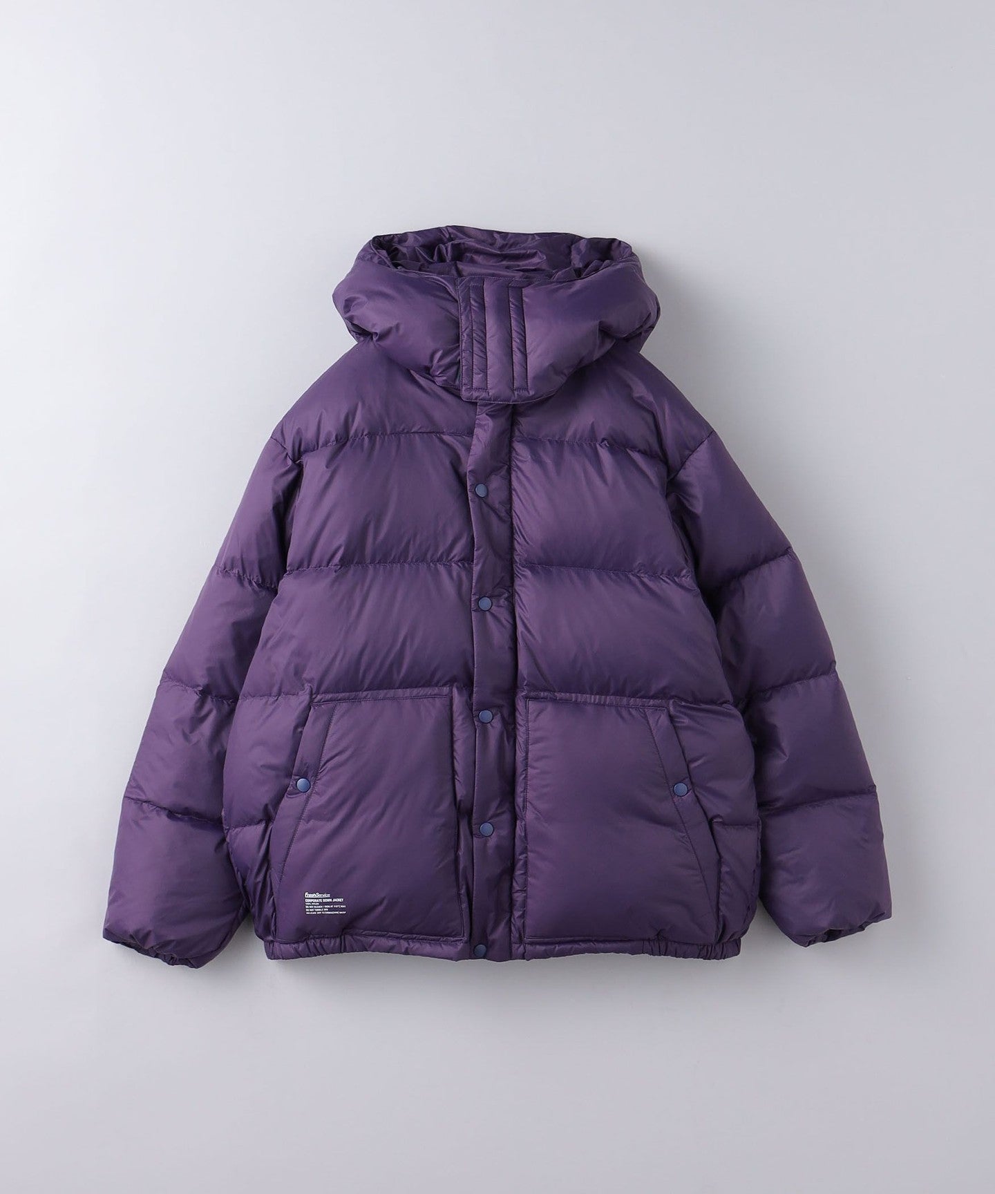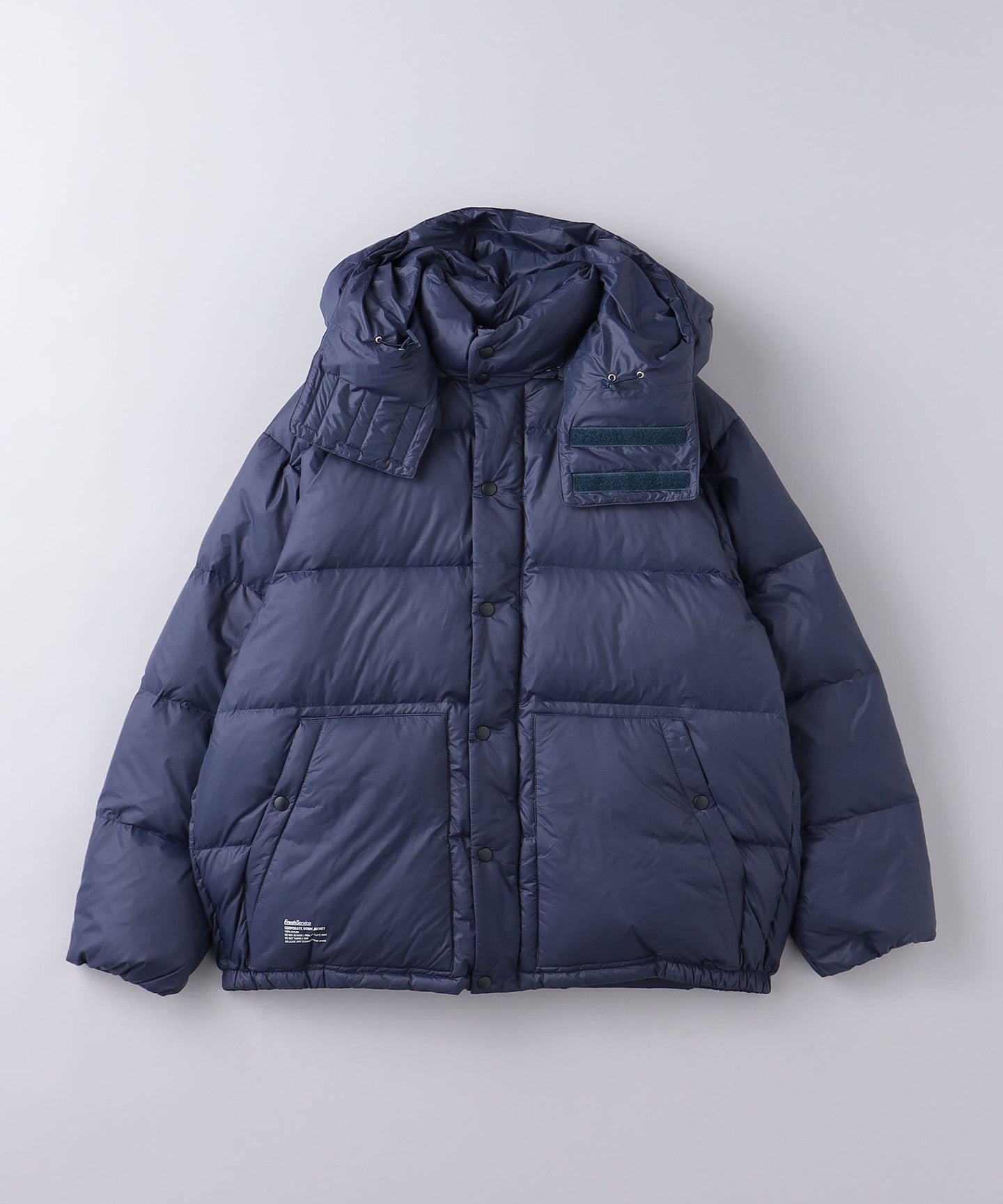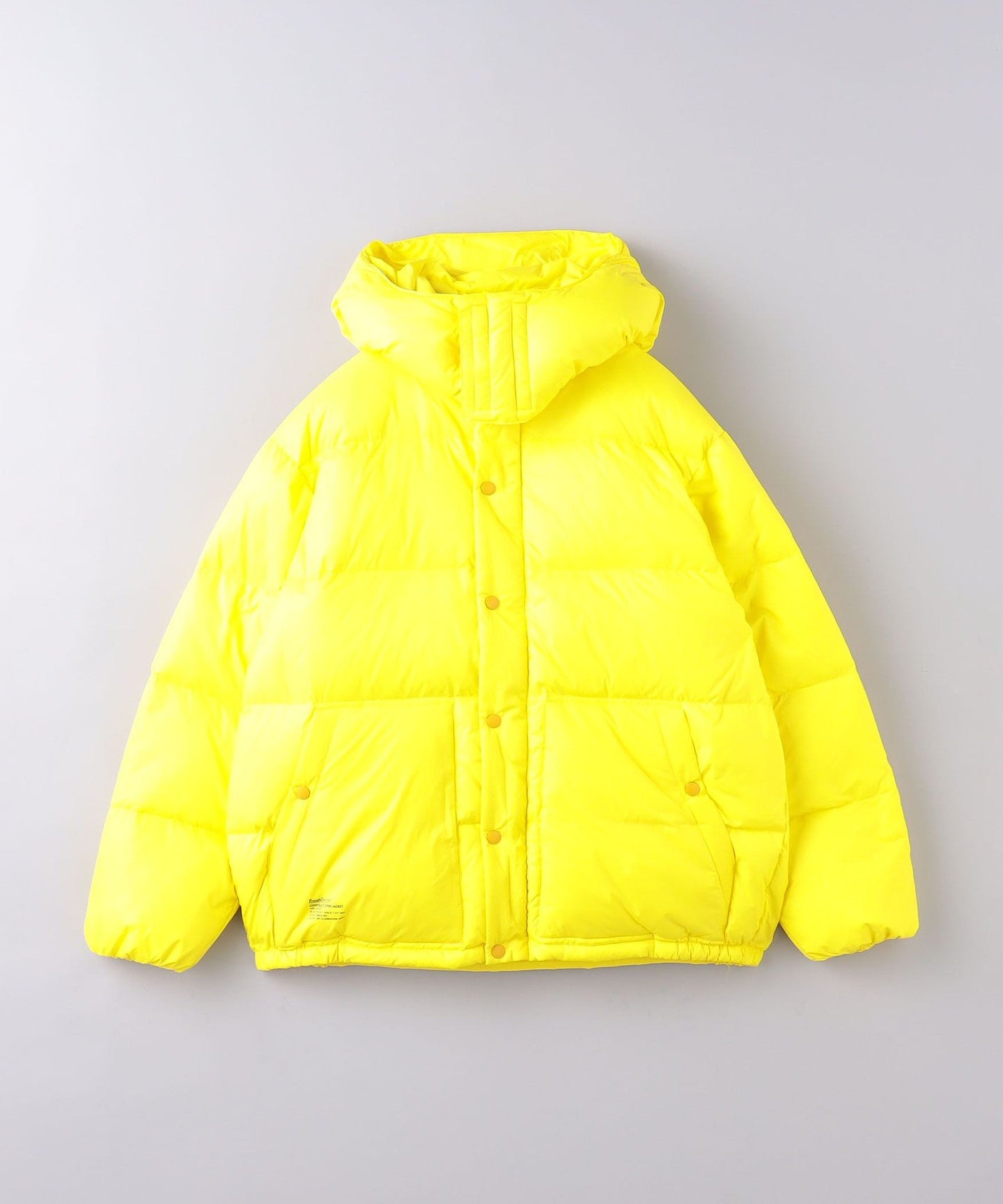 This down jacket features a moderate length and a relaxed, rounded silhouette.