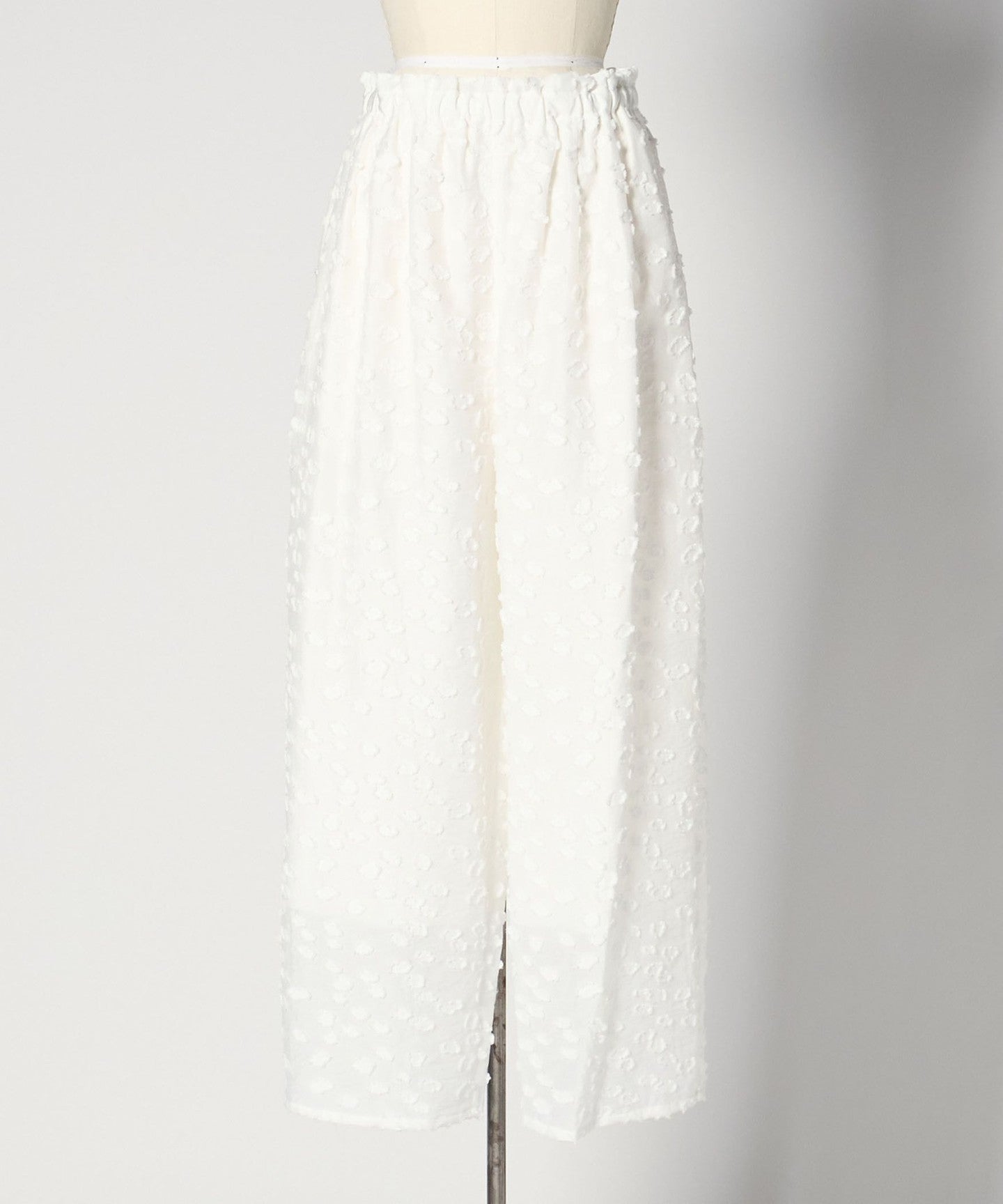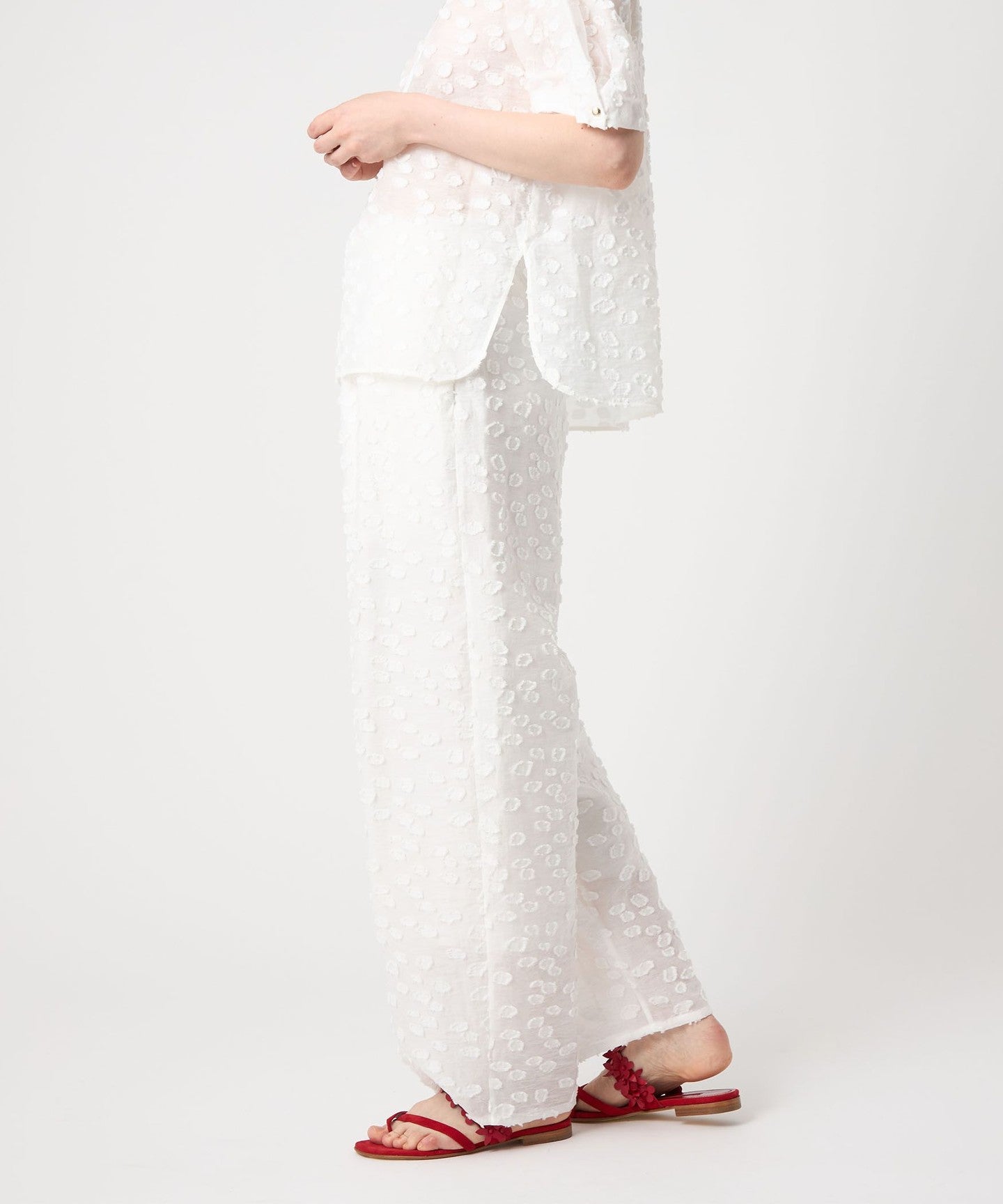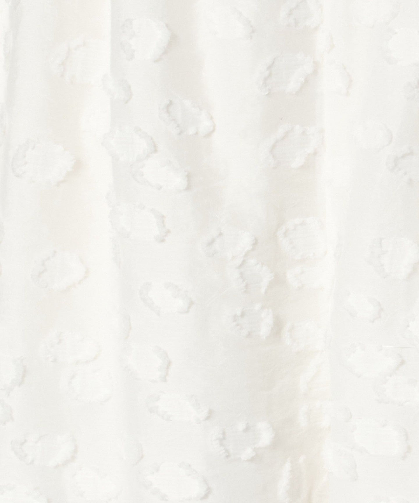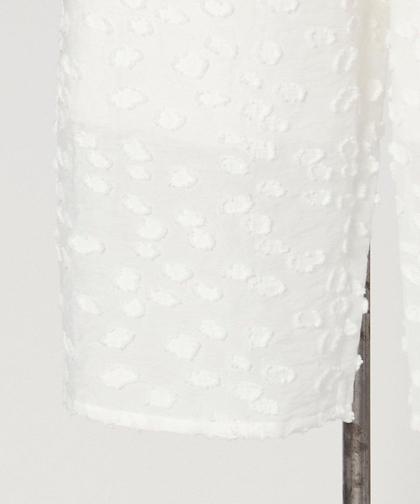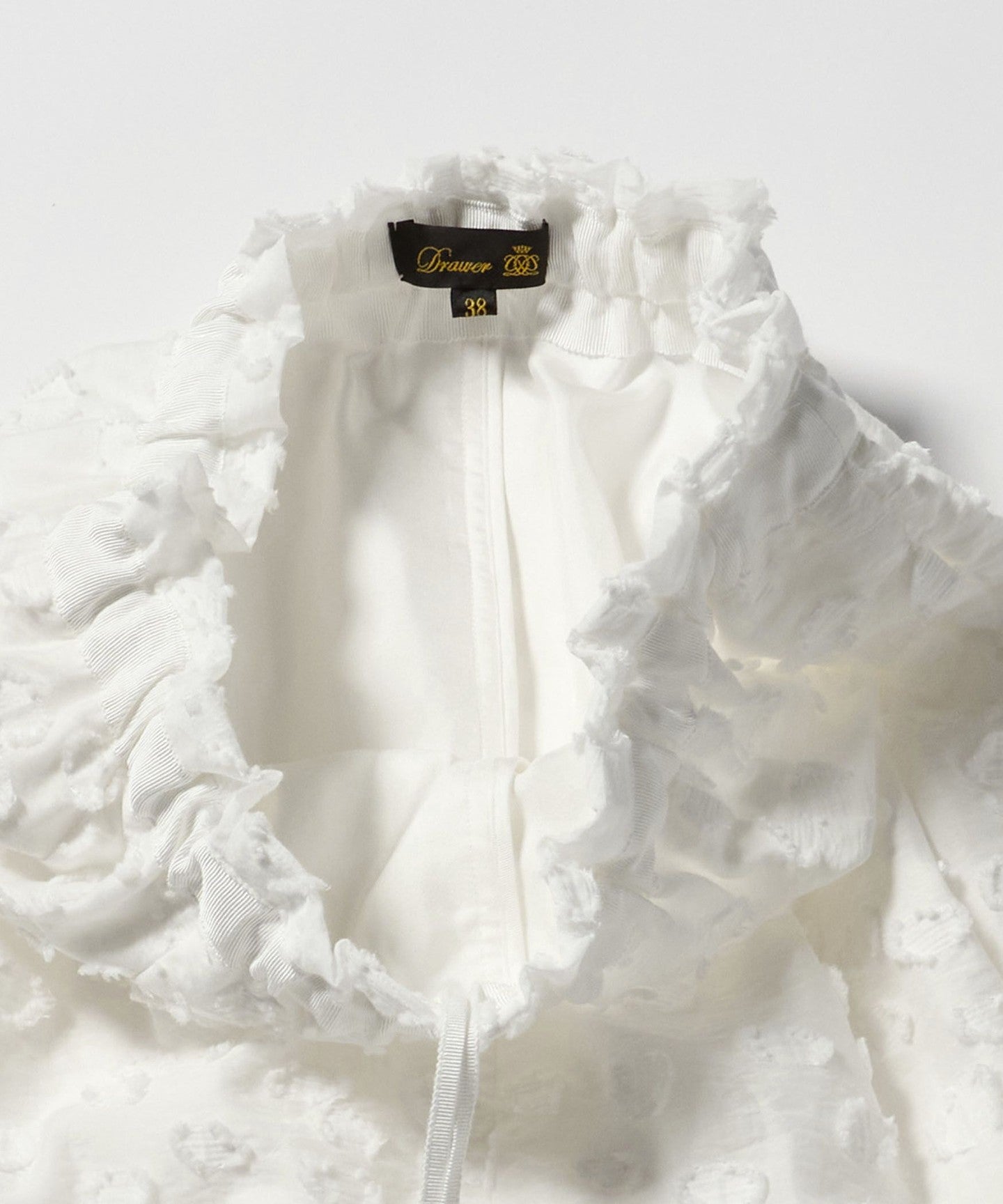 An original material with a sheer base, botanical pattern shadow jacquard and deformed dot cut jacquard.