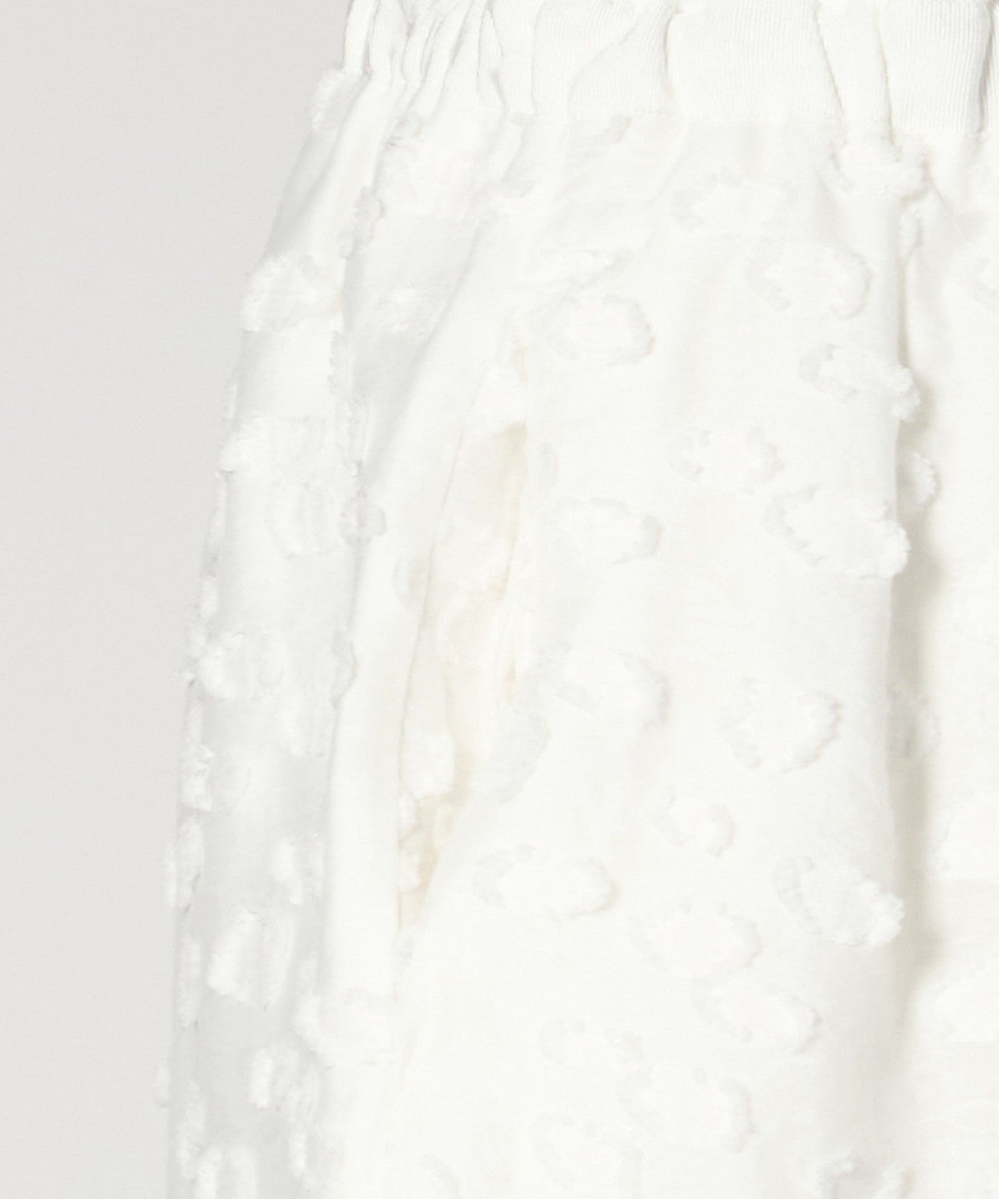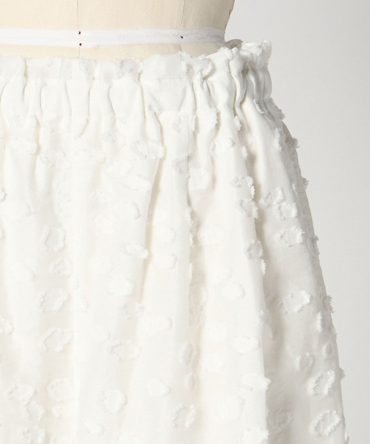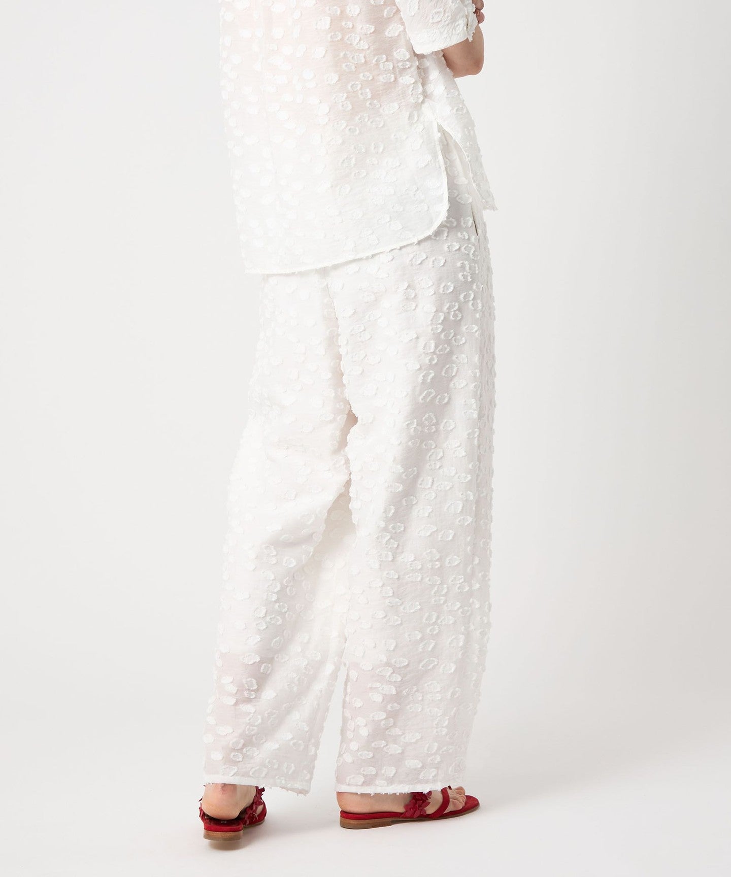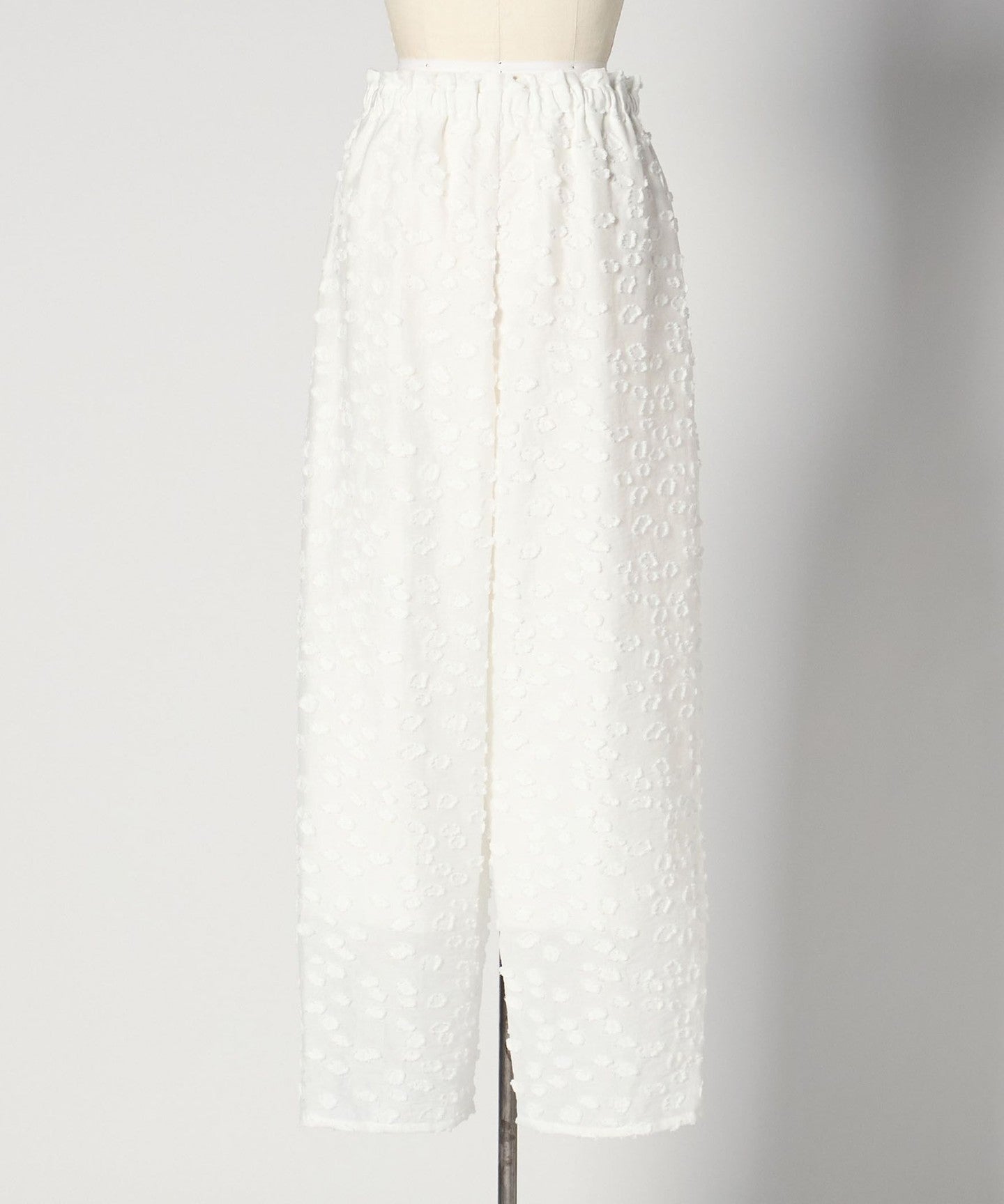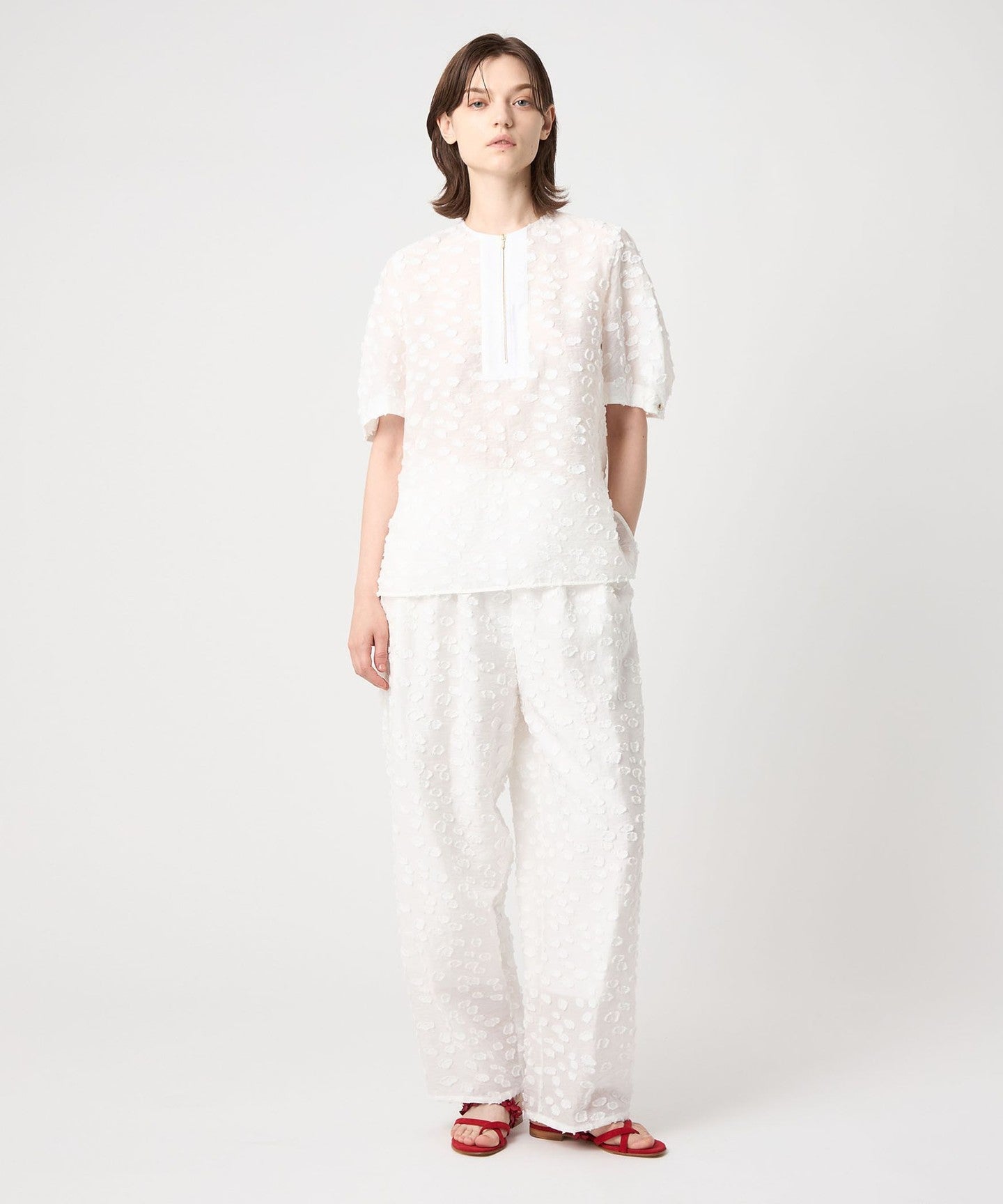 An original material with a sheer base, botanical pattern shadow jacquard and deformed dot cut jacquard.