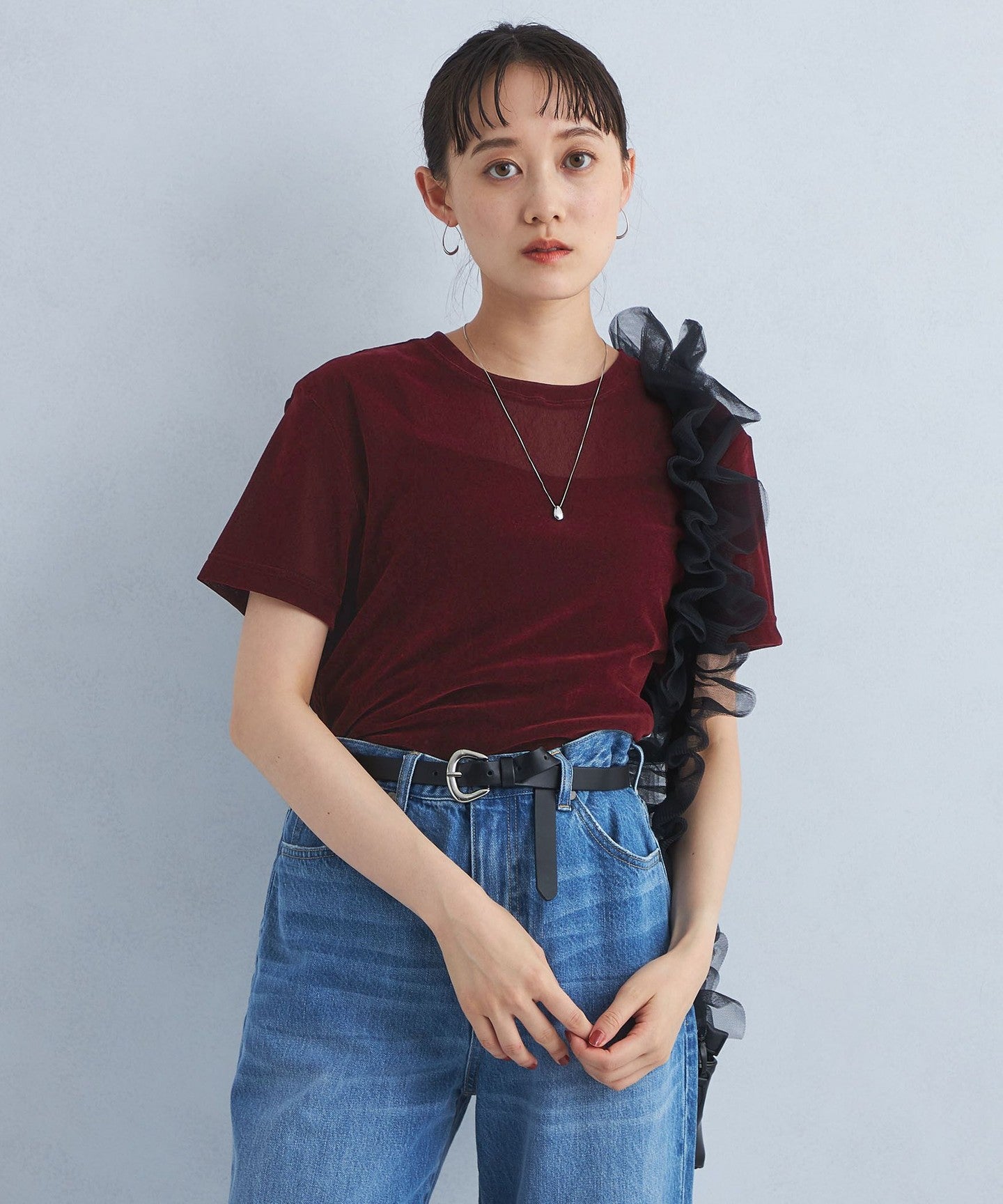 A sheer T-shirt made of flocked material that exudes a seasonal vibe