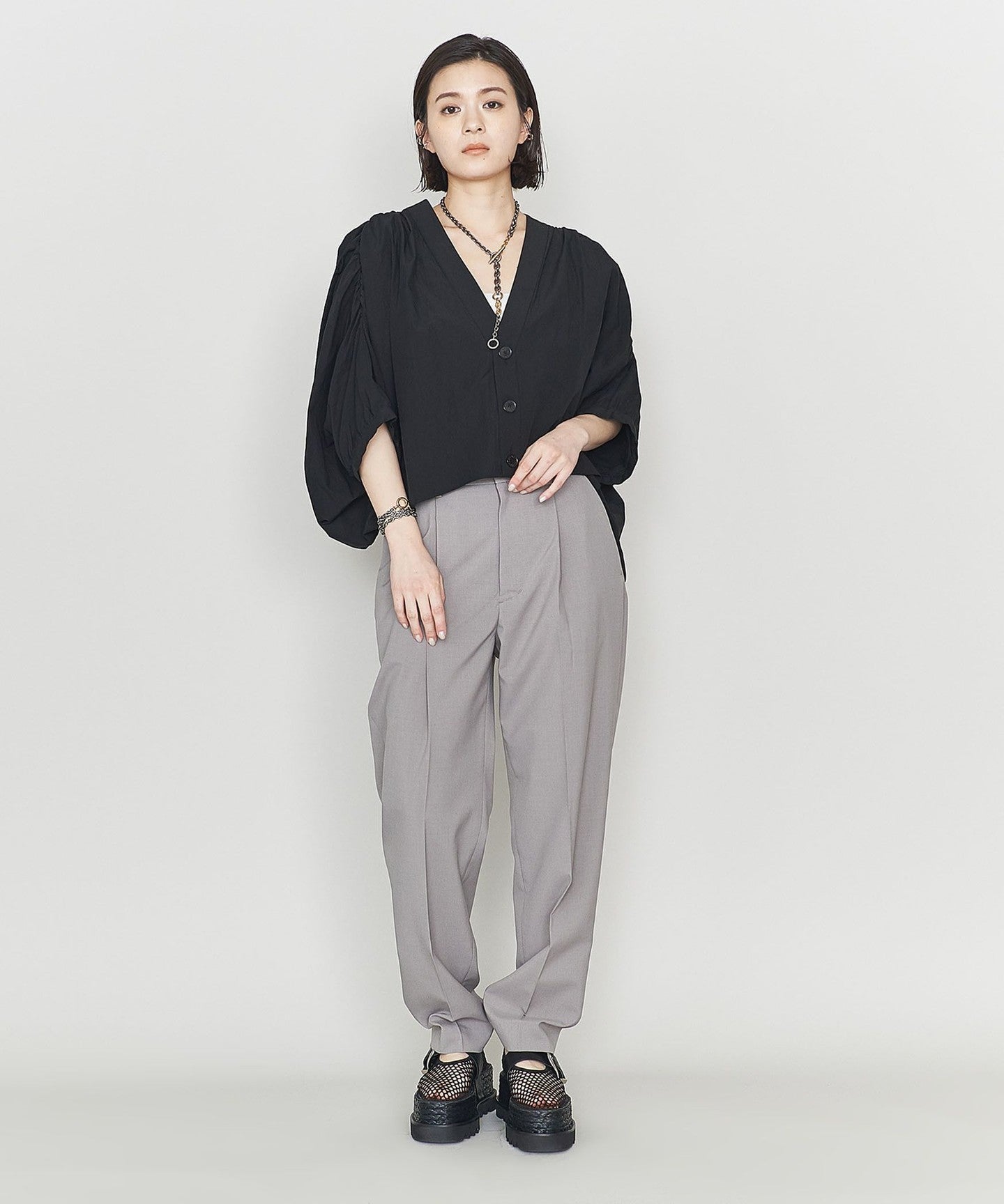 SHOULDERThe generous gathers create a rounded look. BAND This piece has a long silhouette that gives it a glamorous impression.