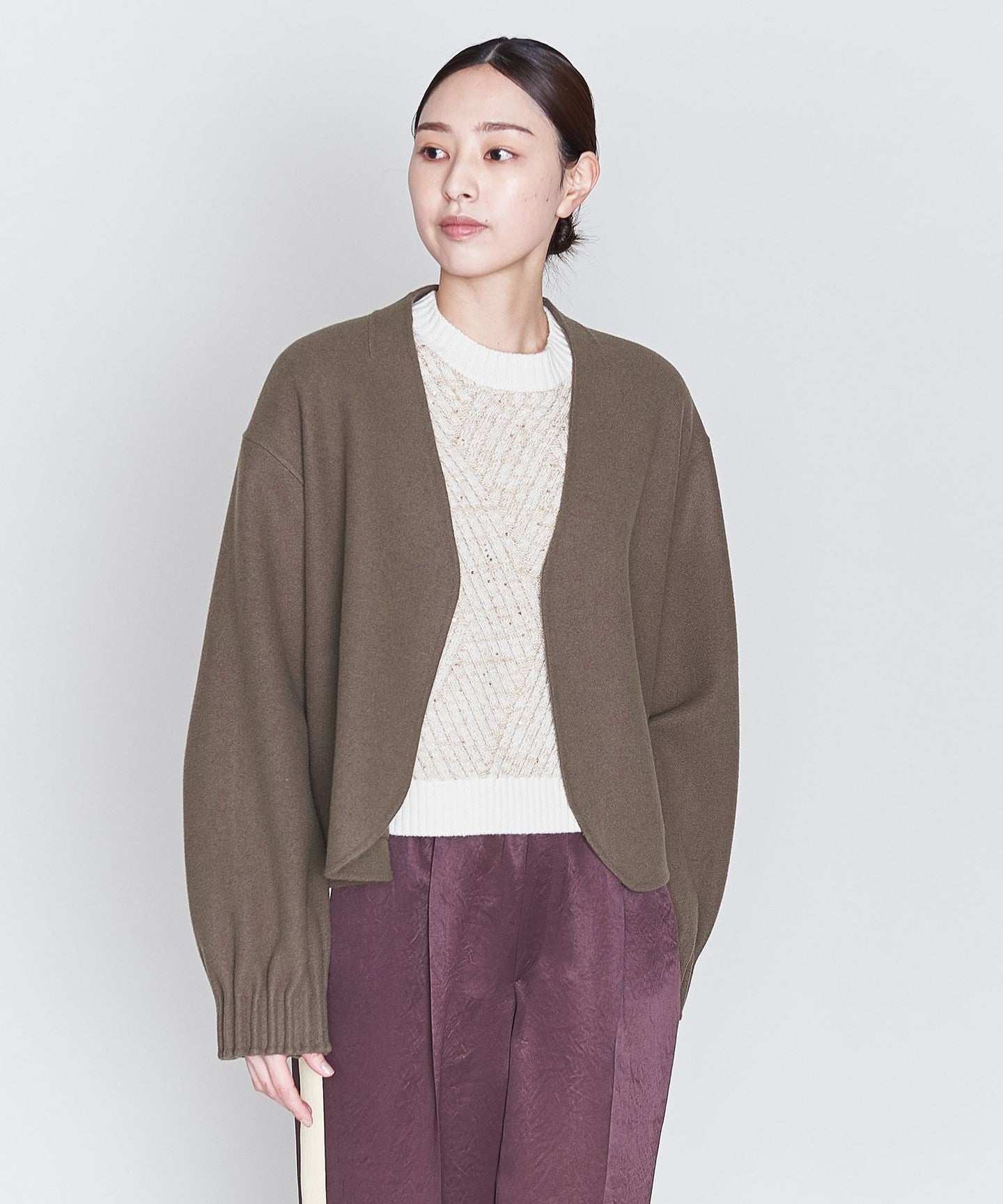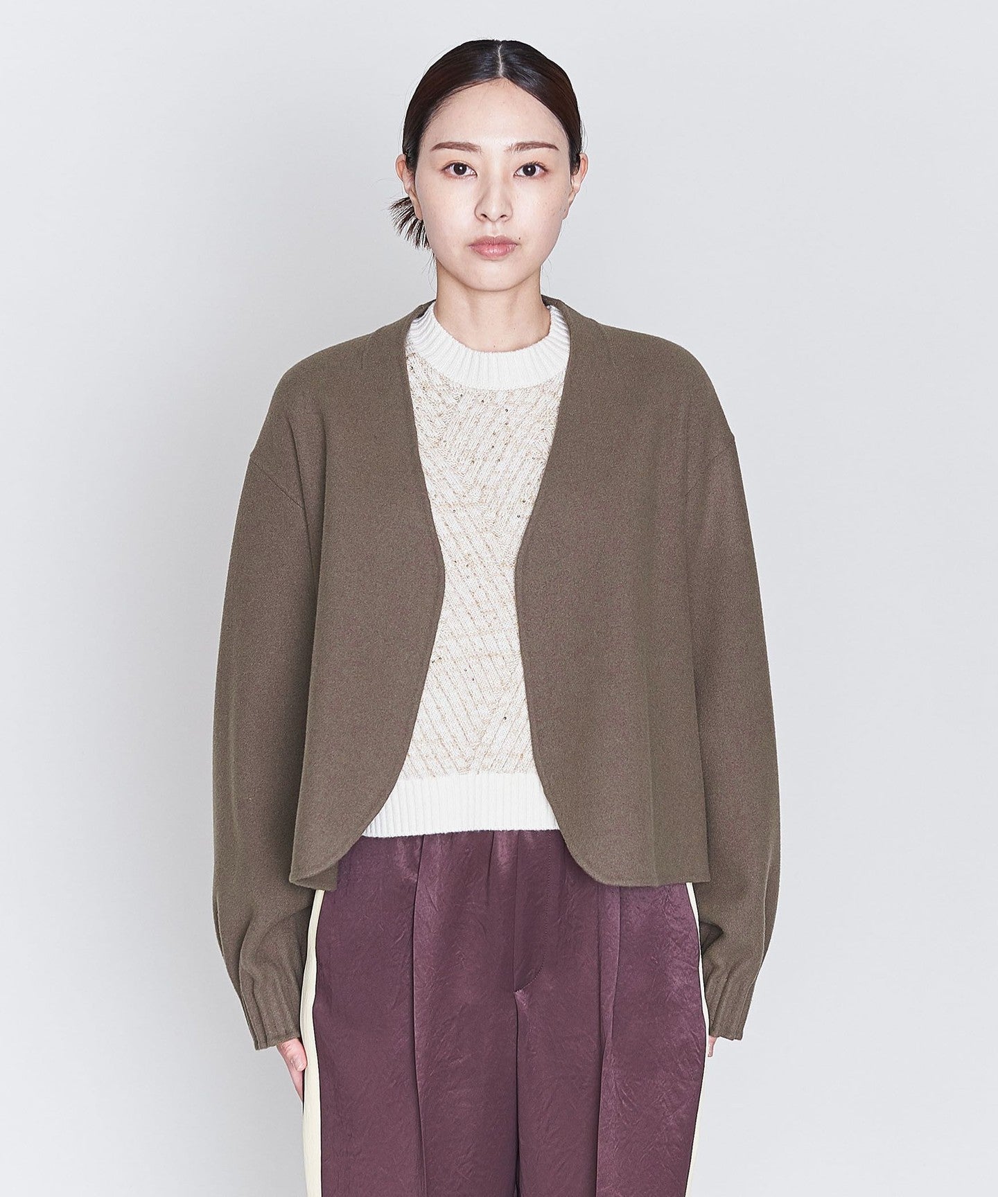 This collarless coat has elastic in the sleeves and hem, creating pleat-like folds for a soft look.