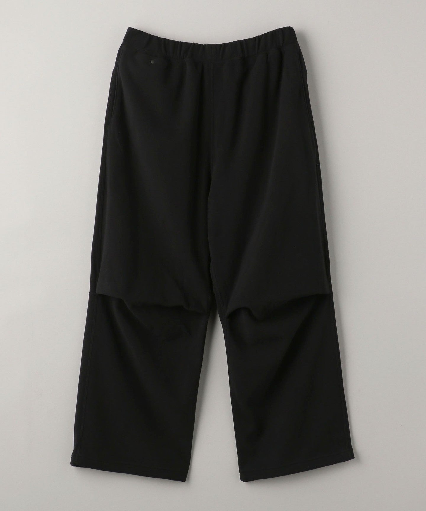 A three-dimensional wide straight silhouette with inner thigh gusset and knee tucks.