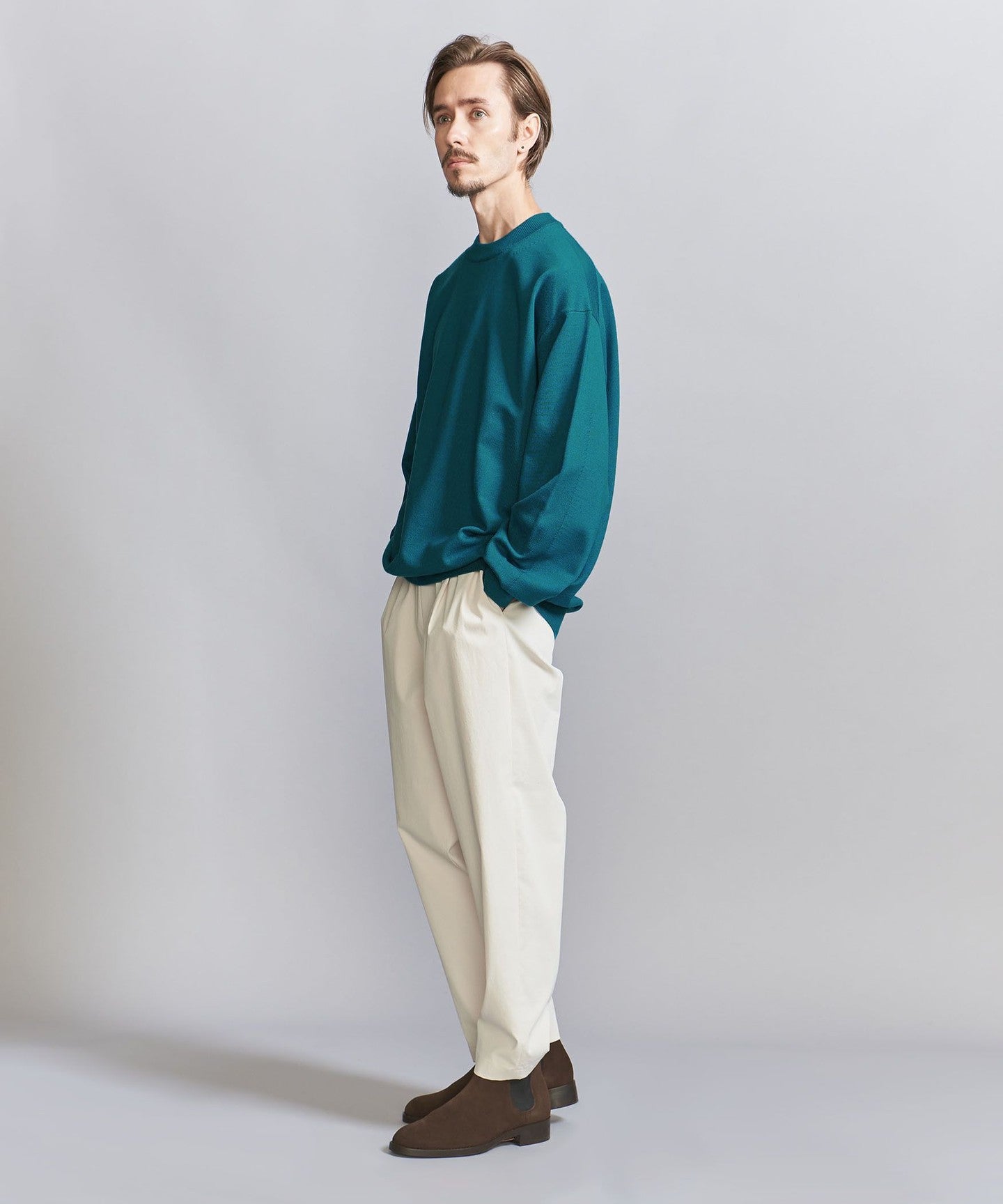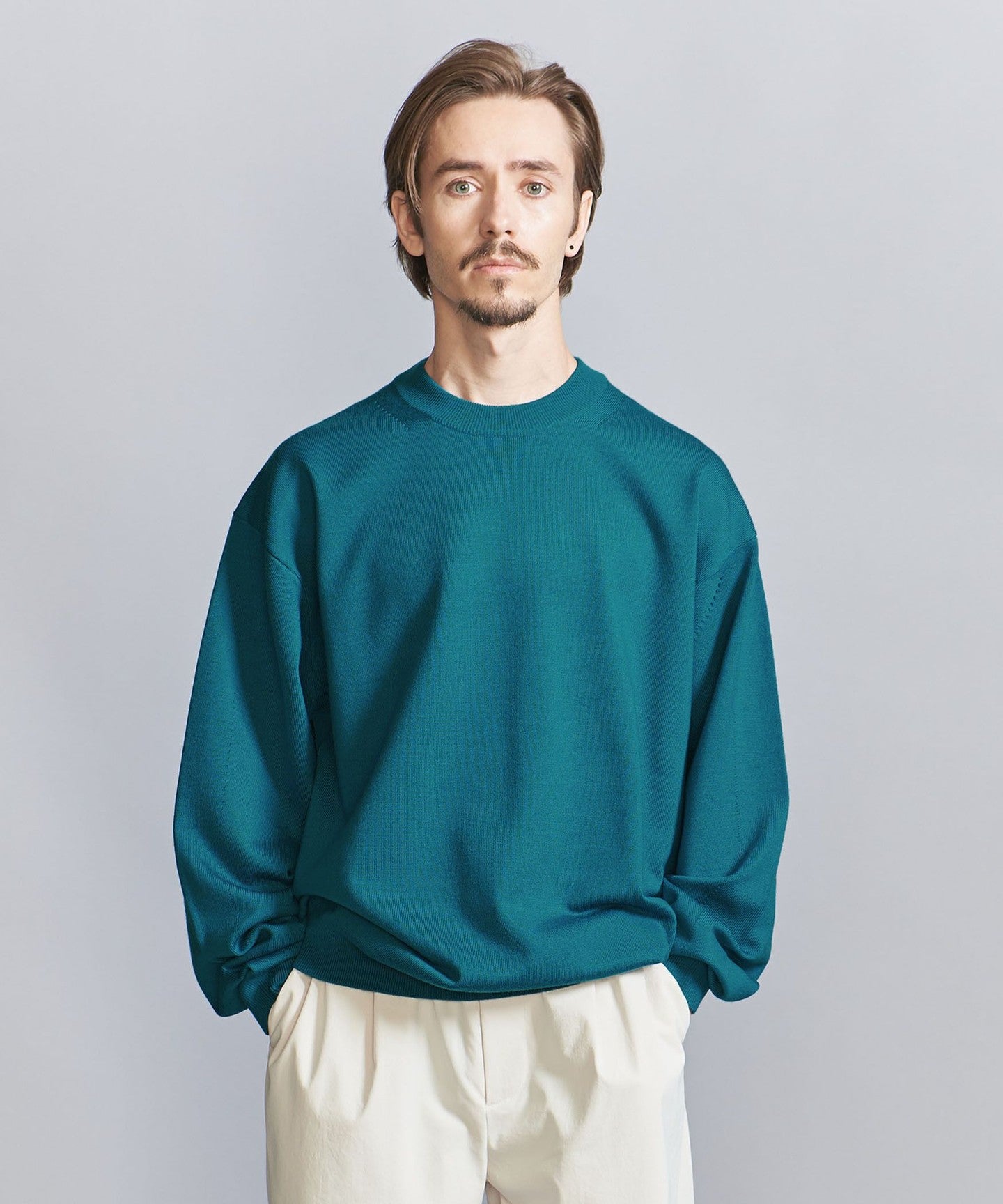 This top has a clean look that goes well with any type of pants, such as slacks, synthetic easy pants, or aged denim.