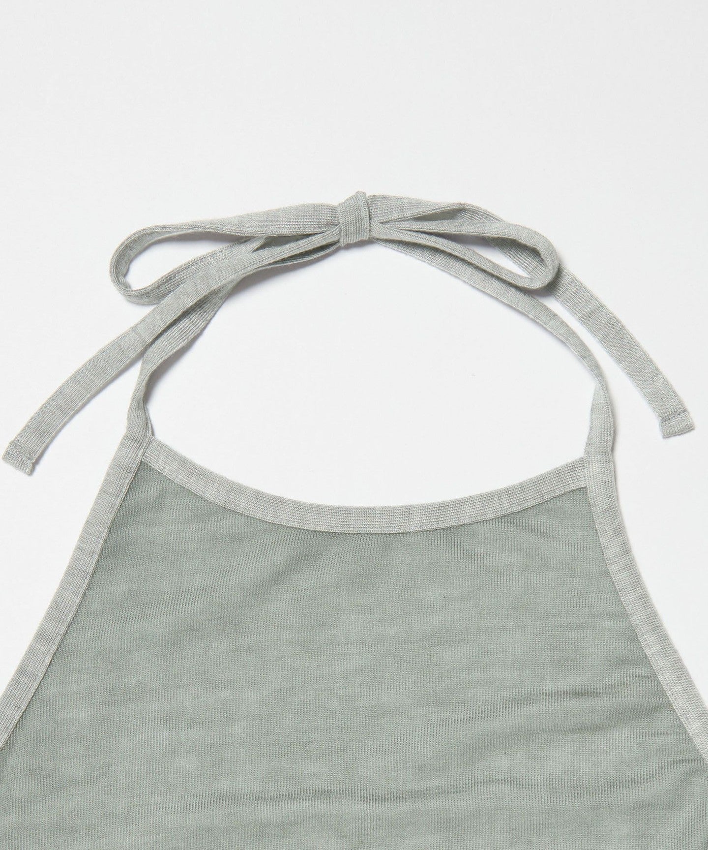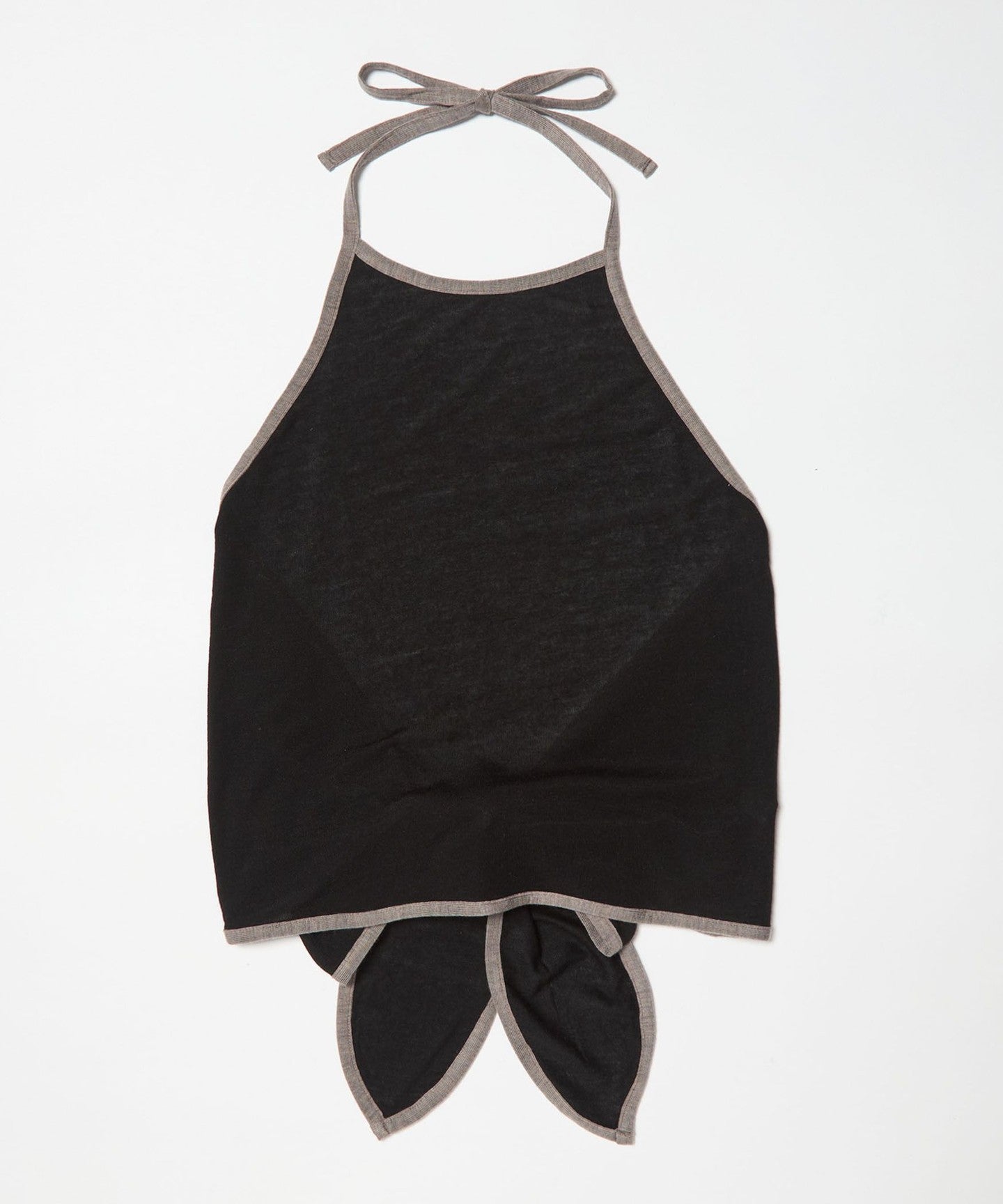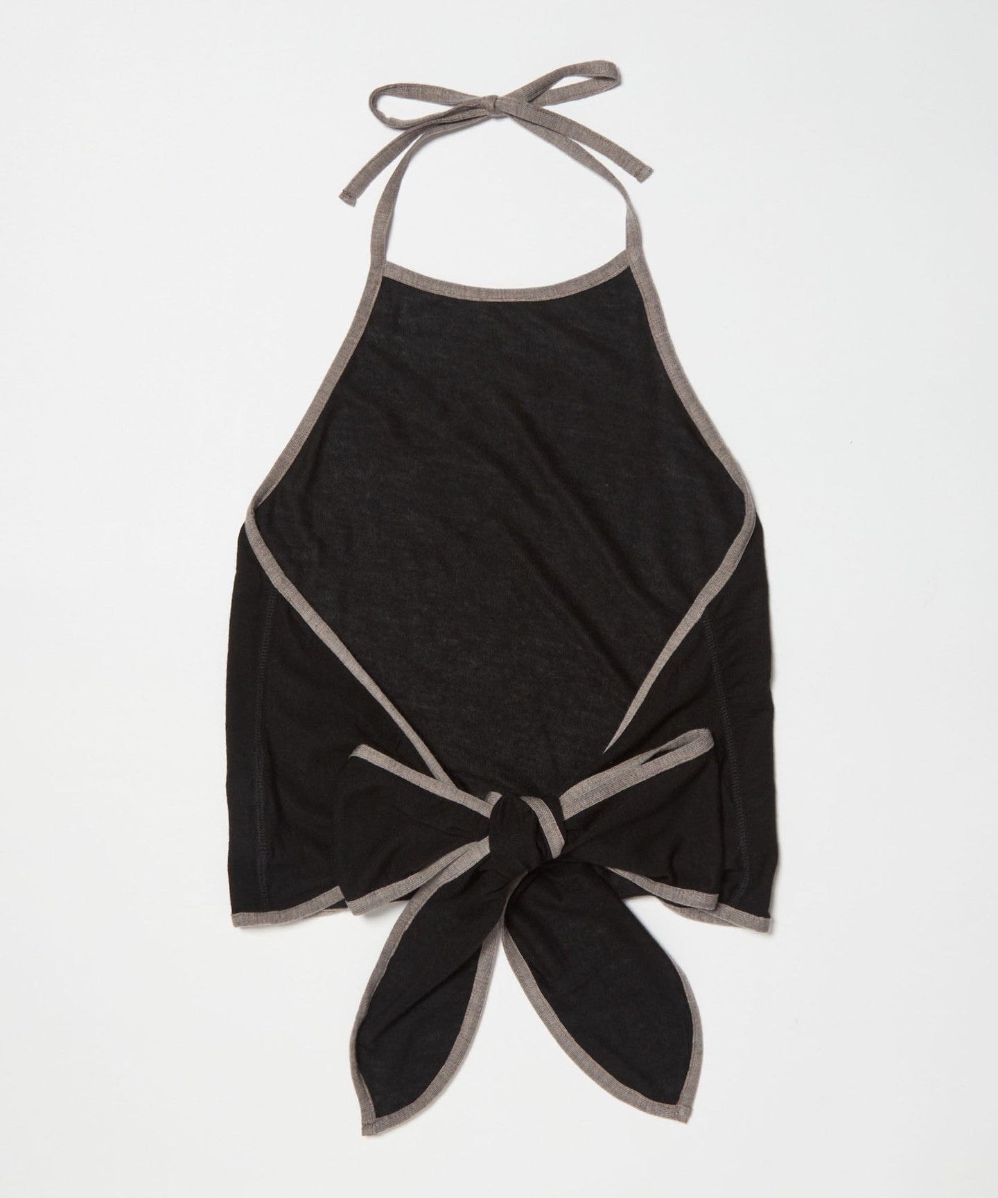 A halter neck cut-and-sew top that is worn by wrapping the body around the waist.