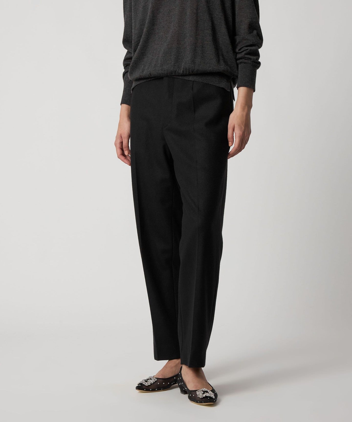These black pants have a no-tuck design and a clean silhouette from the crotch down, making them a basic piece to wear.