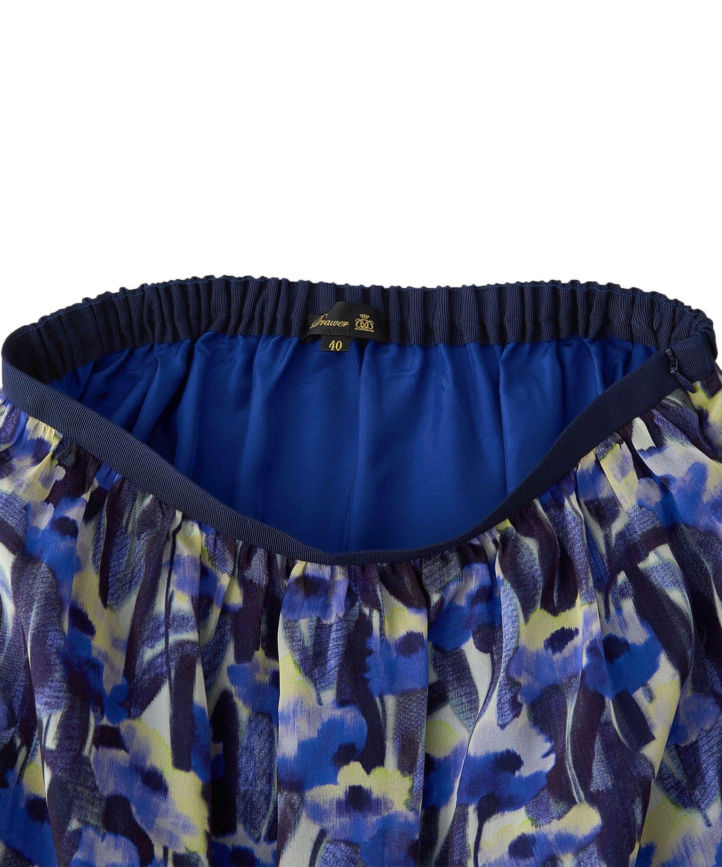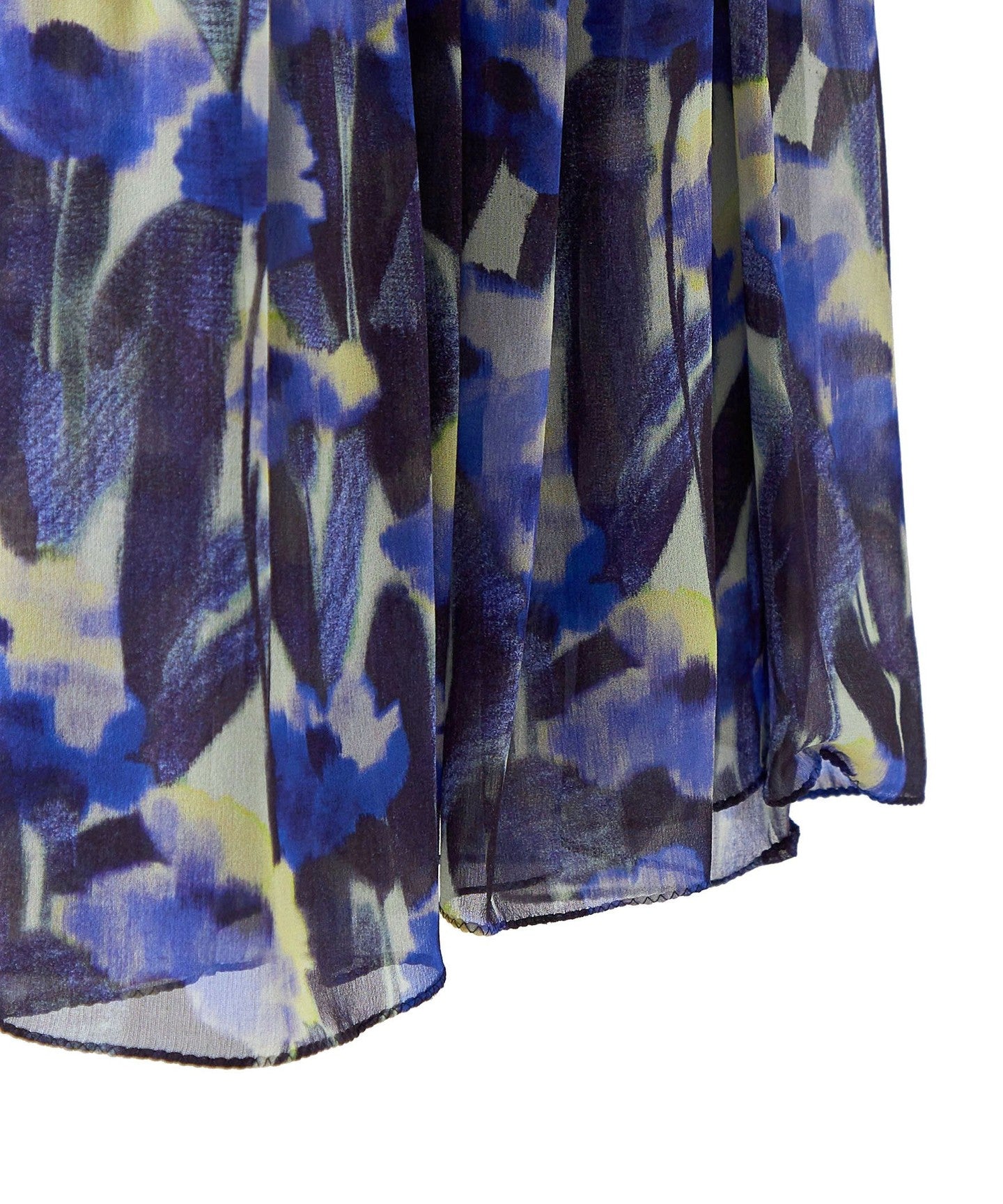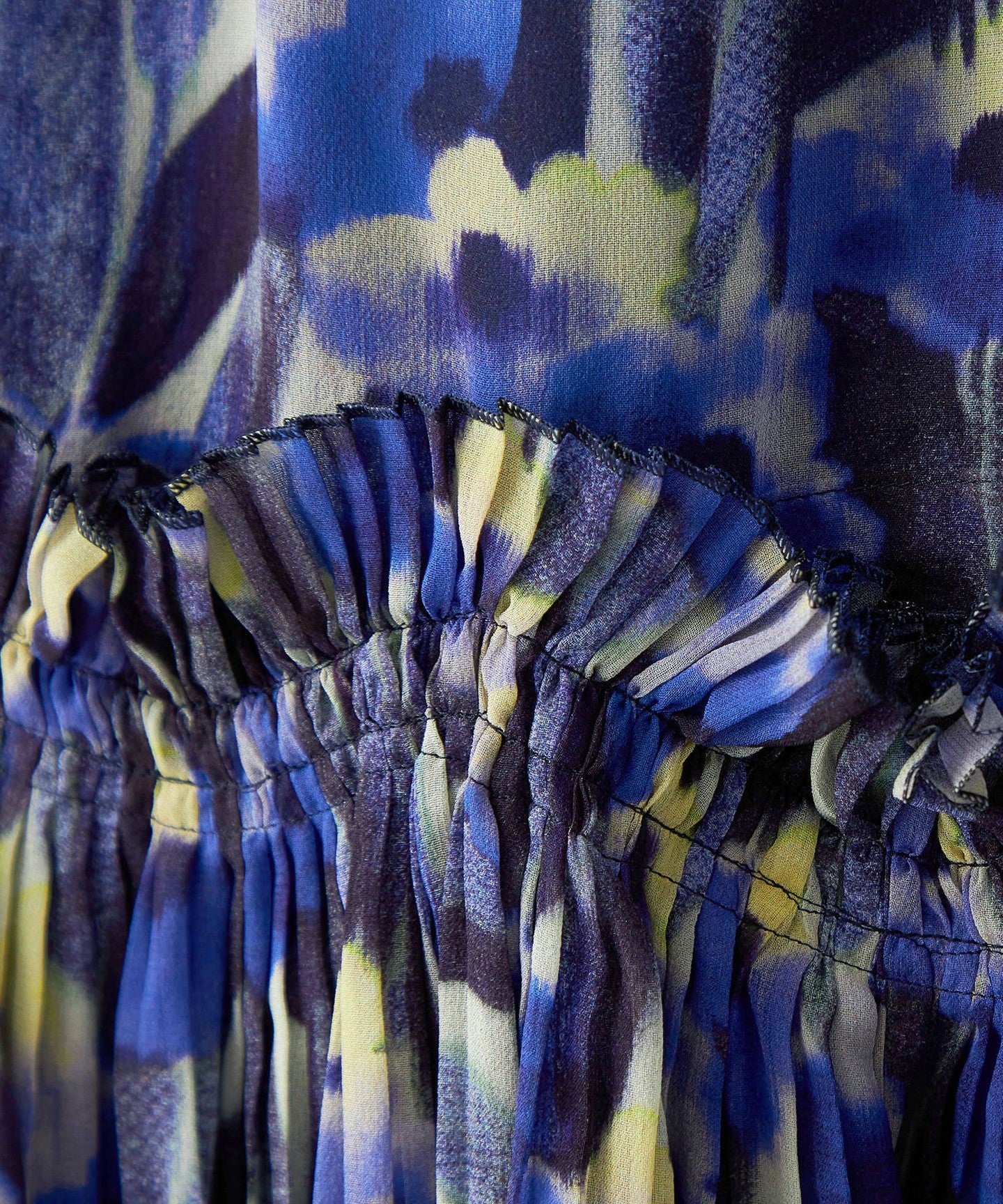 It features a fantastical atmosphere created by layering sheer silk printed fabric over blue silk material.