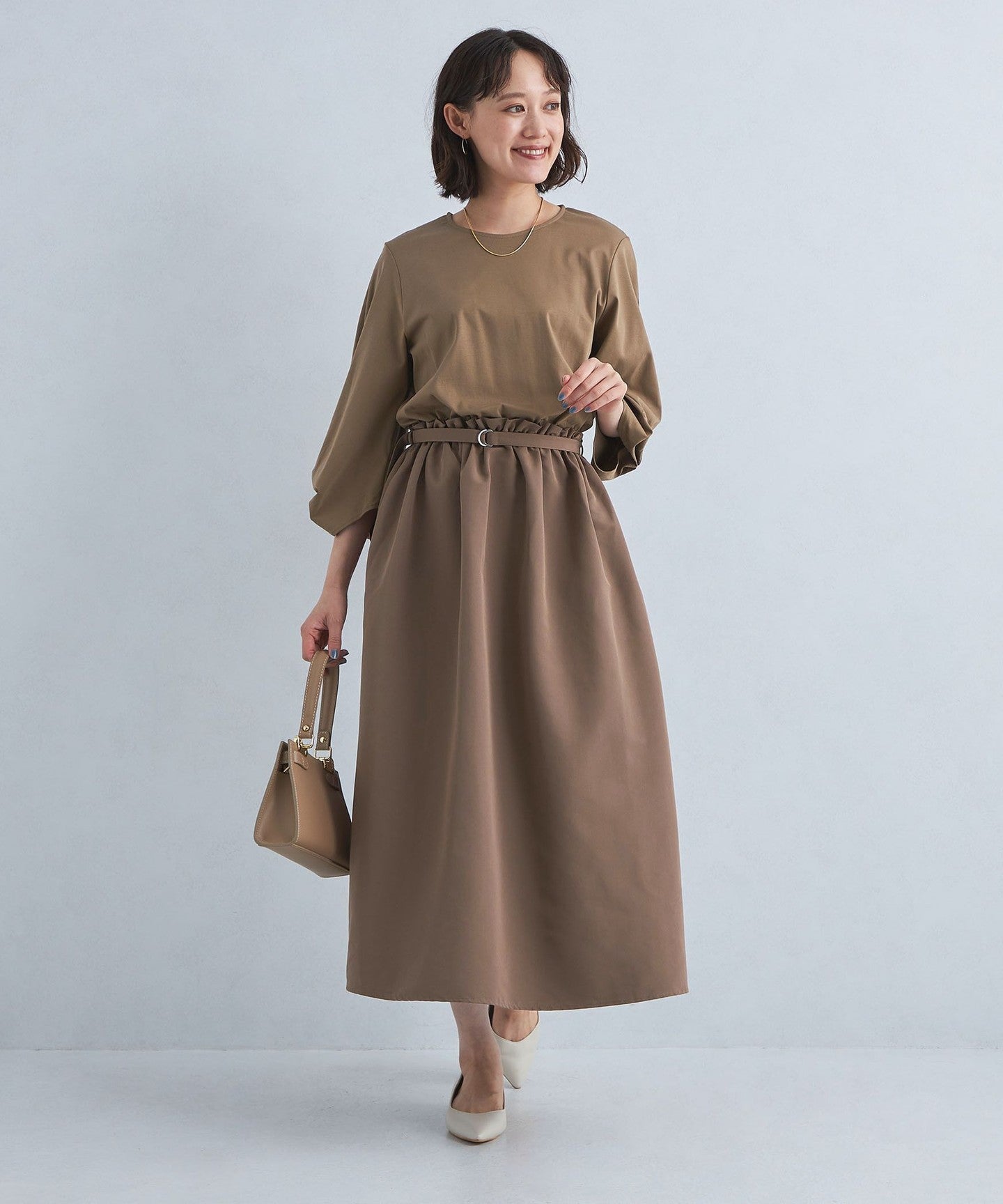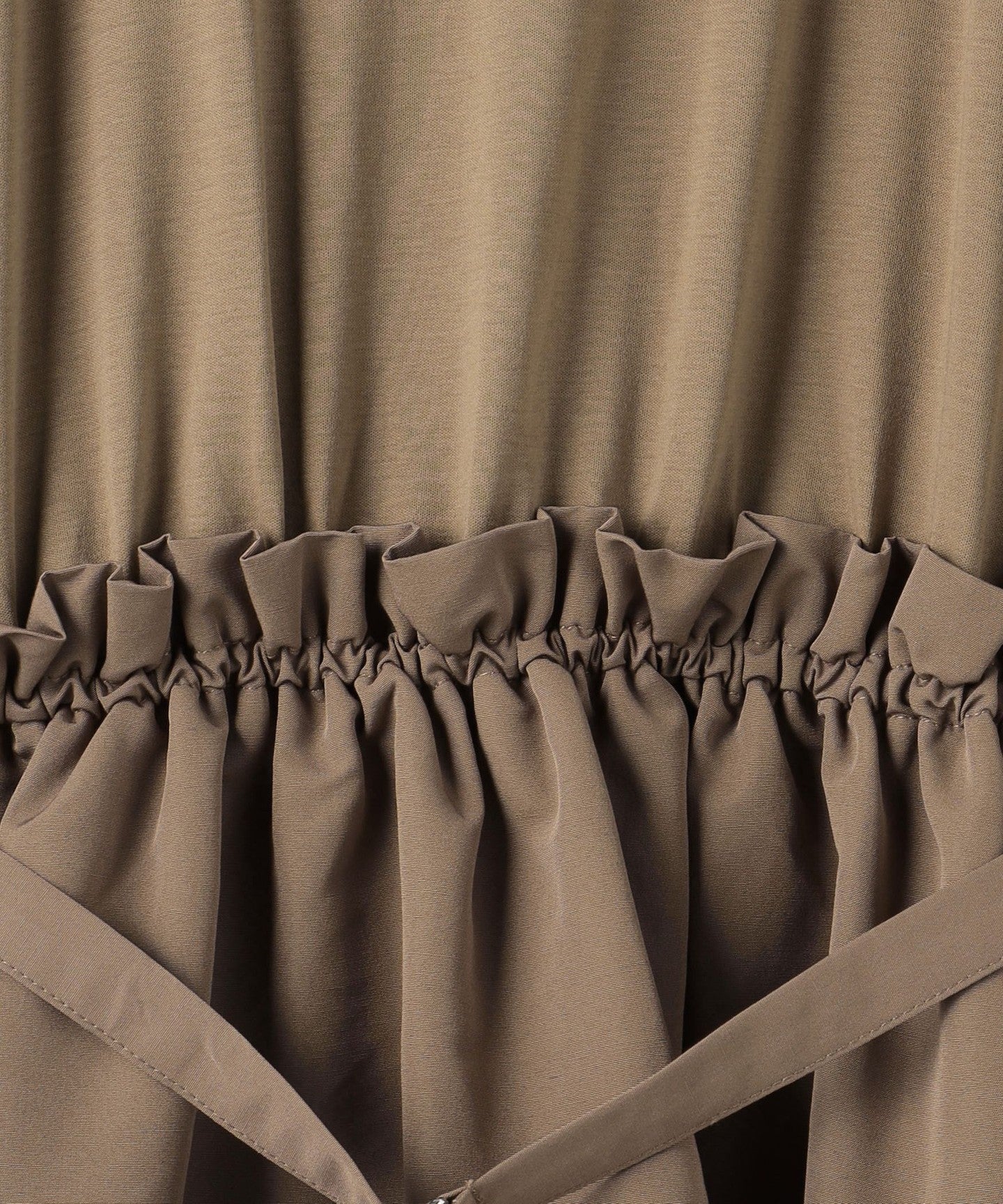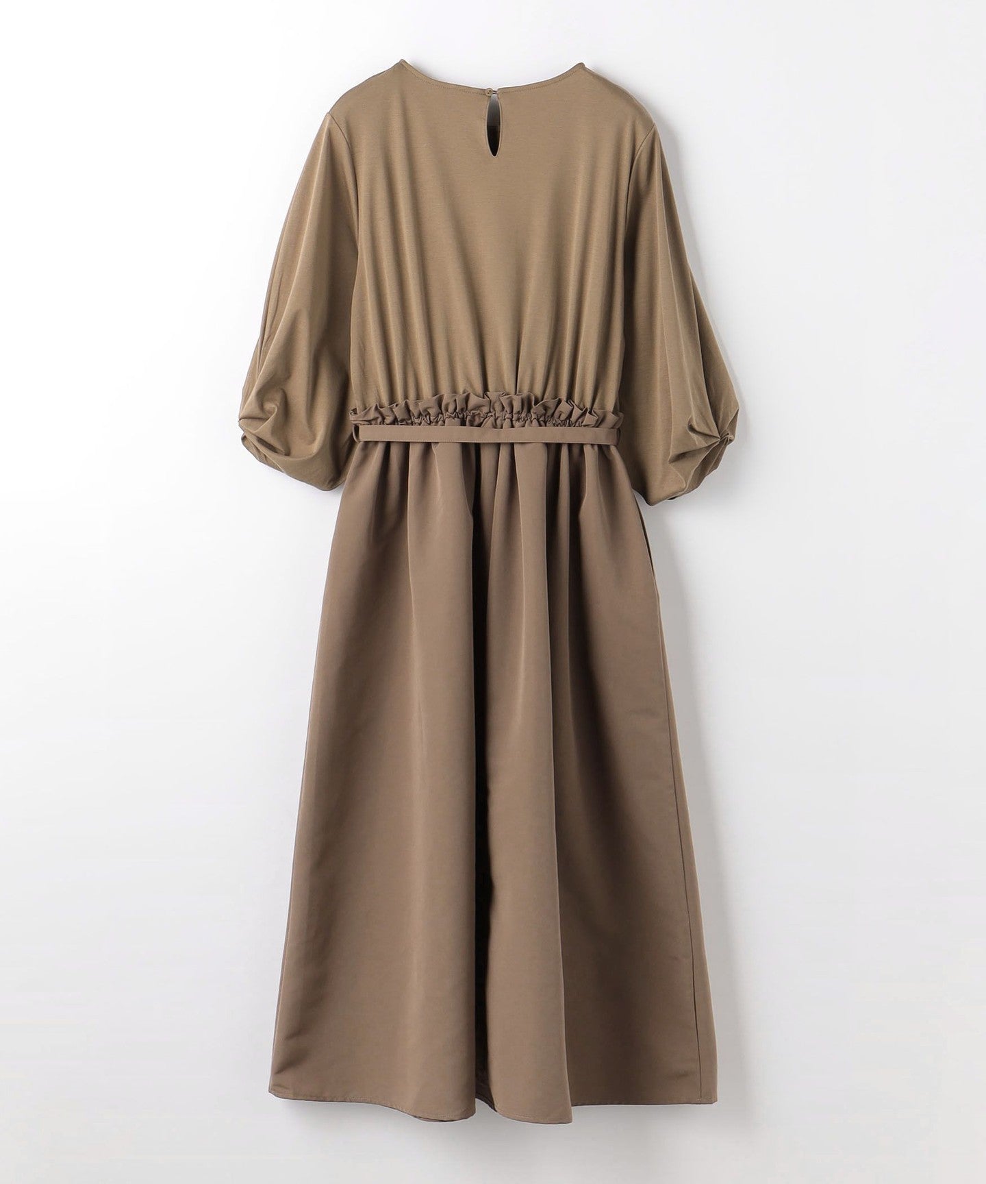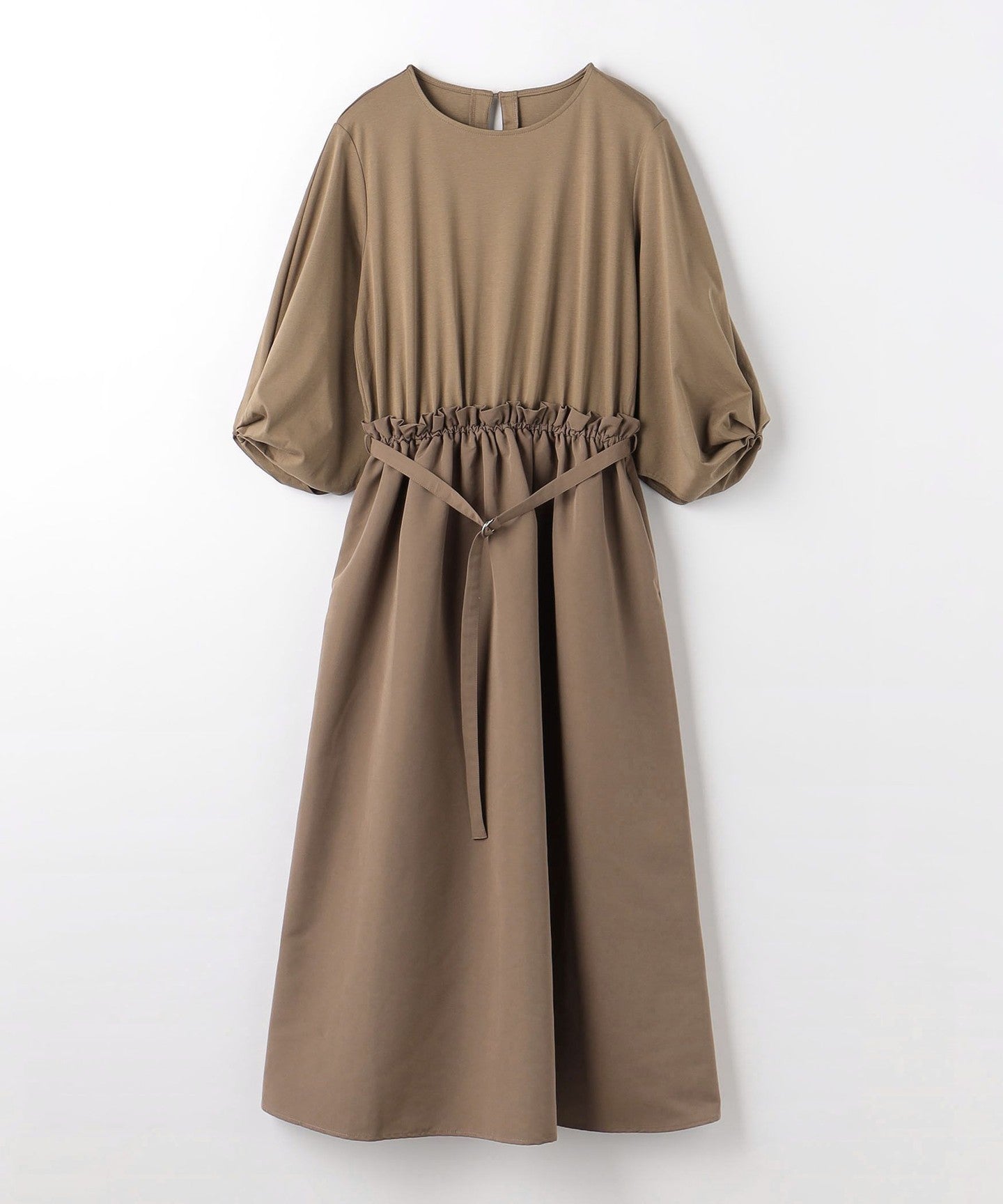 This dress features a skirt made of a smooth material and an upper body made of cut and sew material.