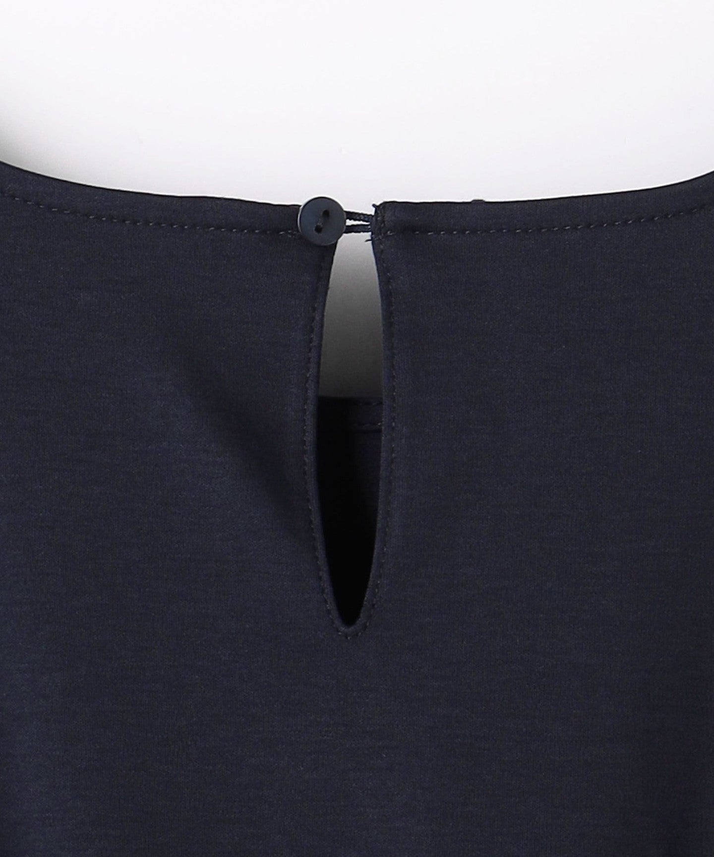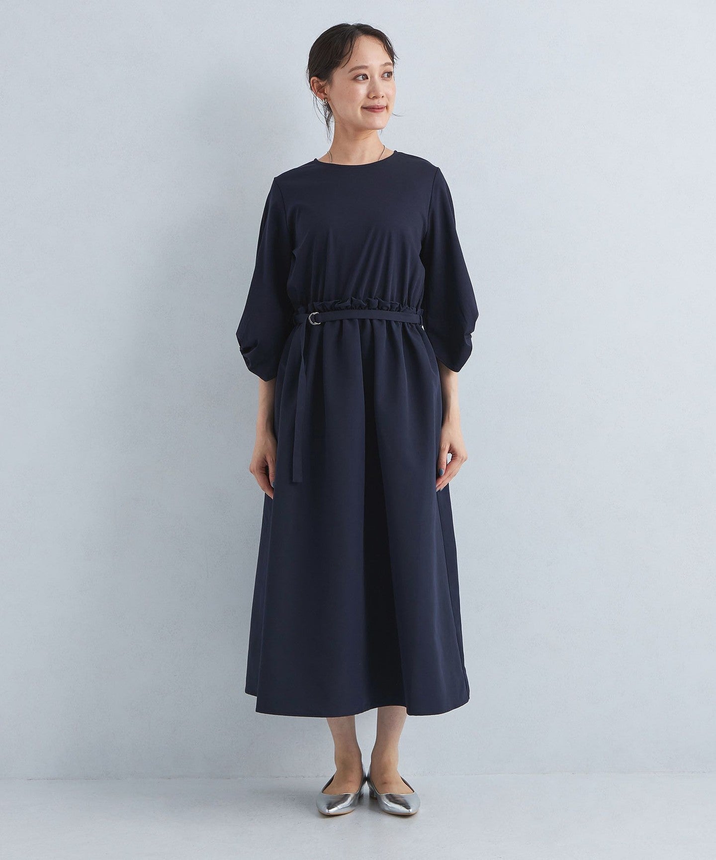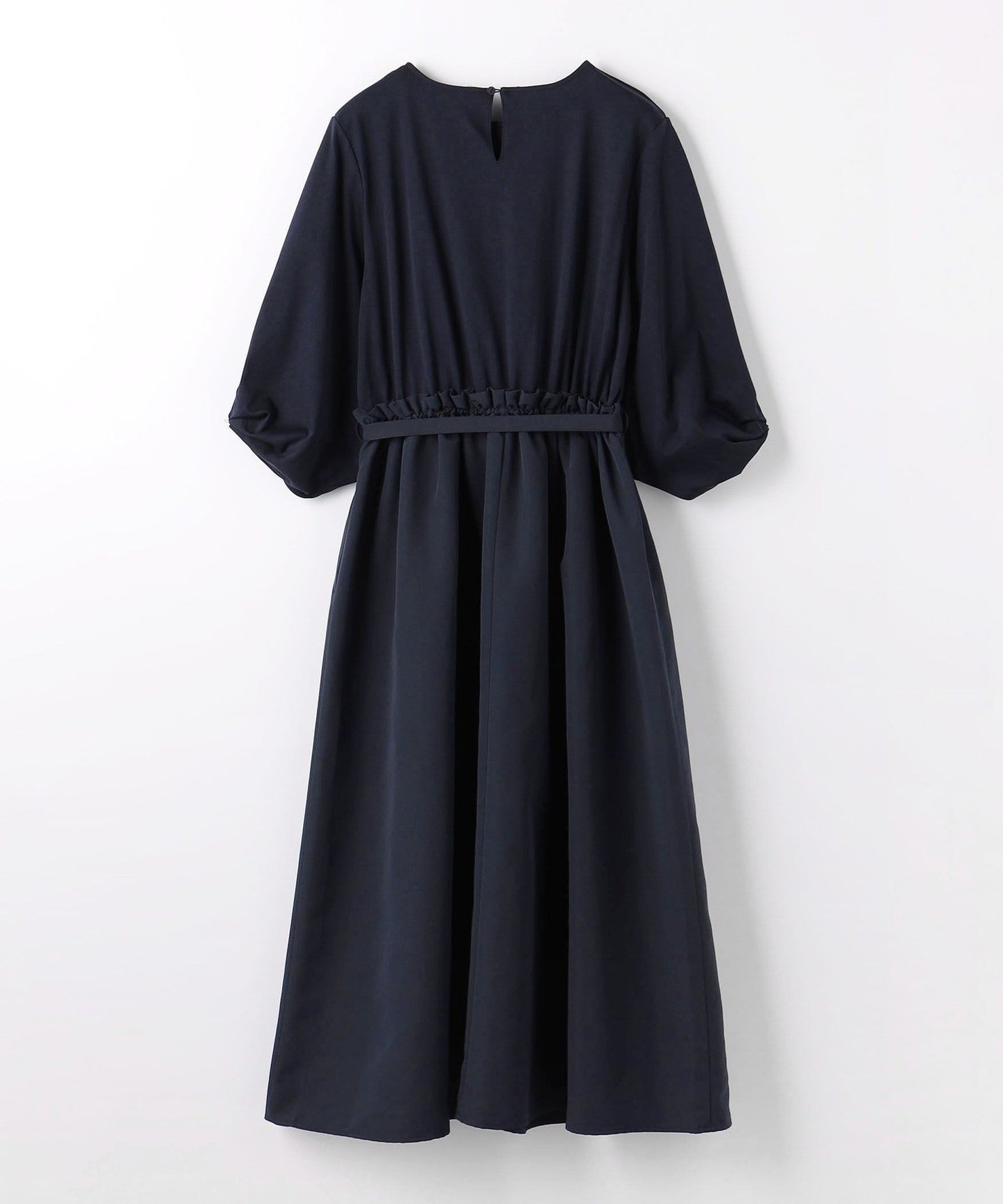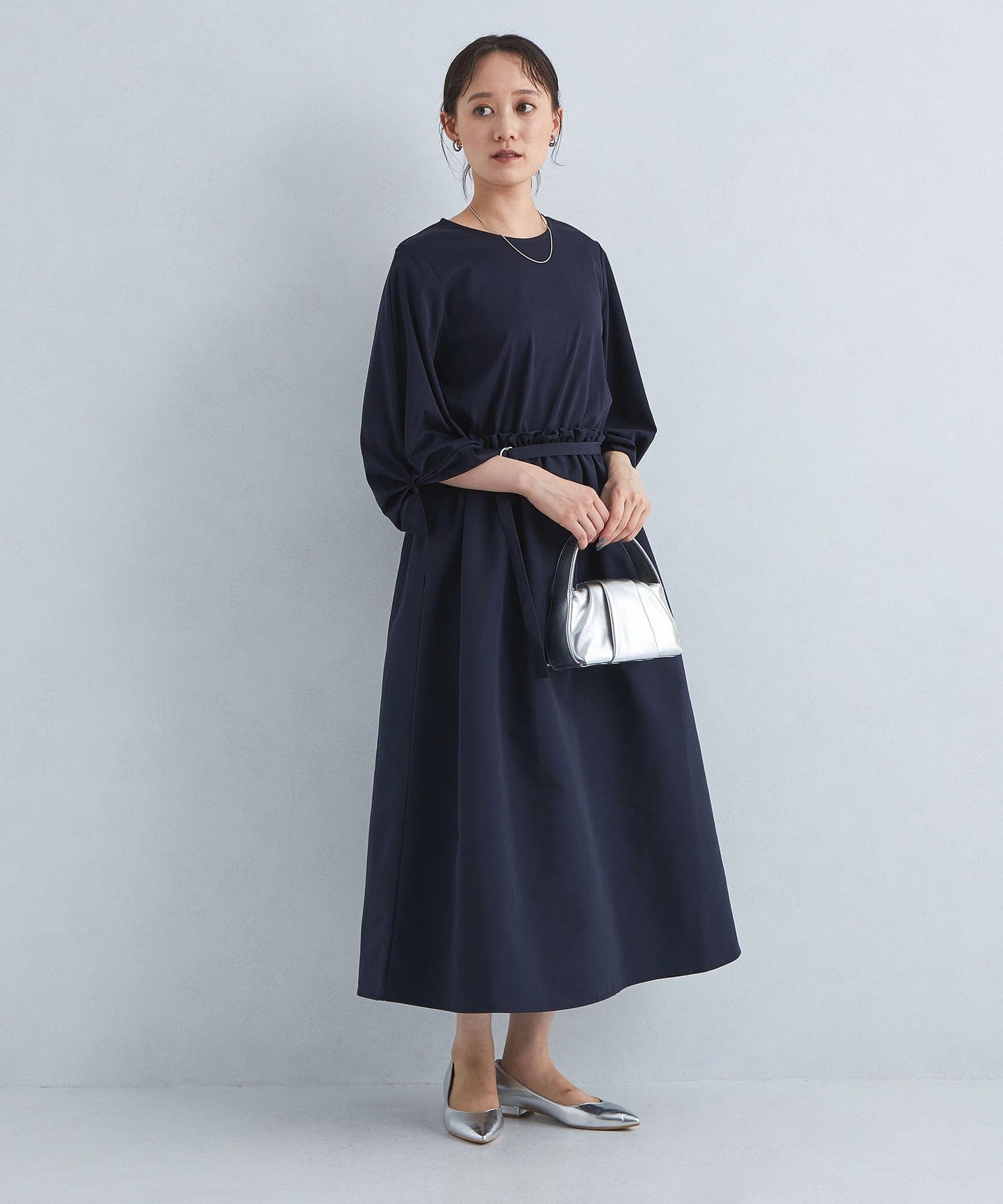 This dress features a skirt made of a smooth material and an upper body made of cut and sew material.