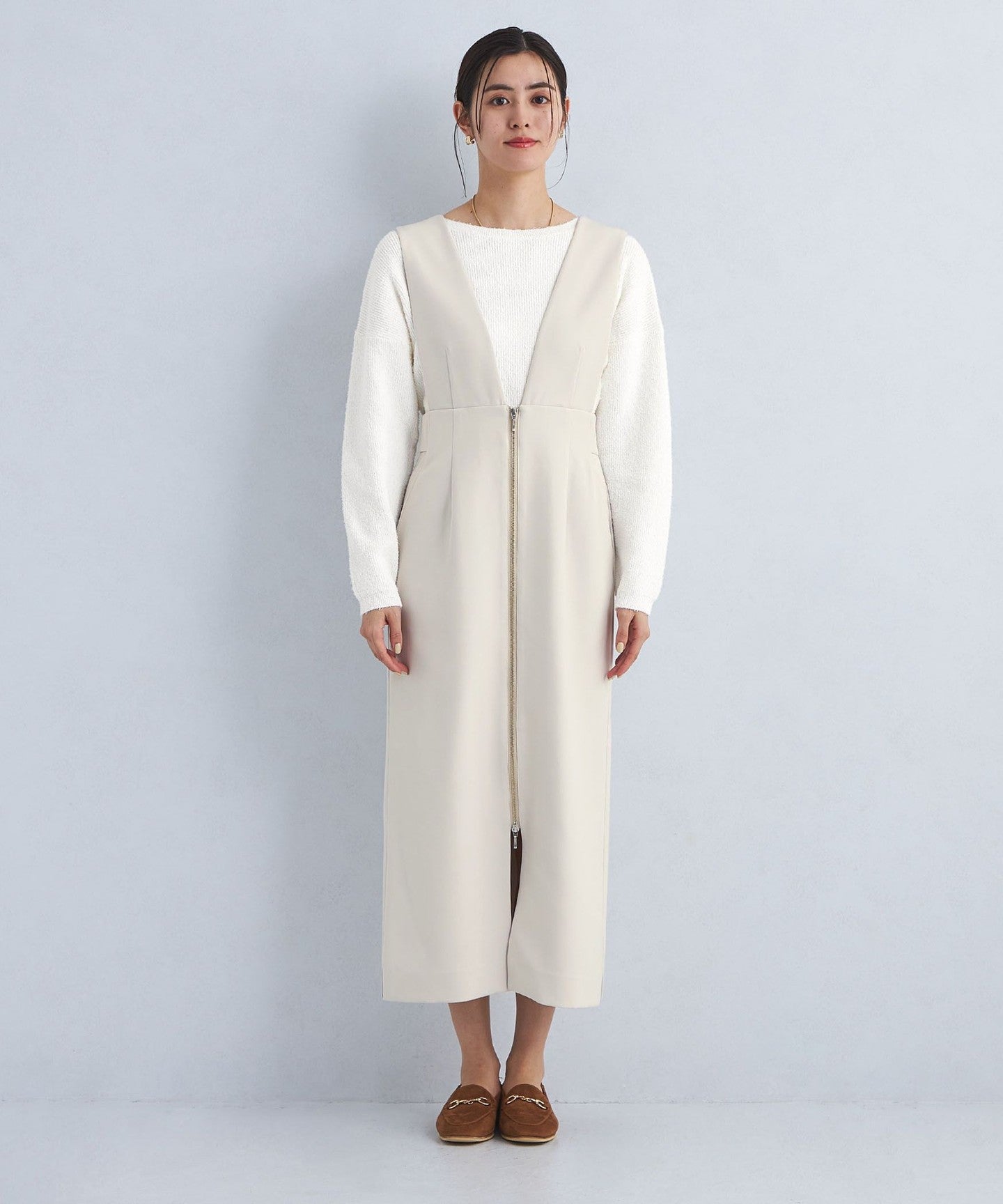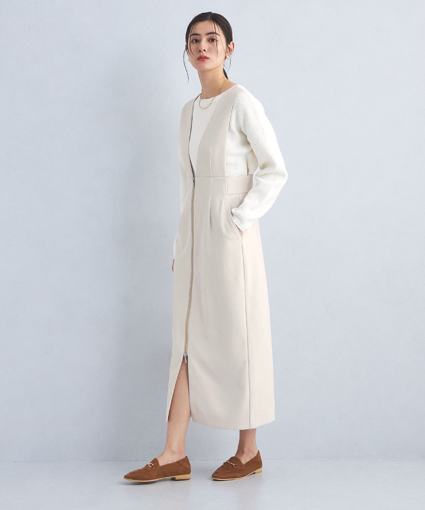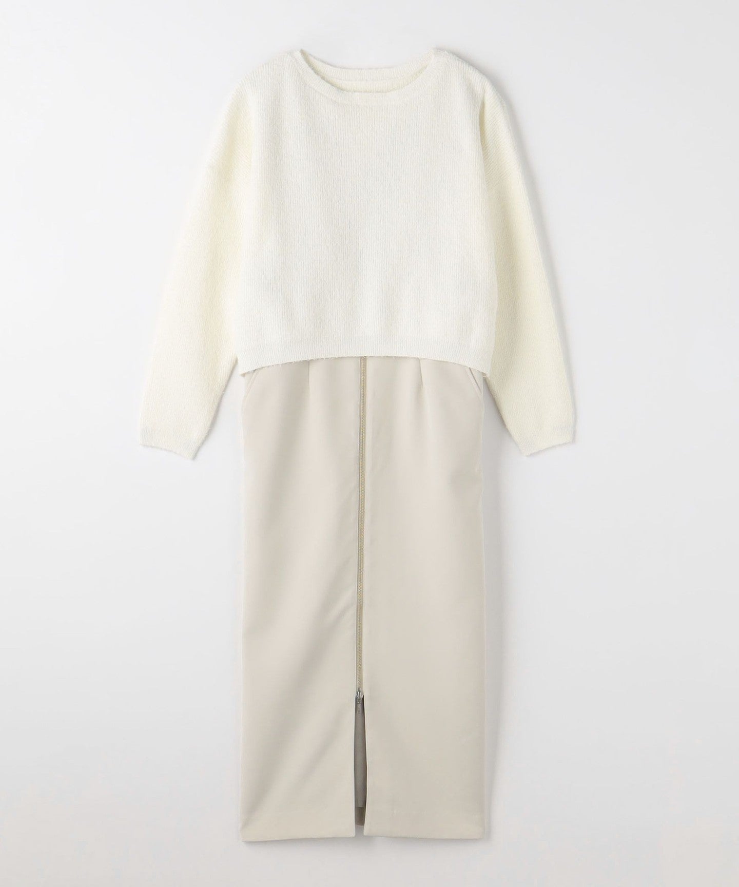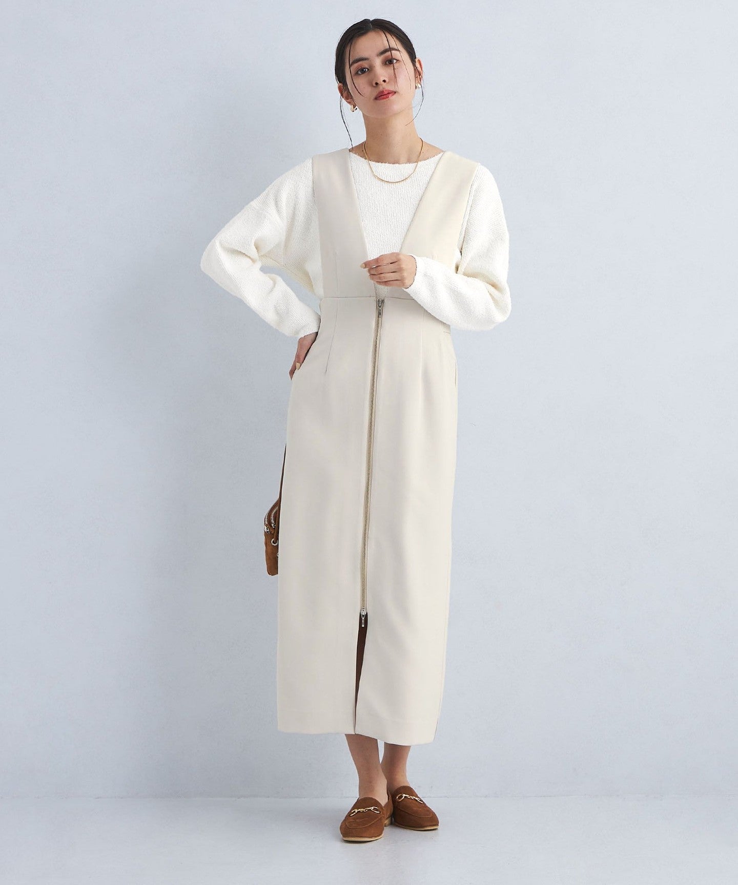 This jumper skirt with zip details shows just the right amount of skin like a slit skirt, creating a feminine and relaxed look.