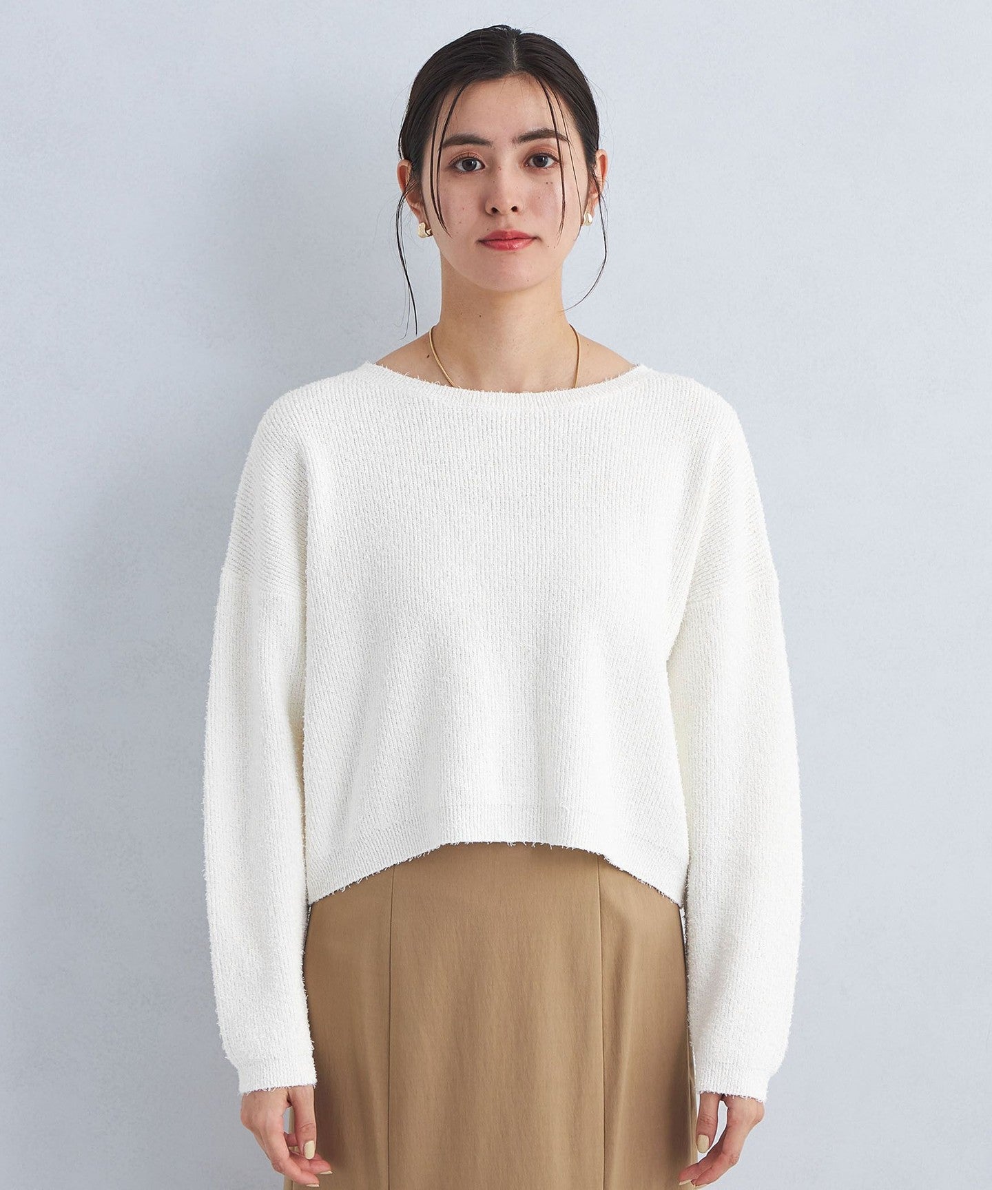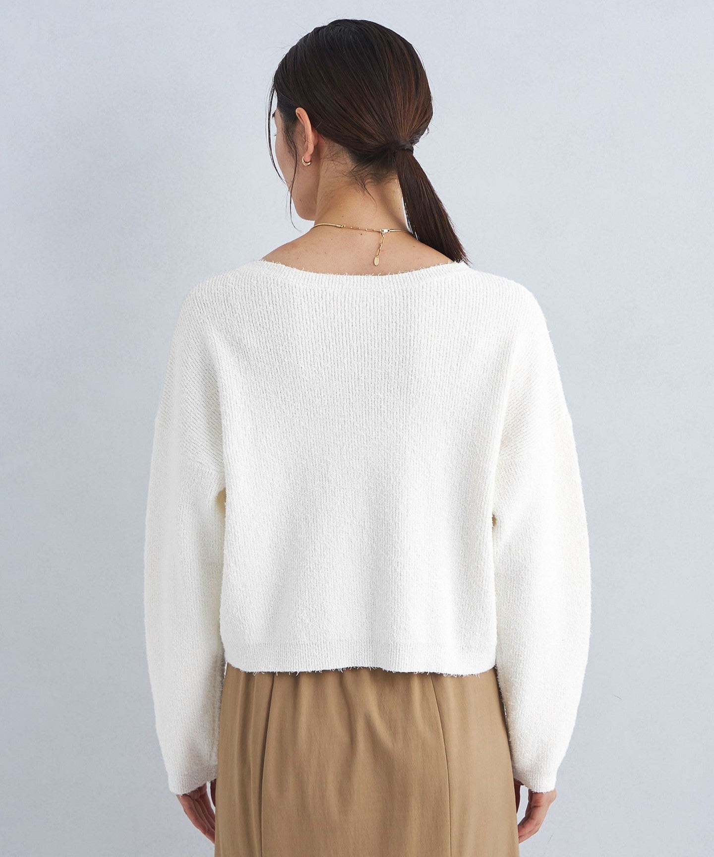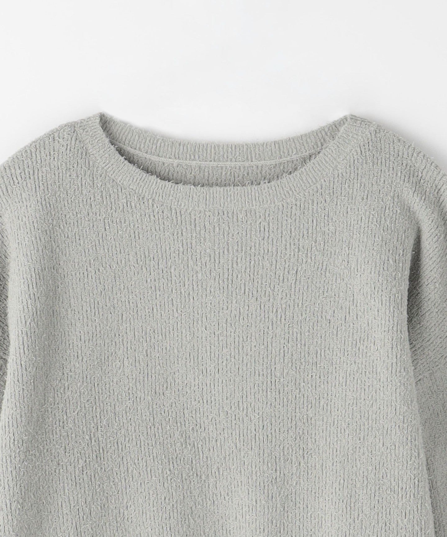 The knitwear has a loose boat neck.