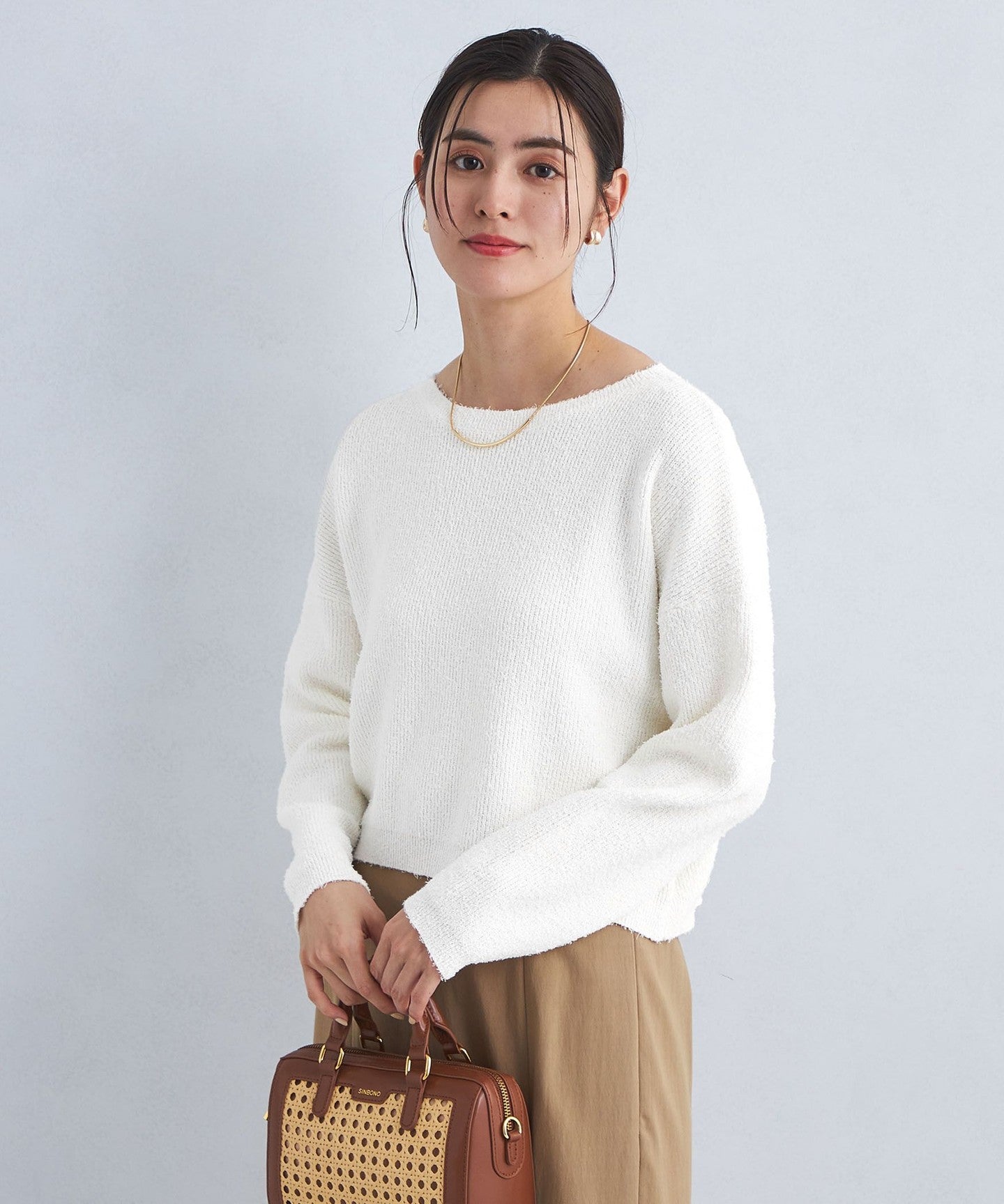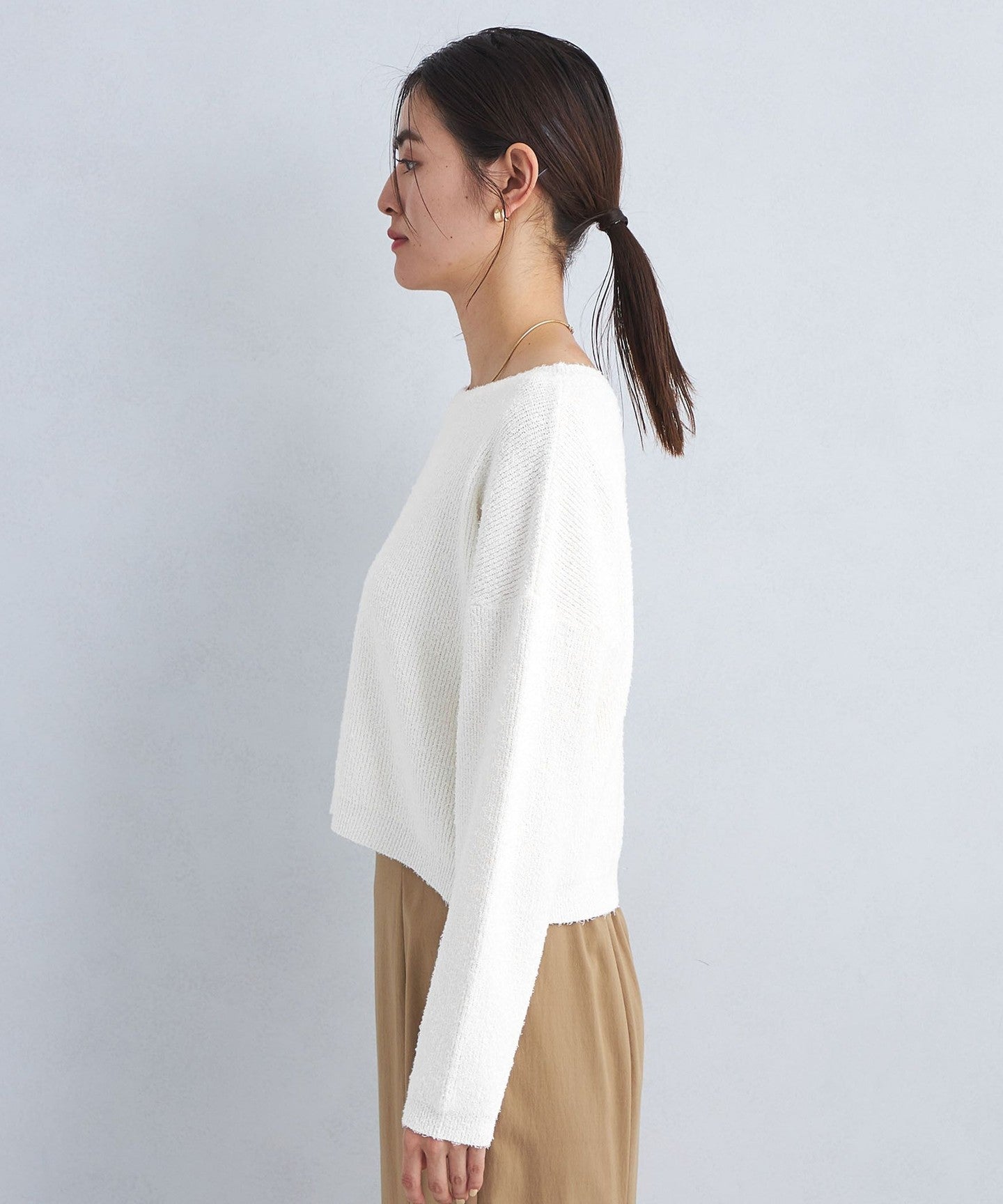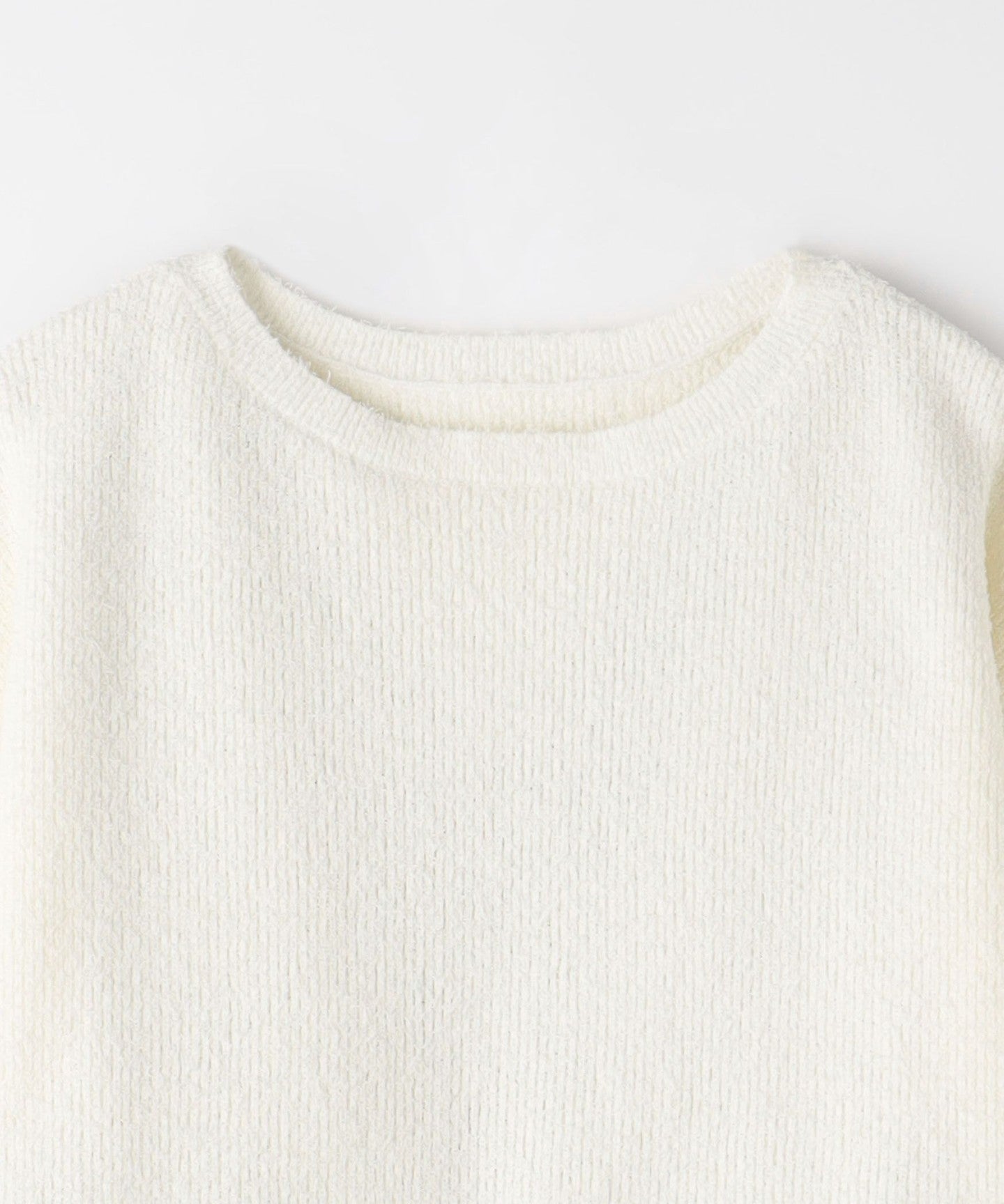 The knitwear has a loose boat neck.