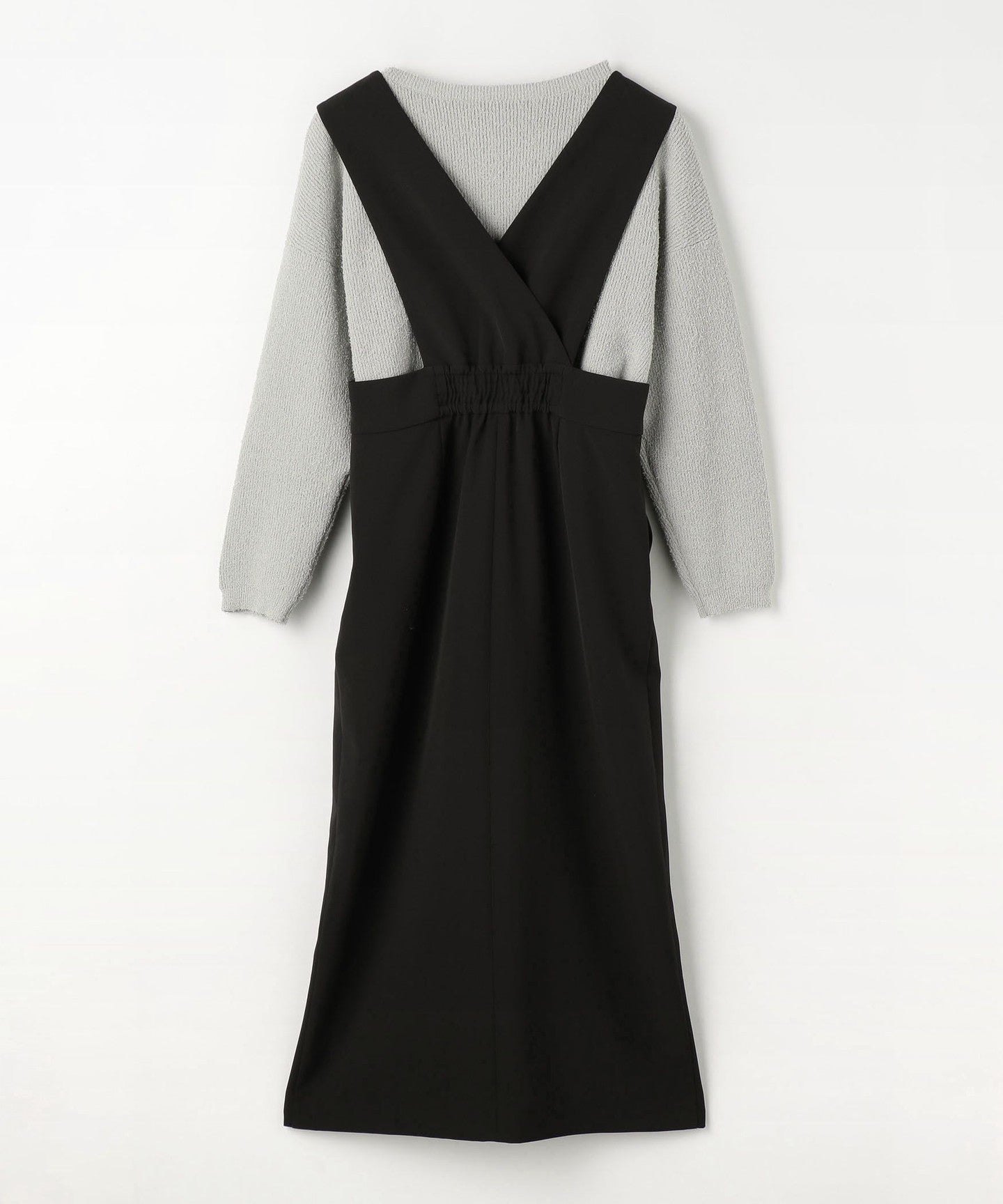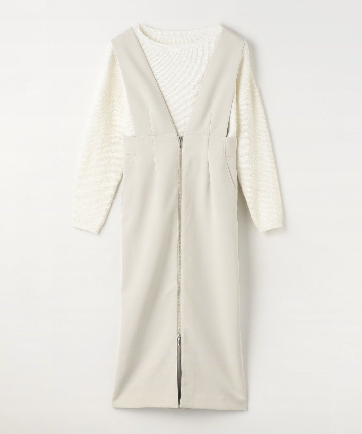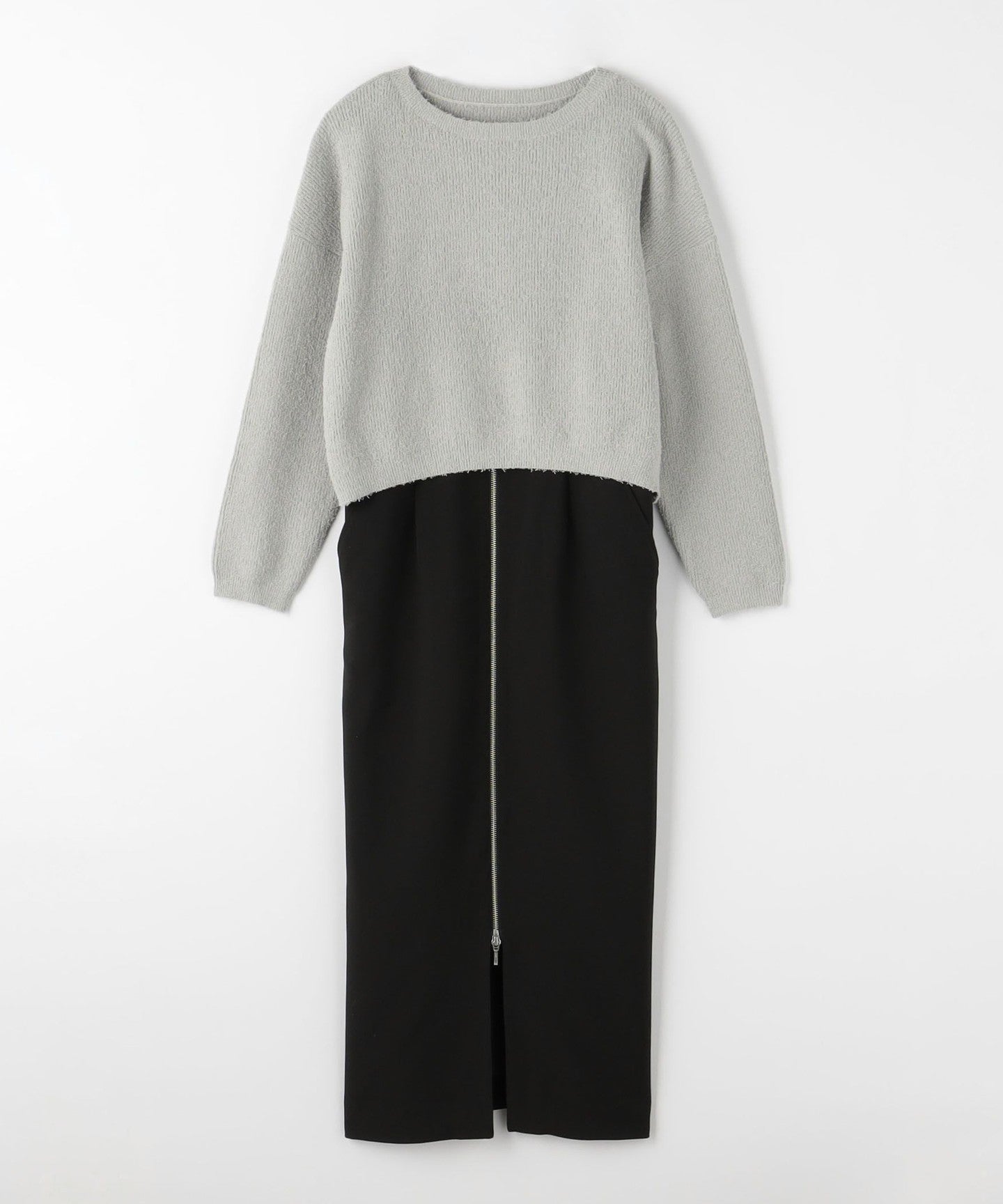 A set item consisting of a jumper skirt accented with a front zip and a knit.