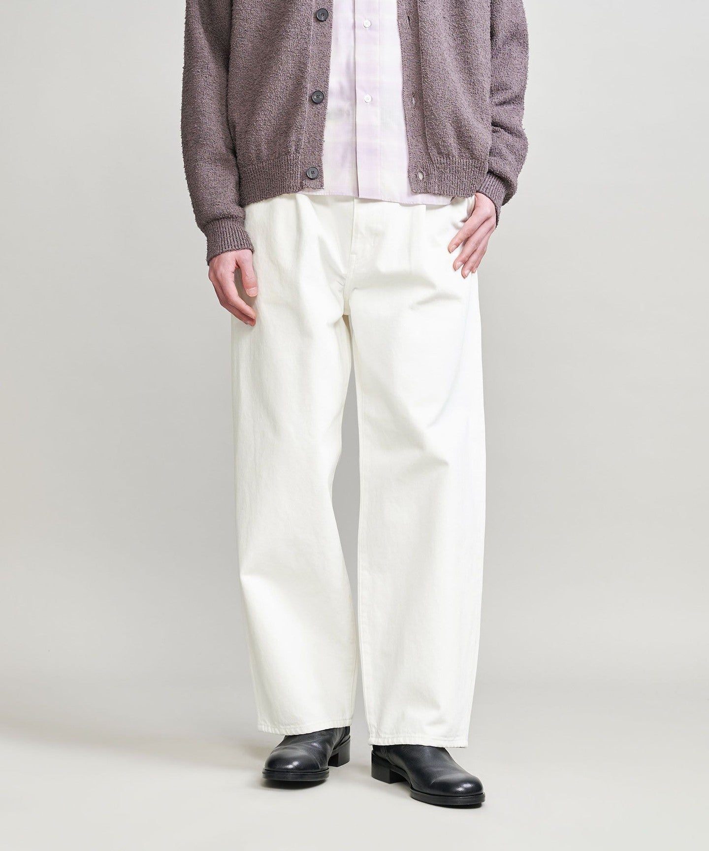 These one-pleat baggy pants feature a wide silhouette that flares out from the thighs to the knees. By intentionally tapering the hem slightly, they have been perfectly balanced to be comfortable even for adults. Made from 13.5oz denim, the natural unevenness of the warp threads creates an elegant impression without looking too casual. A new addition to the denim range, these pants complement a wide range of urban styles.