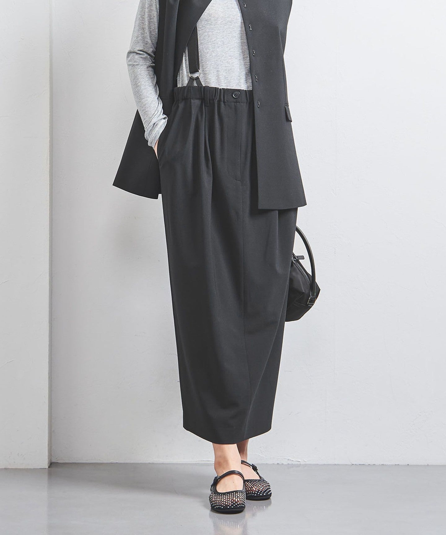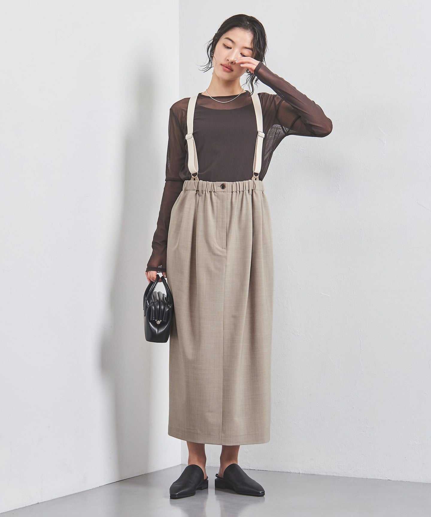 A skirt with suspenders that has a masculine yet casual feel.