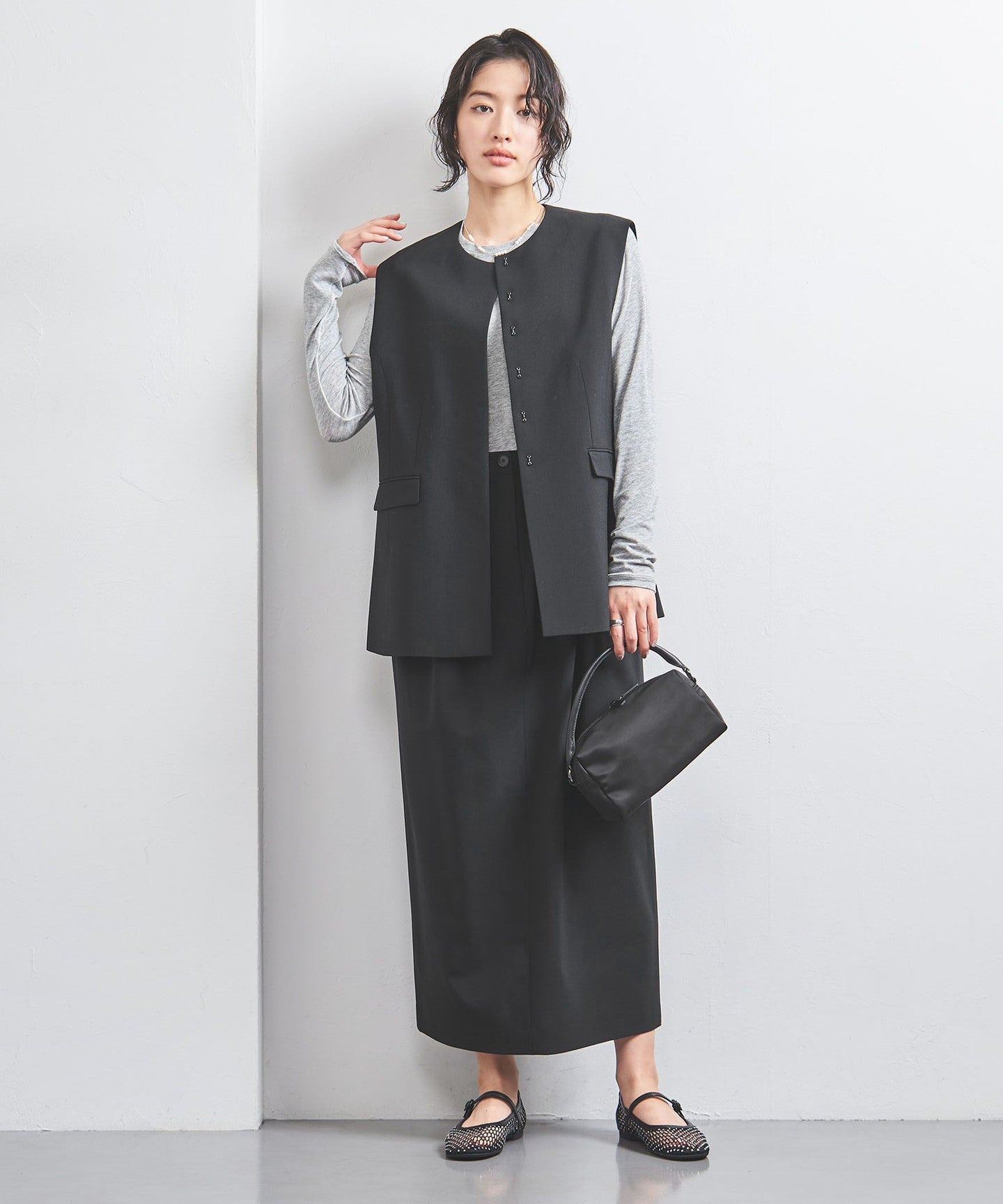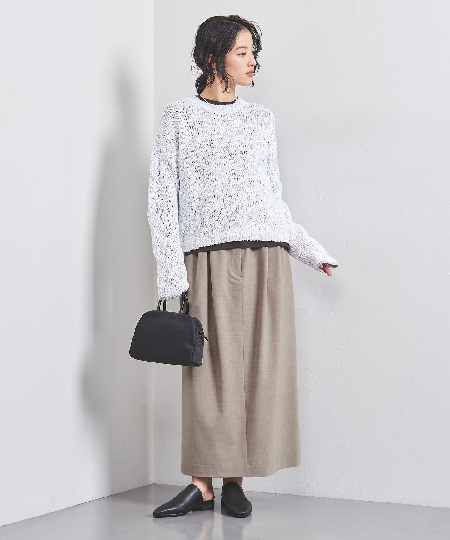 We recommend pairing it with simple items such as long-sleeved T-shirts, high-gauge knits, and regular shirts.