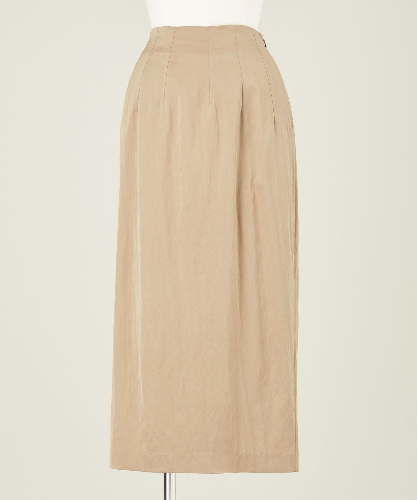 A tight skirt with darts in the front and elastic at the back of the waist, creating a different design from the front to the back.