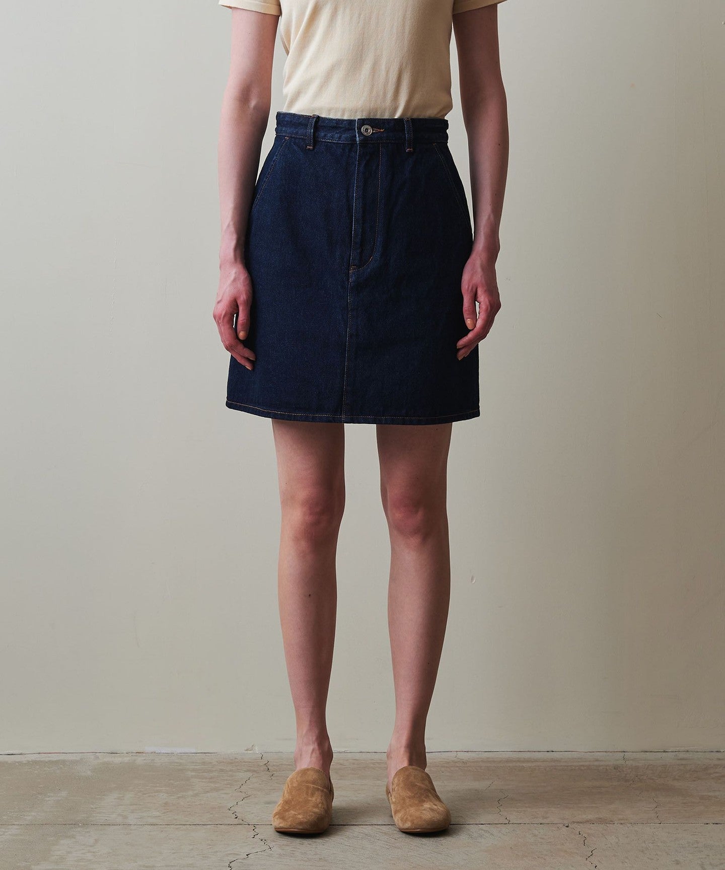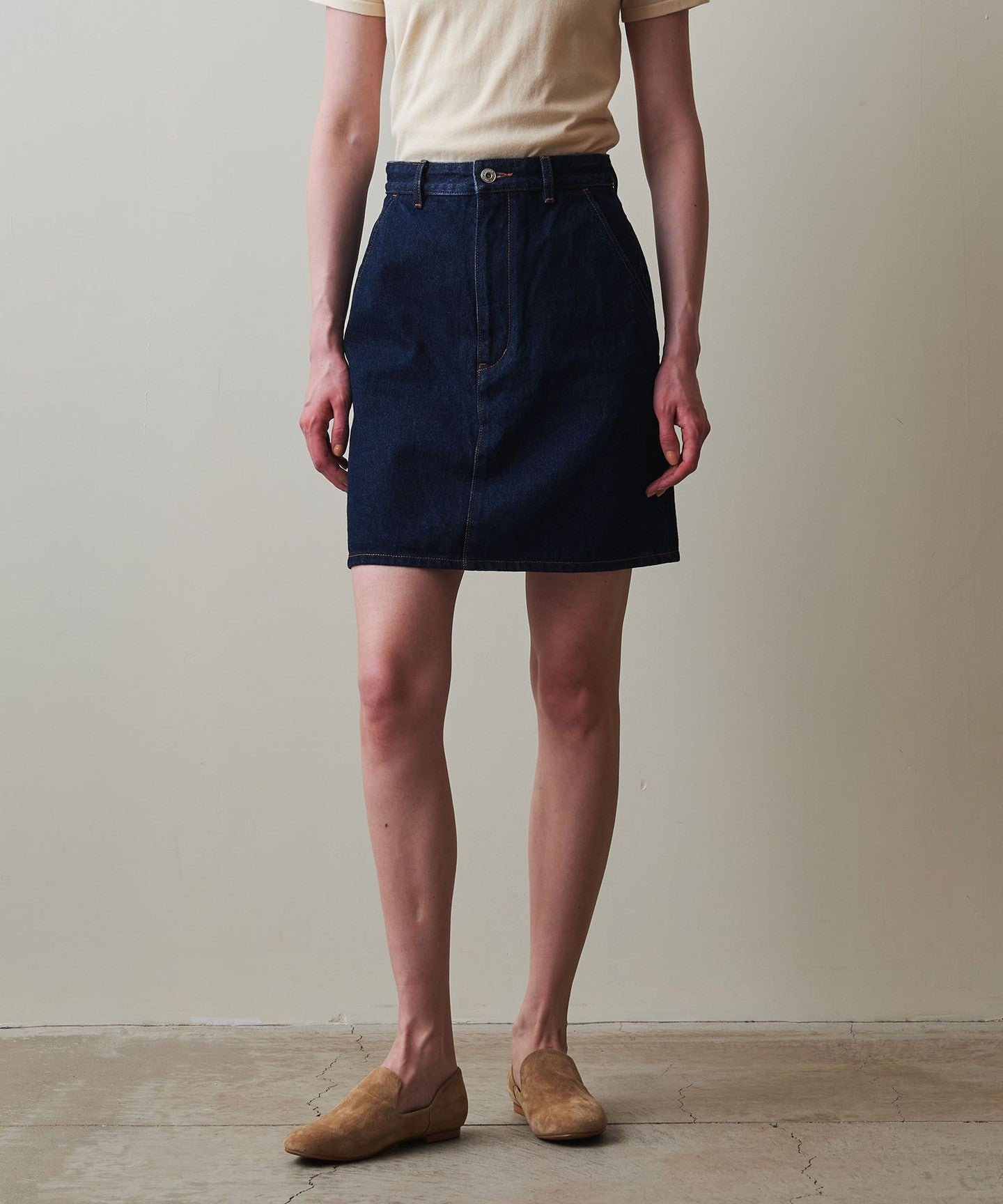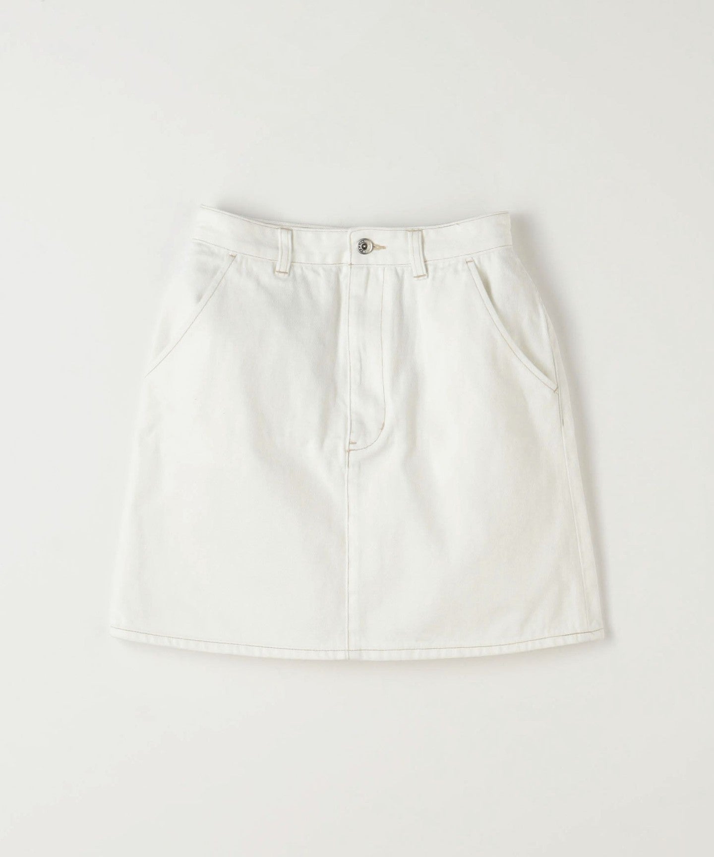 The waistline is designed to fit the body neatly and the understated trapezoid design creates a carefully designed silhouette that doesn't look too casual even though it's a mini length.