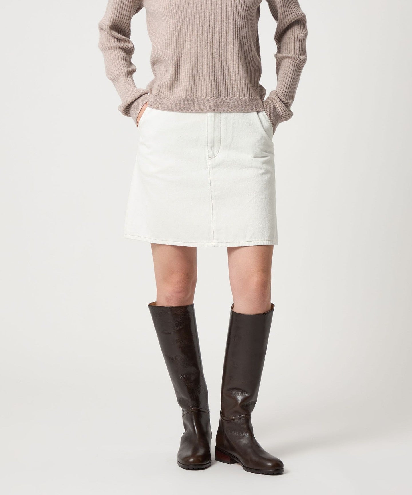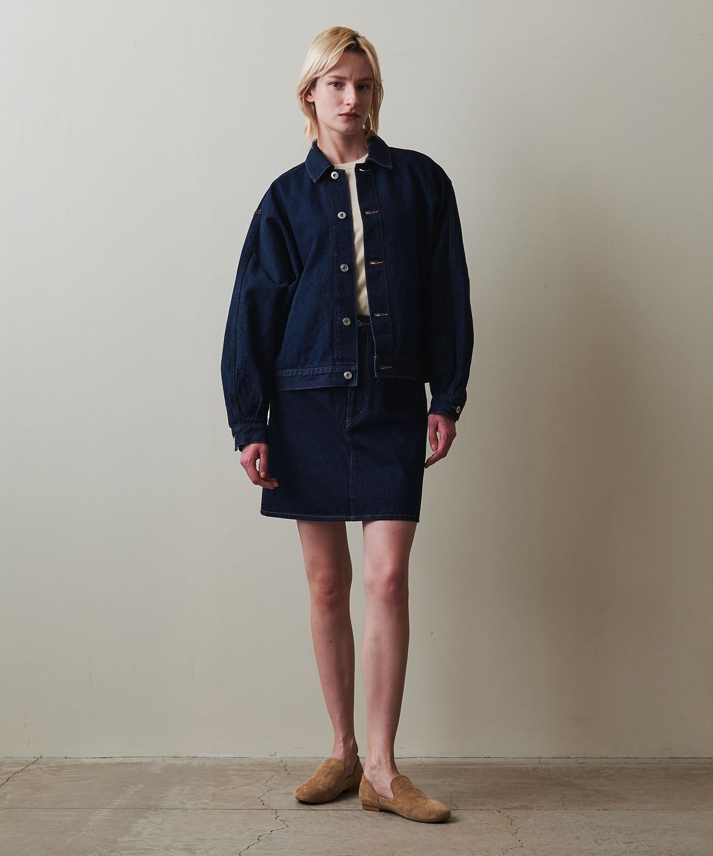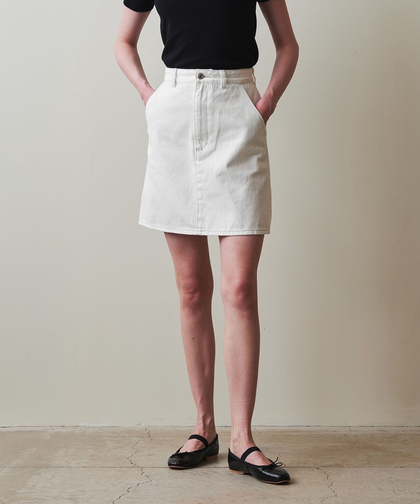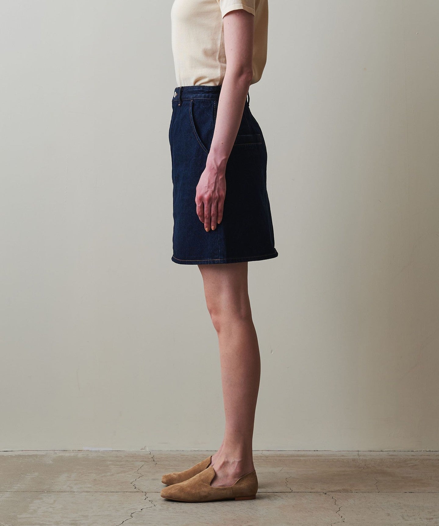 The waistline is designed to fit the body neatly and the understated trapezoid design creates a carefully designed silhouette that doesn't look too casual even though it's a mini length.