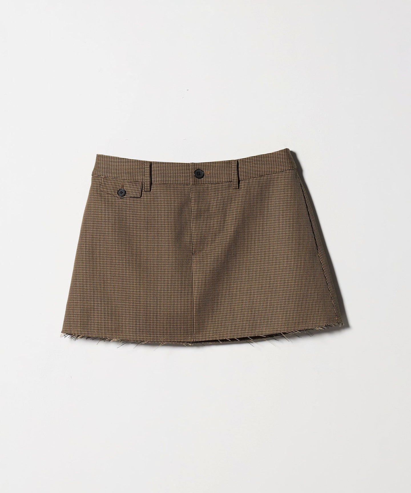 This mini skirt is made from an elegant material, but the cut-off hem gives it an A-line silhouette and a rough look.