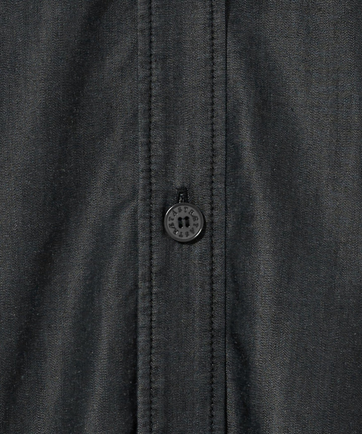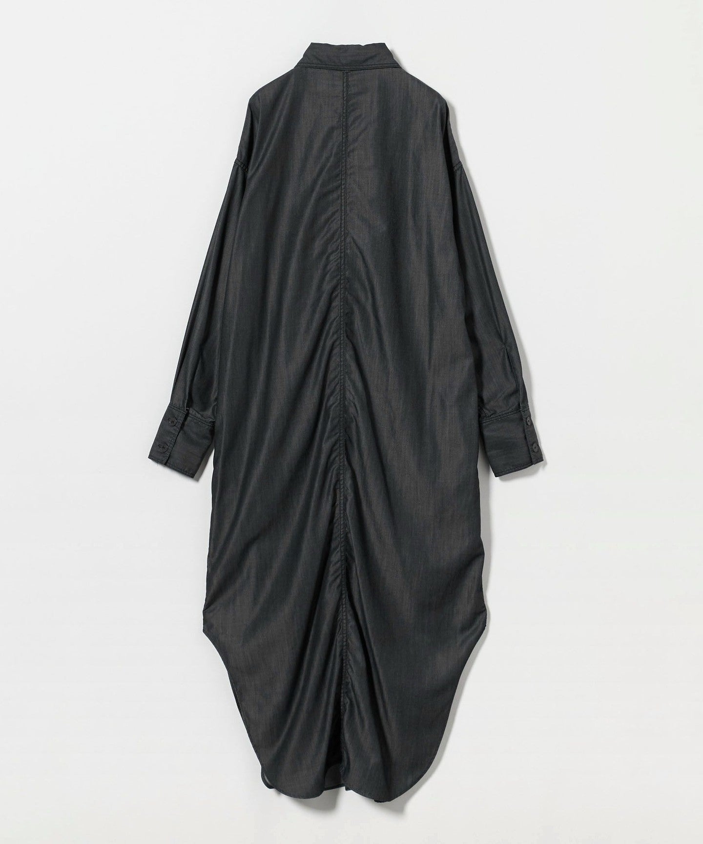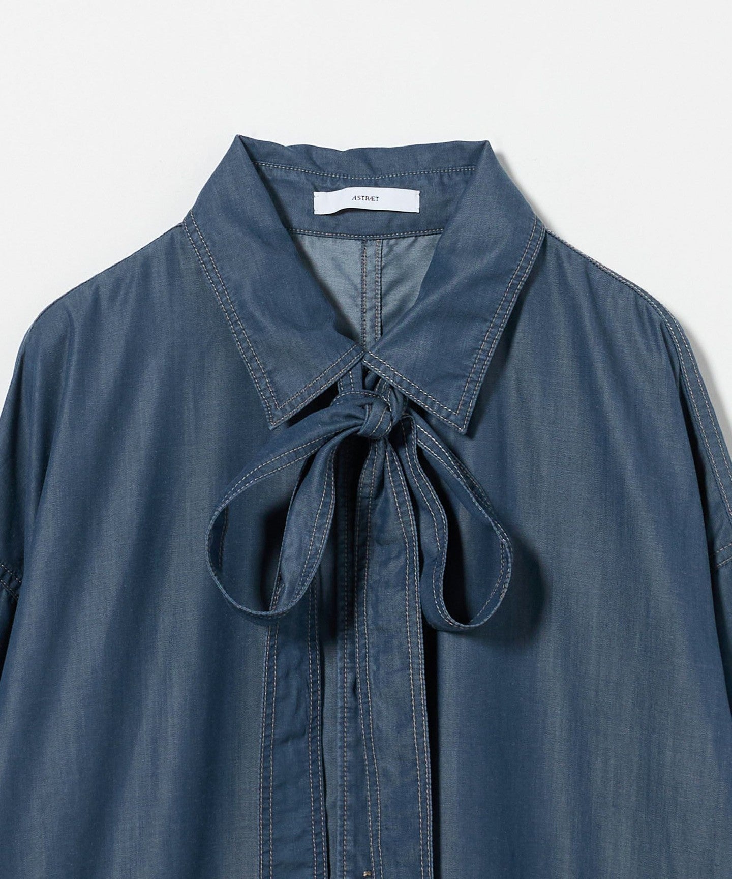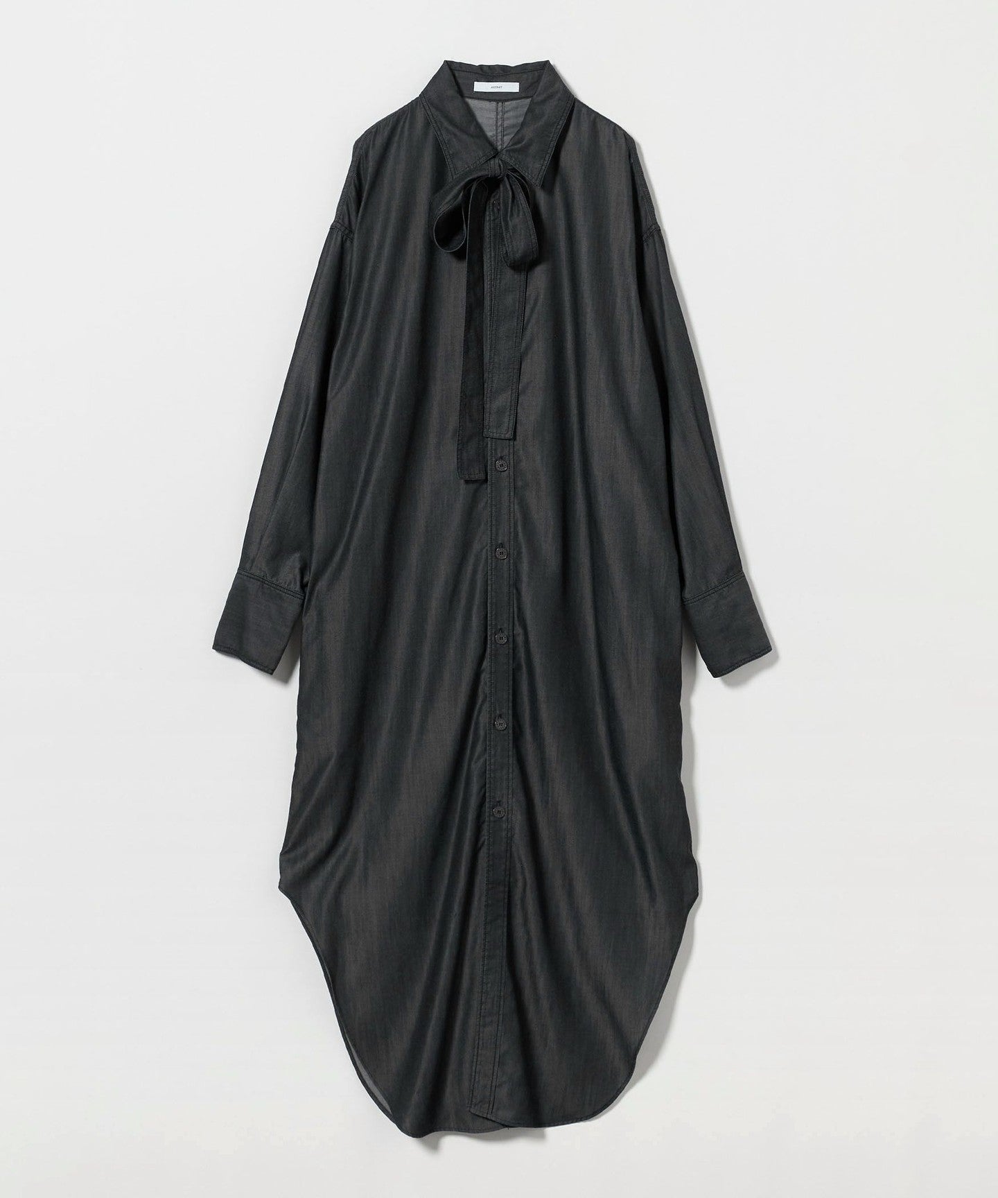 A denim-like shirt dress featuring a side slit and ribbon made of the same material.