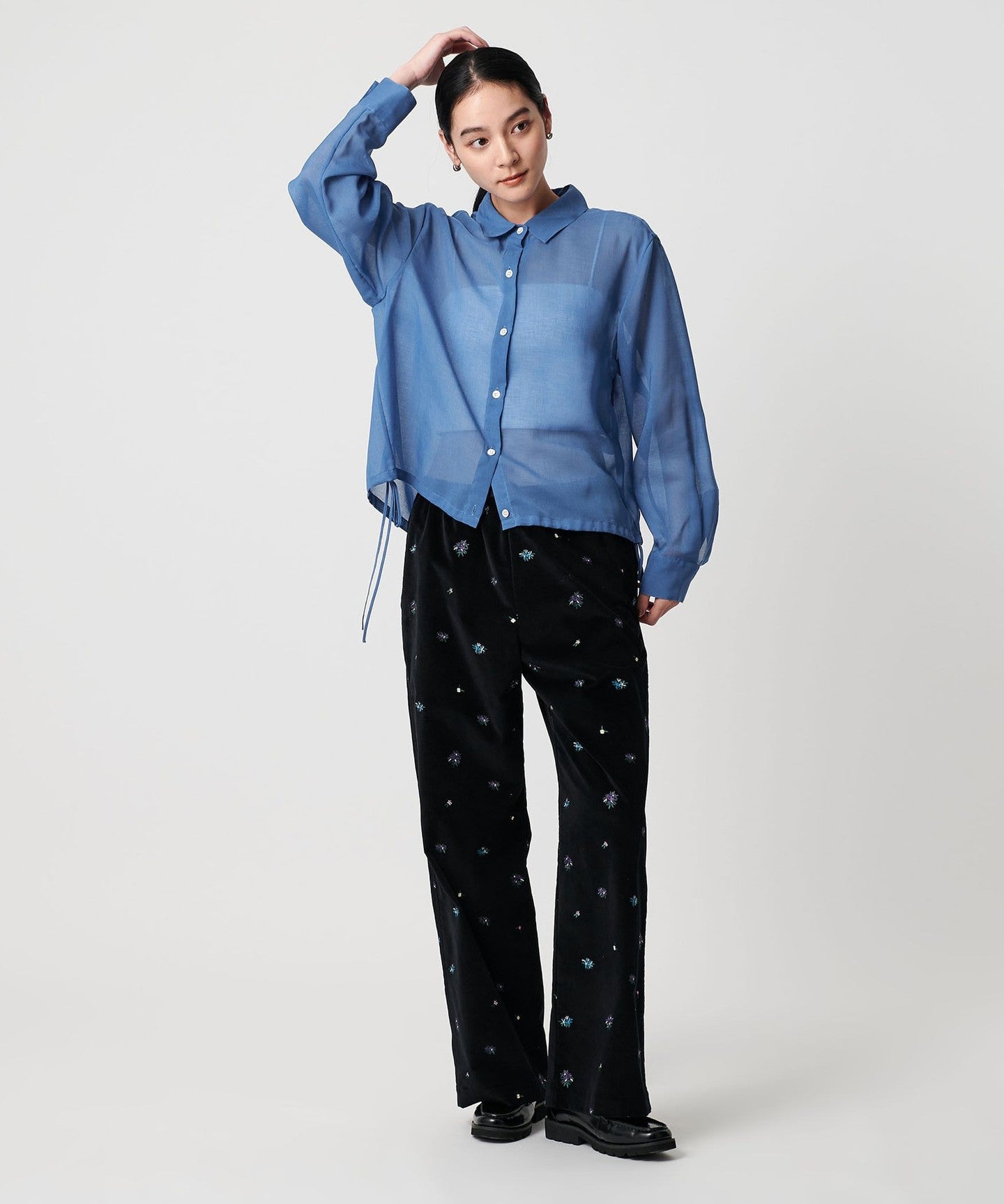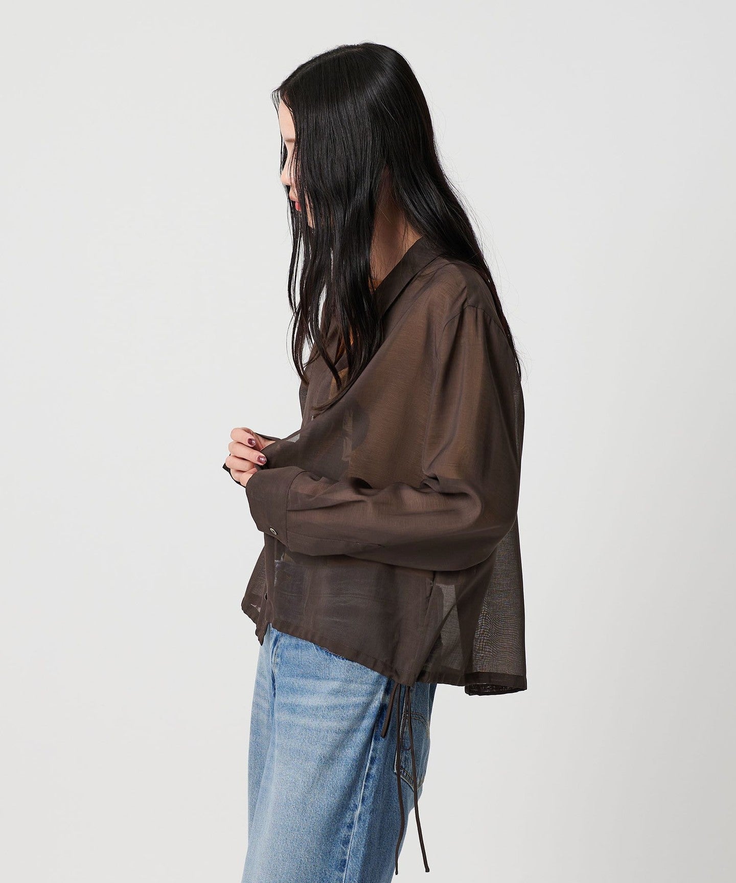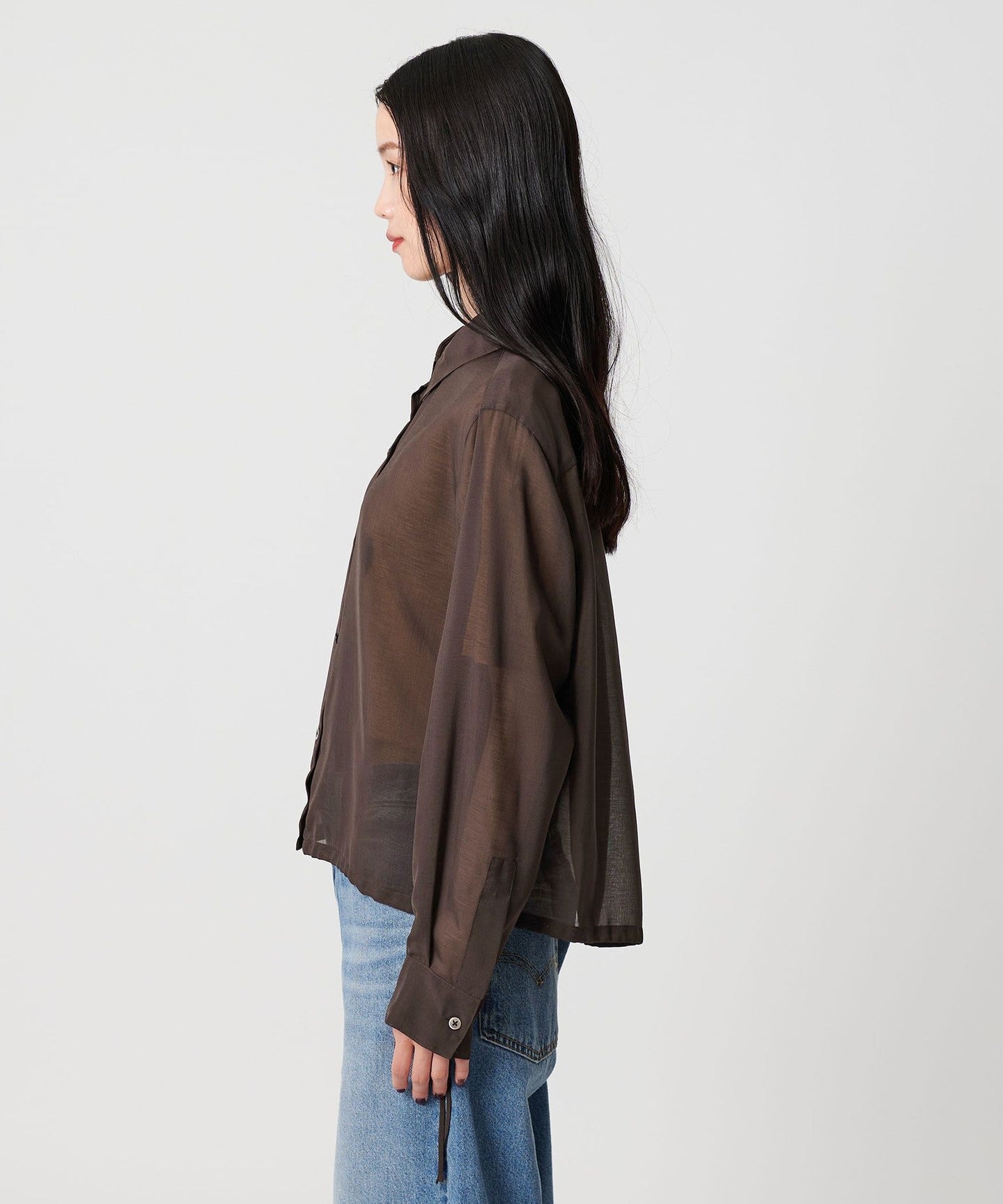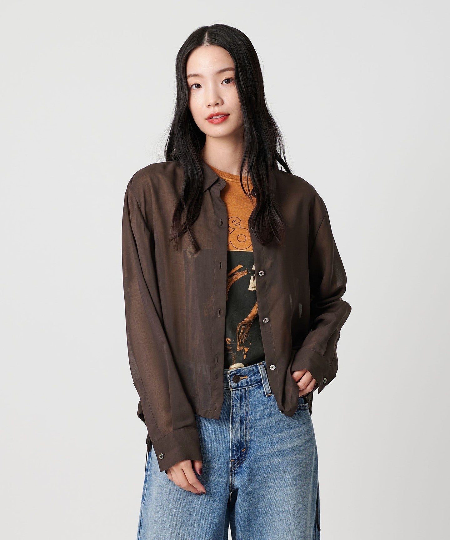 A sheer shirt with an autumnal feel that lets you enjoy changing the silhouette.