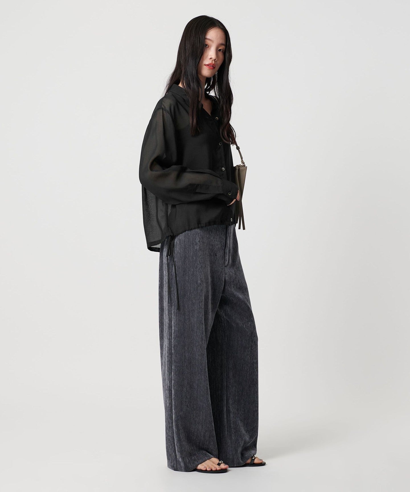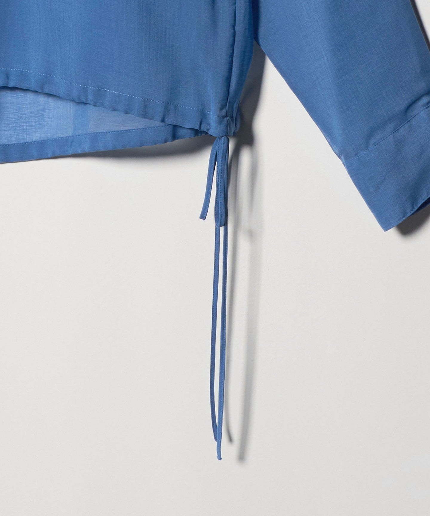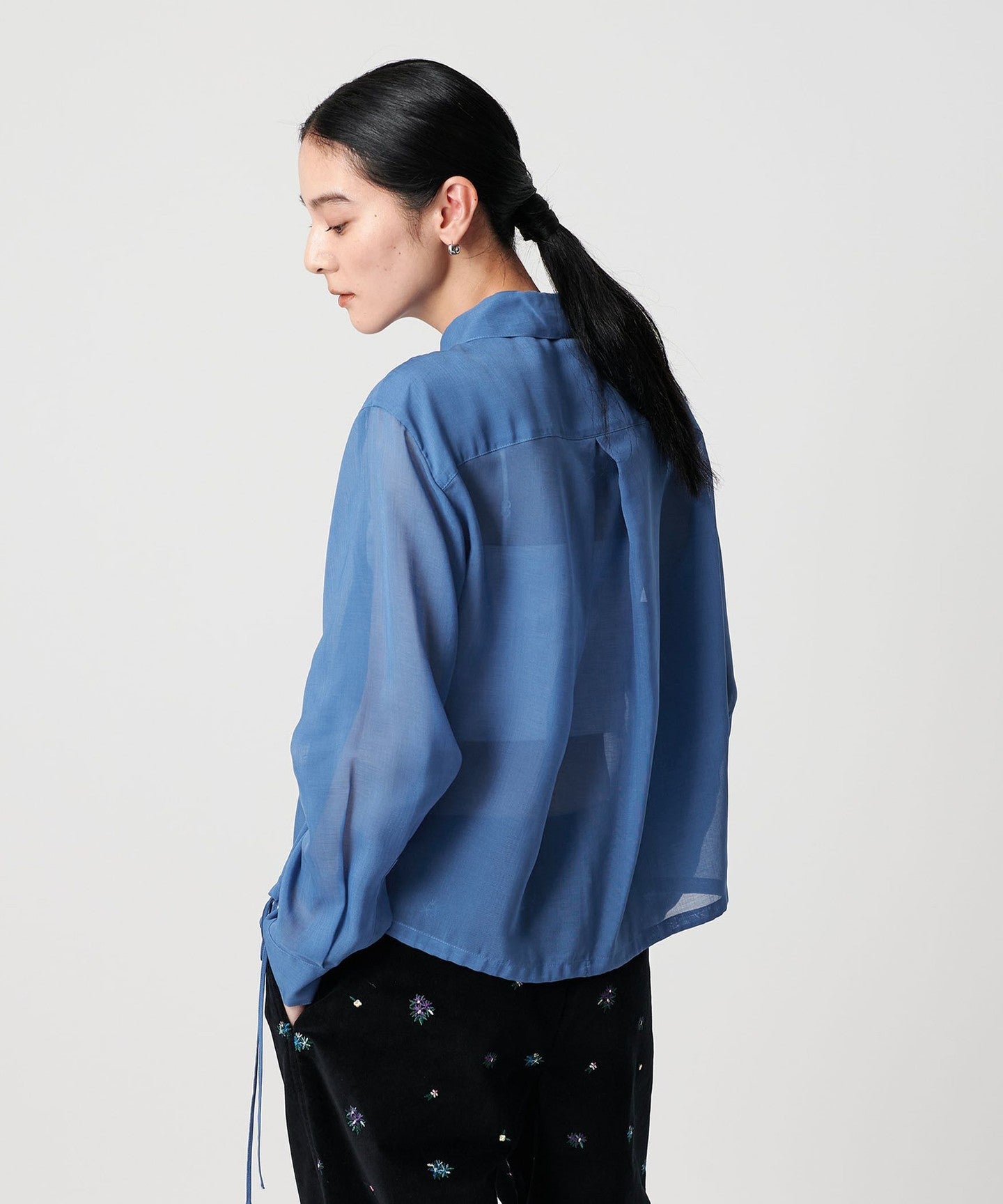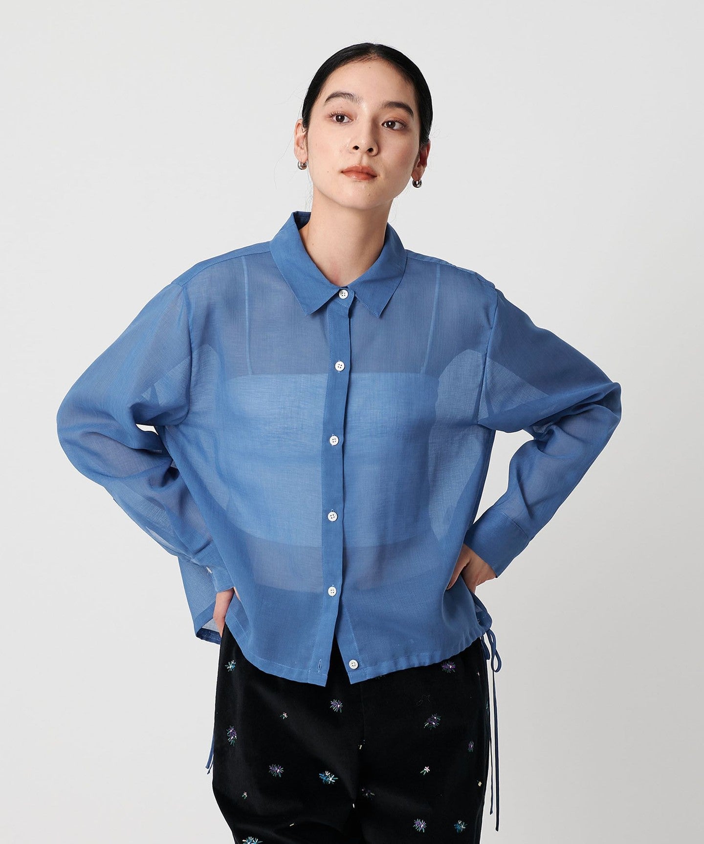 This drawstring shirt is made from trendy sheer material, making it easy to wear even in hot weather, even though it has long sleeves.