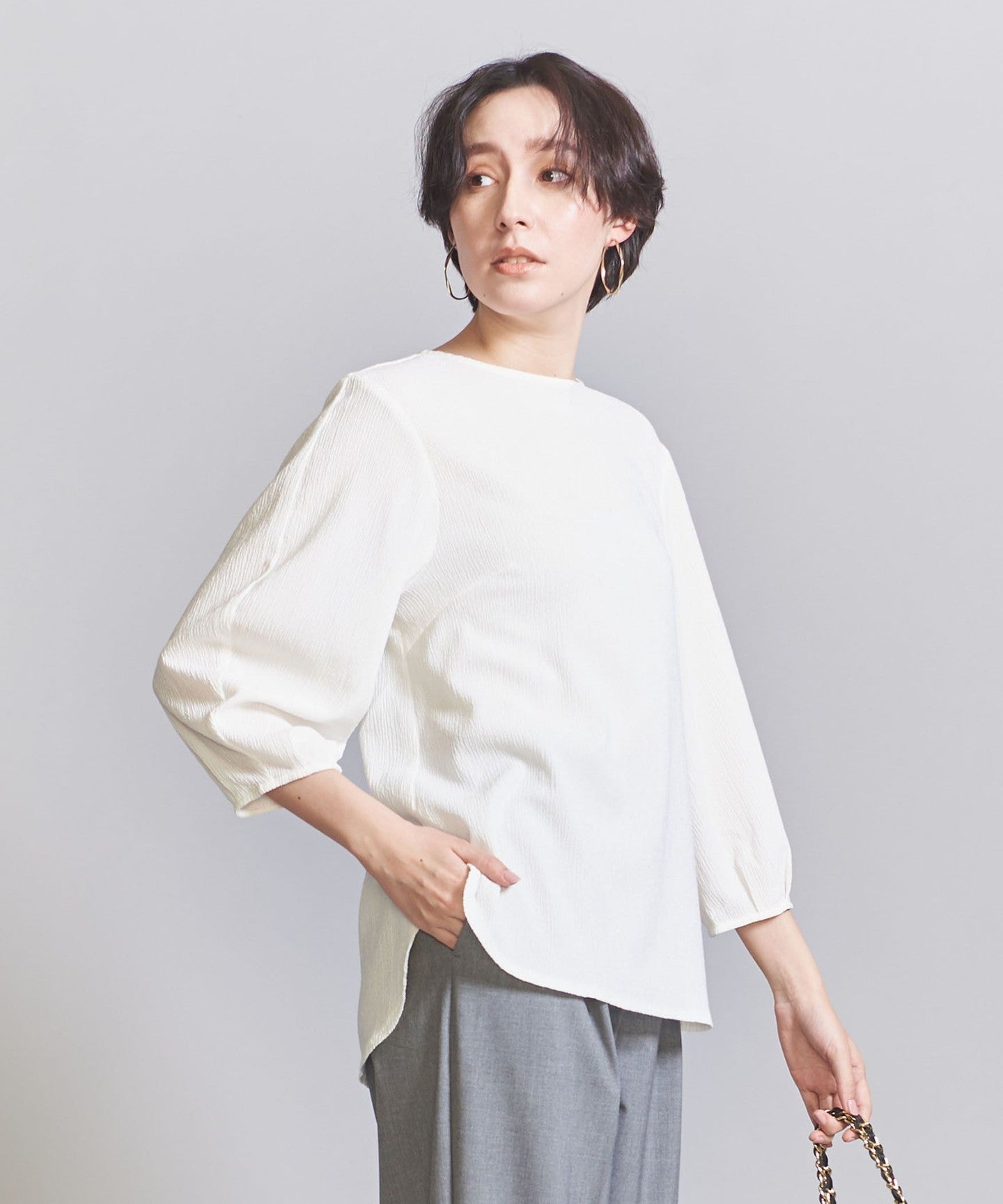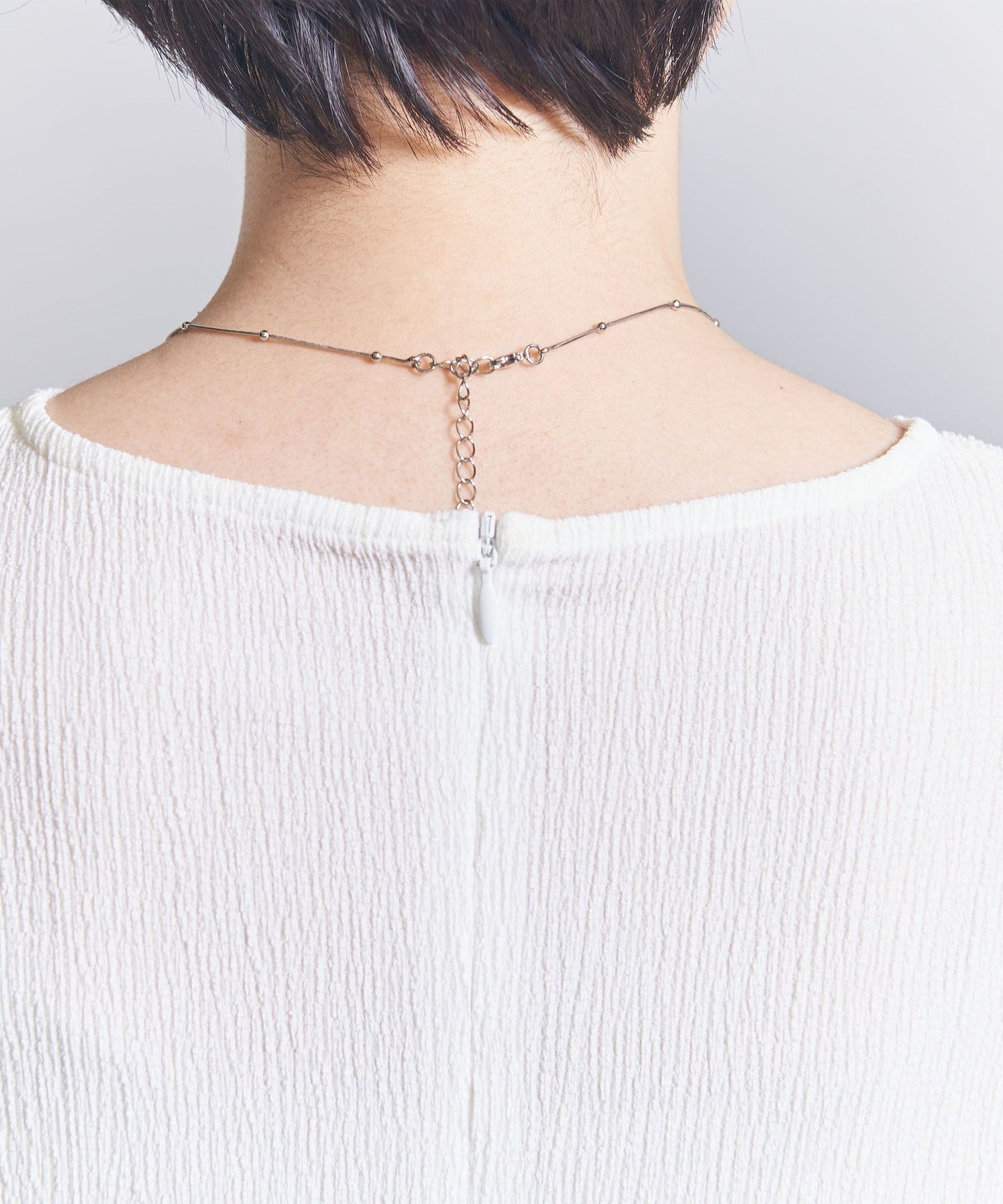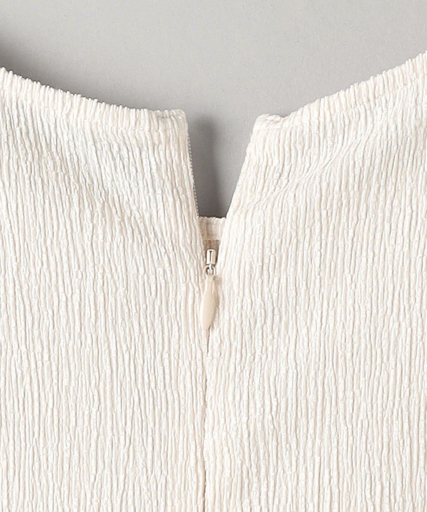 This dress has a round hem with a difference between the front and back, creating a soft, feminine mood.