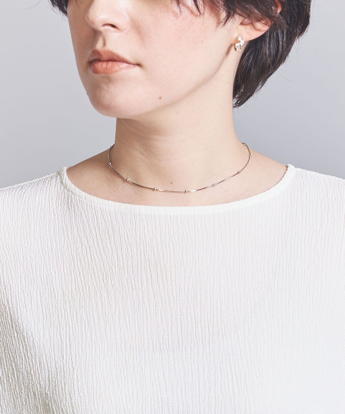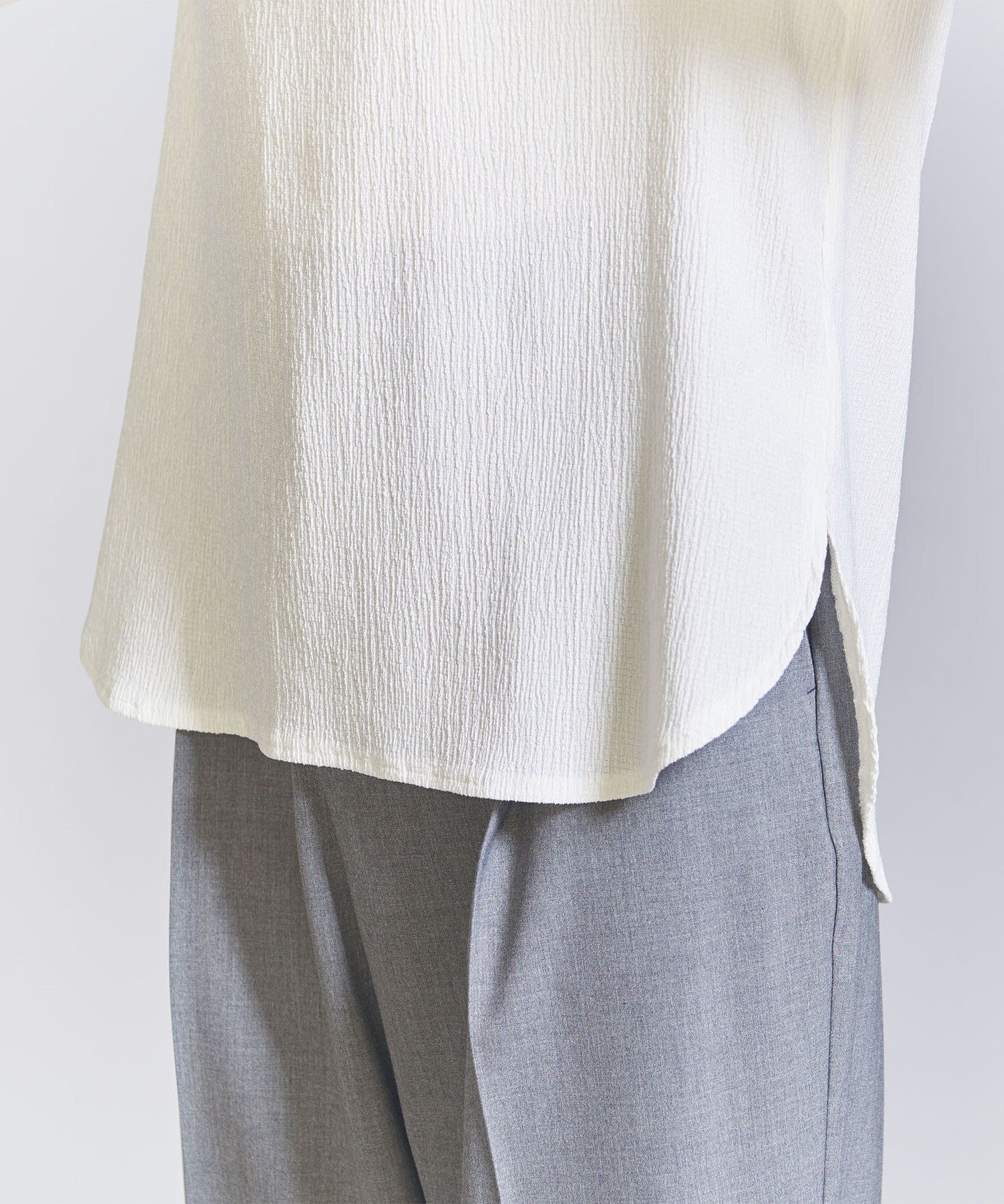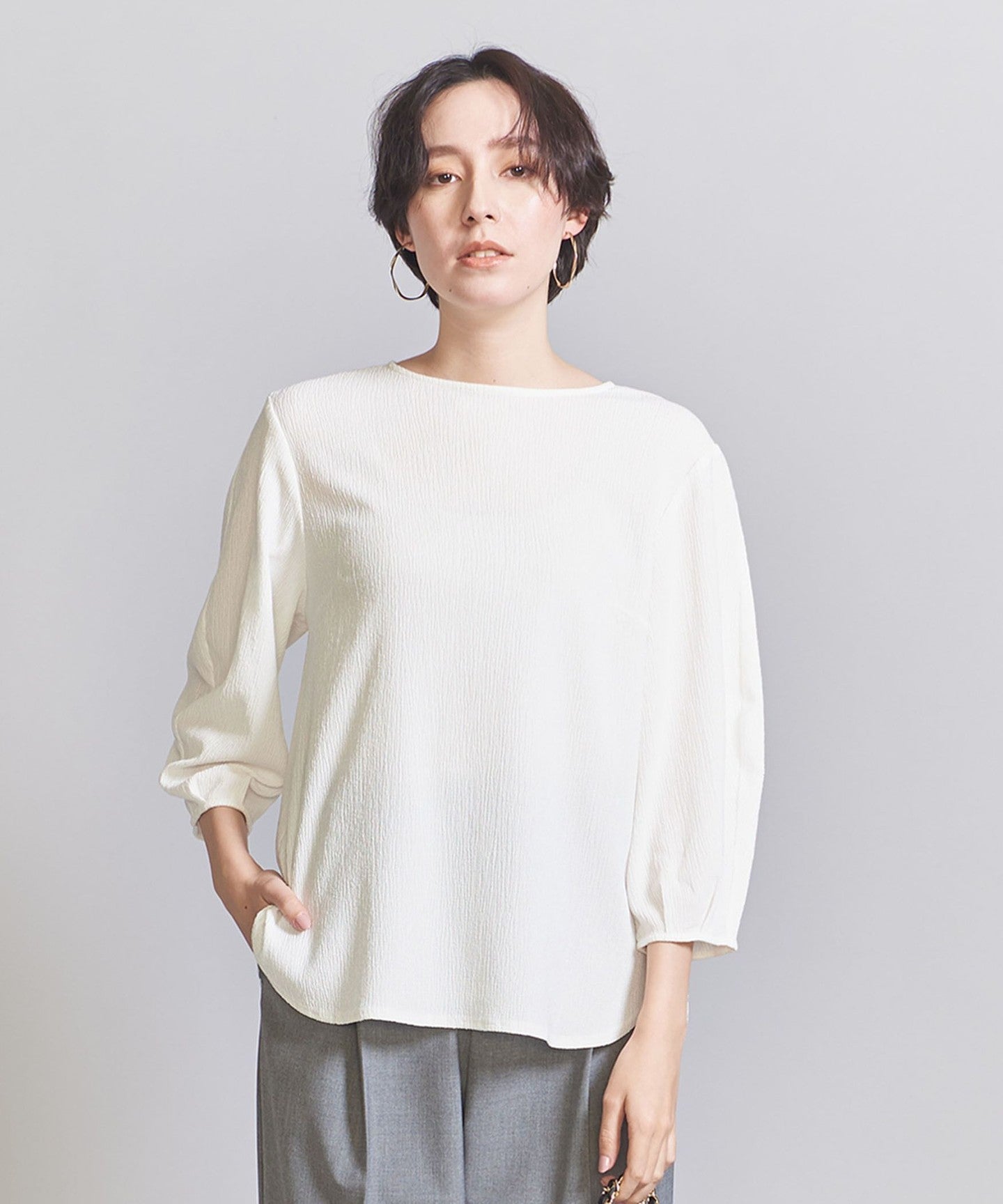 This dress has a round hem with a difference between the front and back, creating a soft, feminine mood.