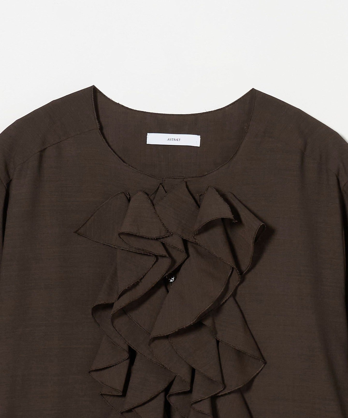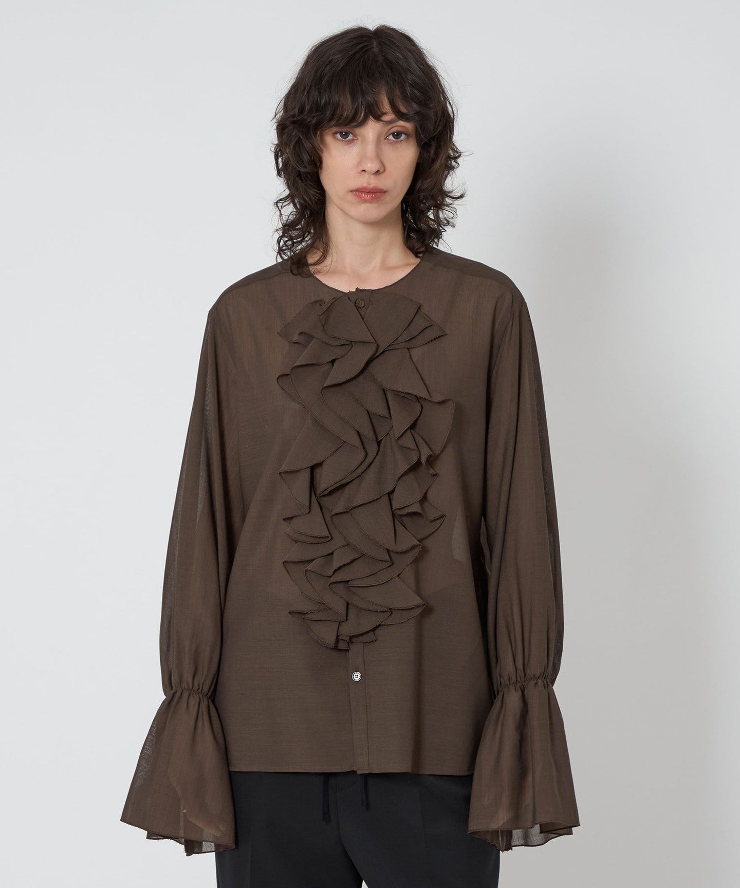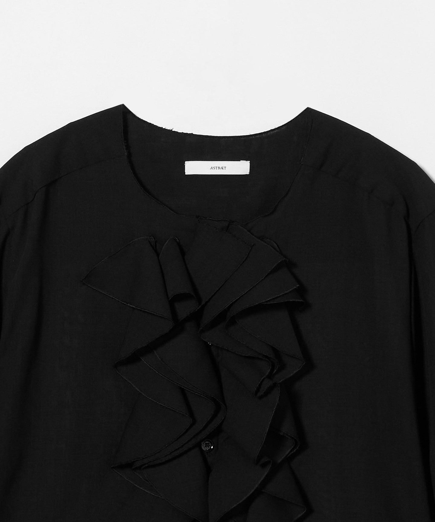 A collarless blouse with a gorgeous ruffled frill design on the chest.
