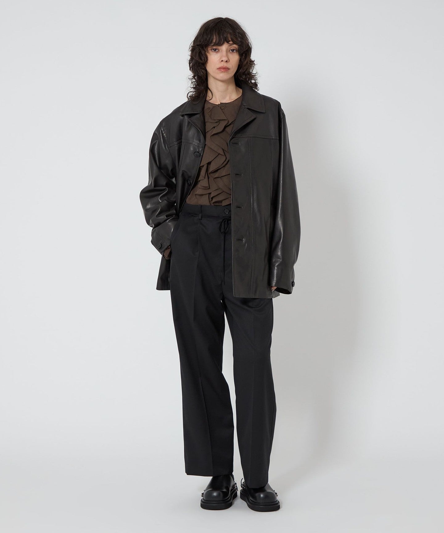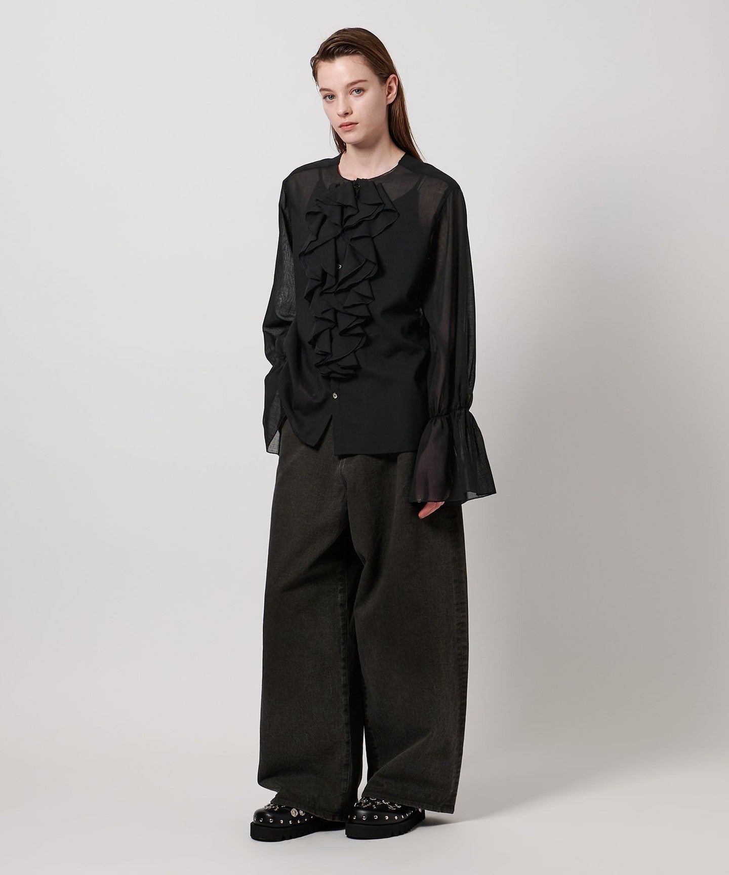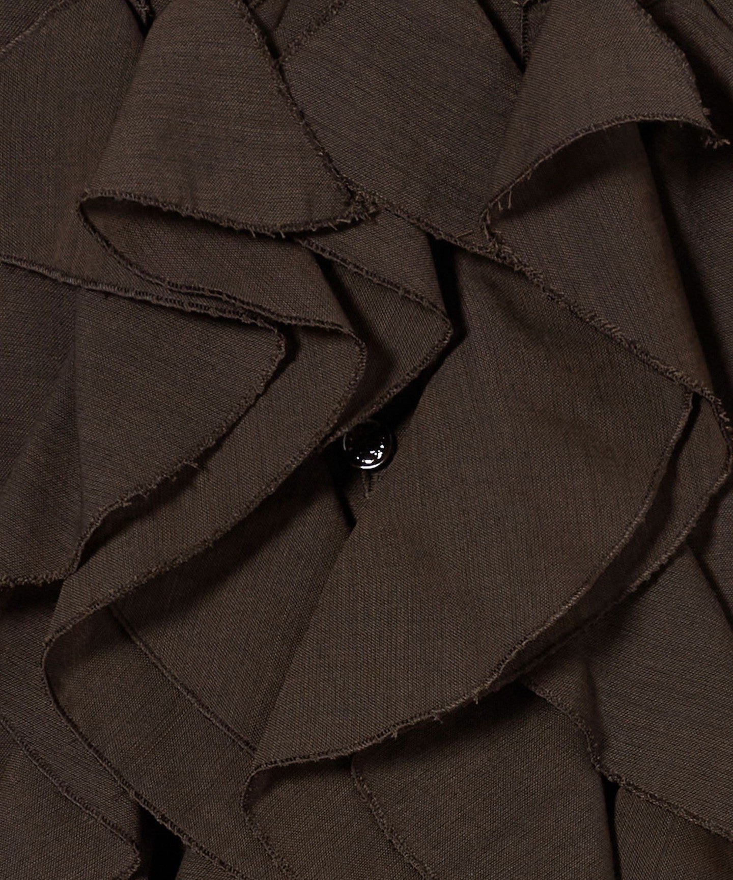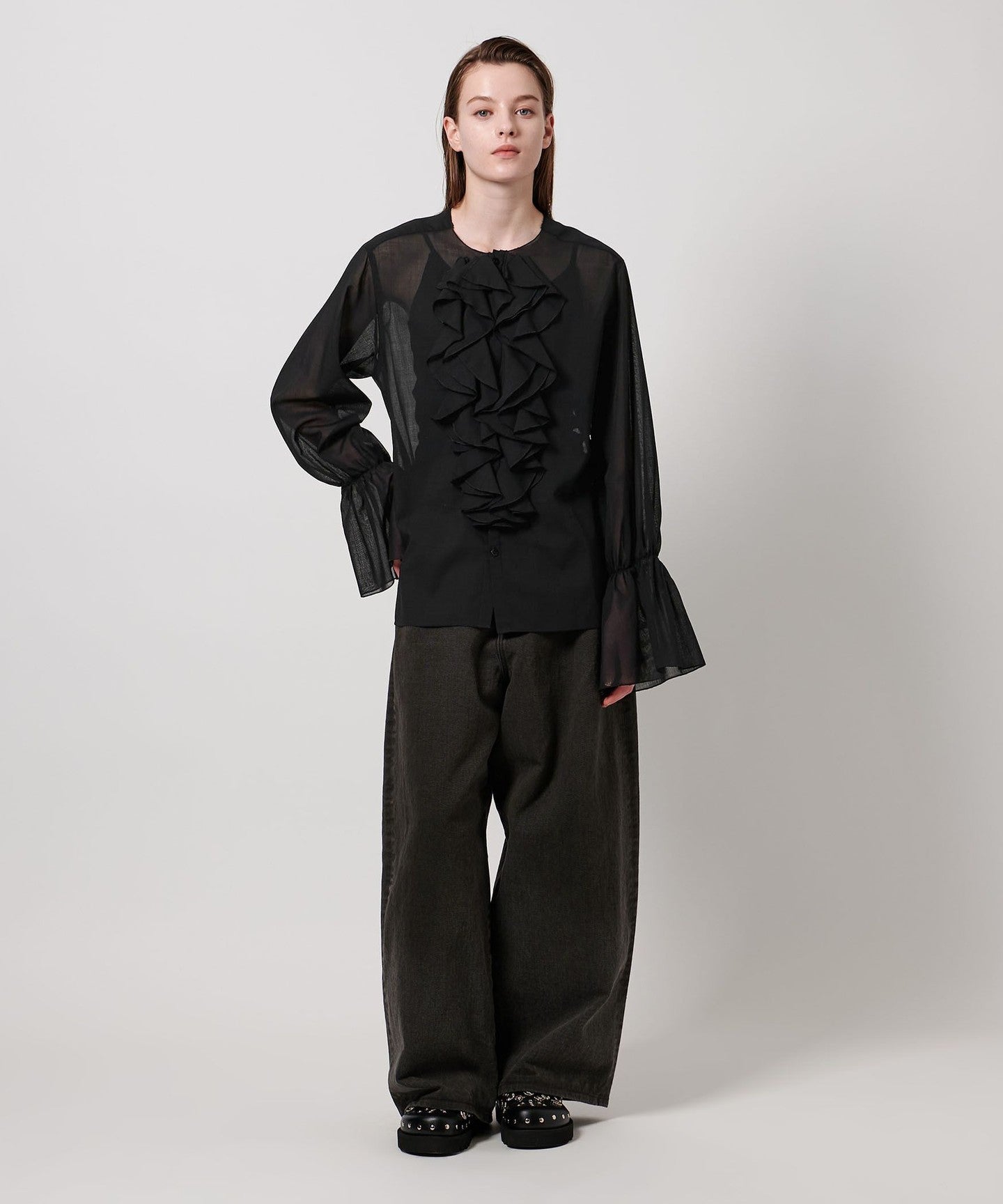 A collarless blouse with a gorgeous ruffled frill design on the chest.