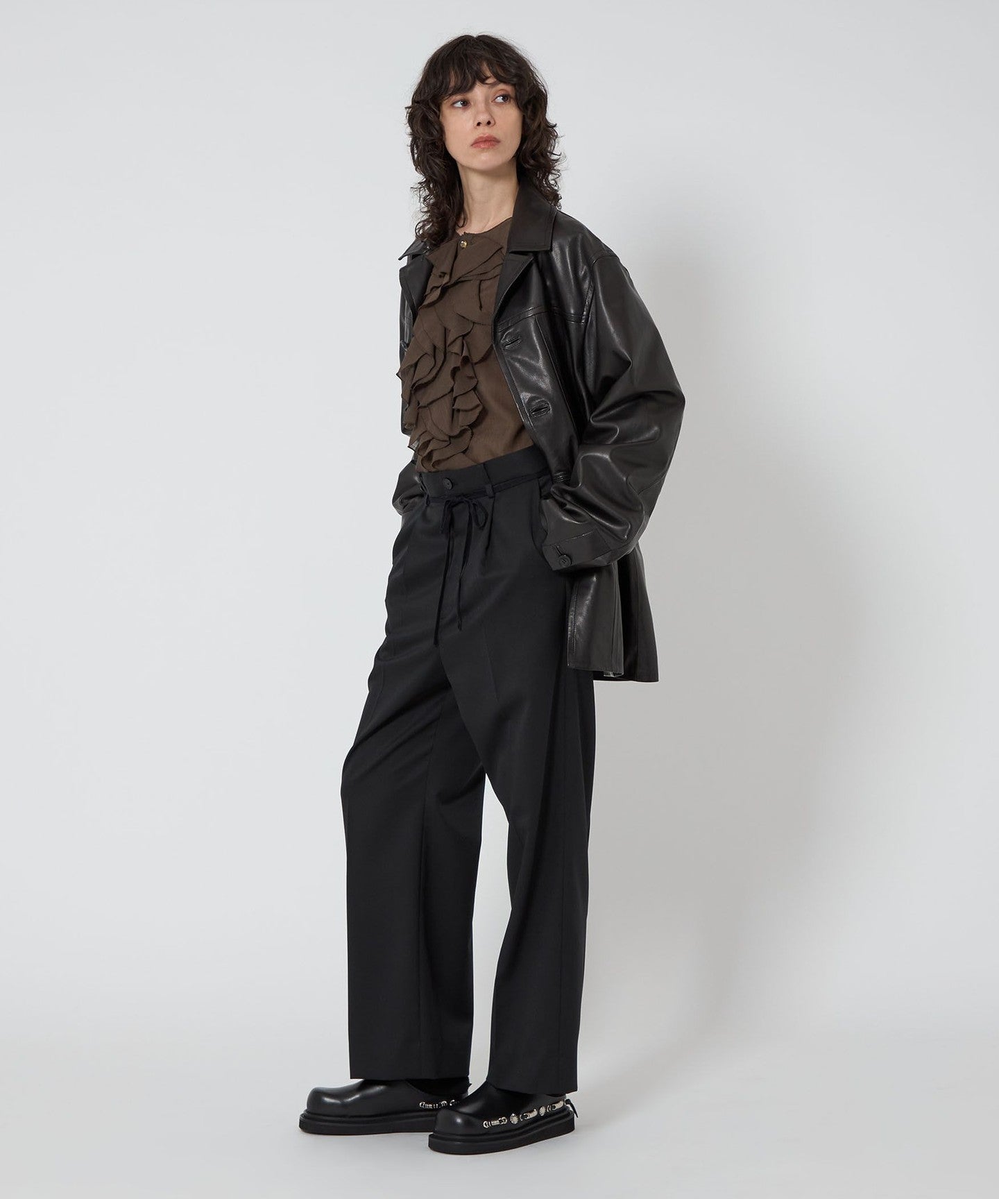 A gorgeous blouse with ruffles and puff sleeves that will be the focal point of your outfit.