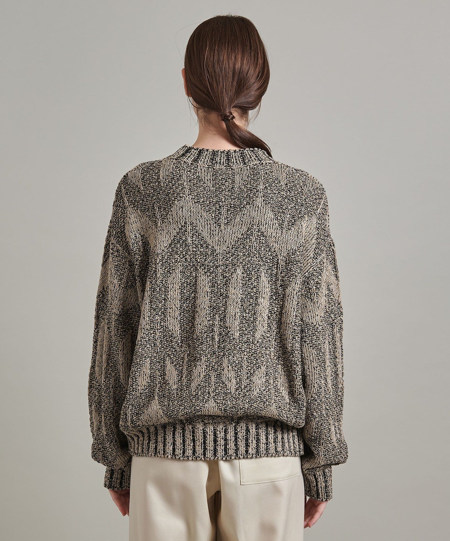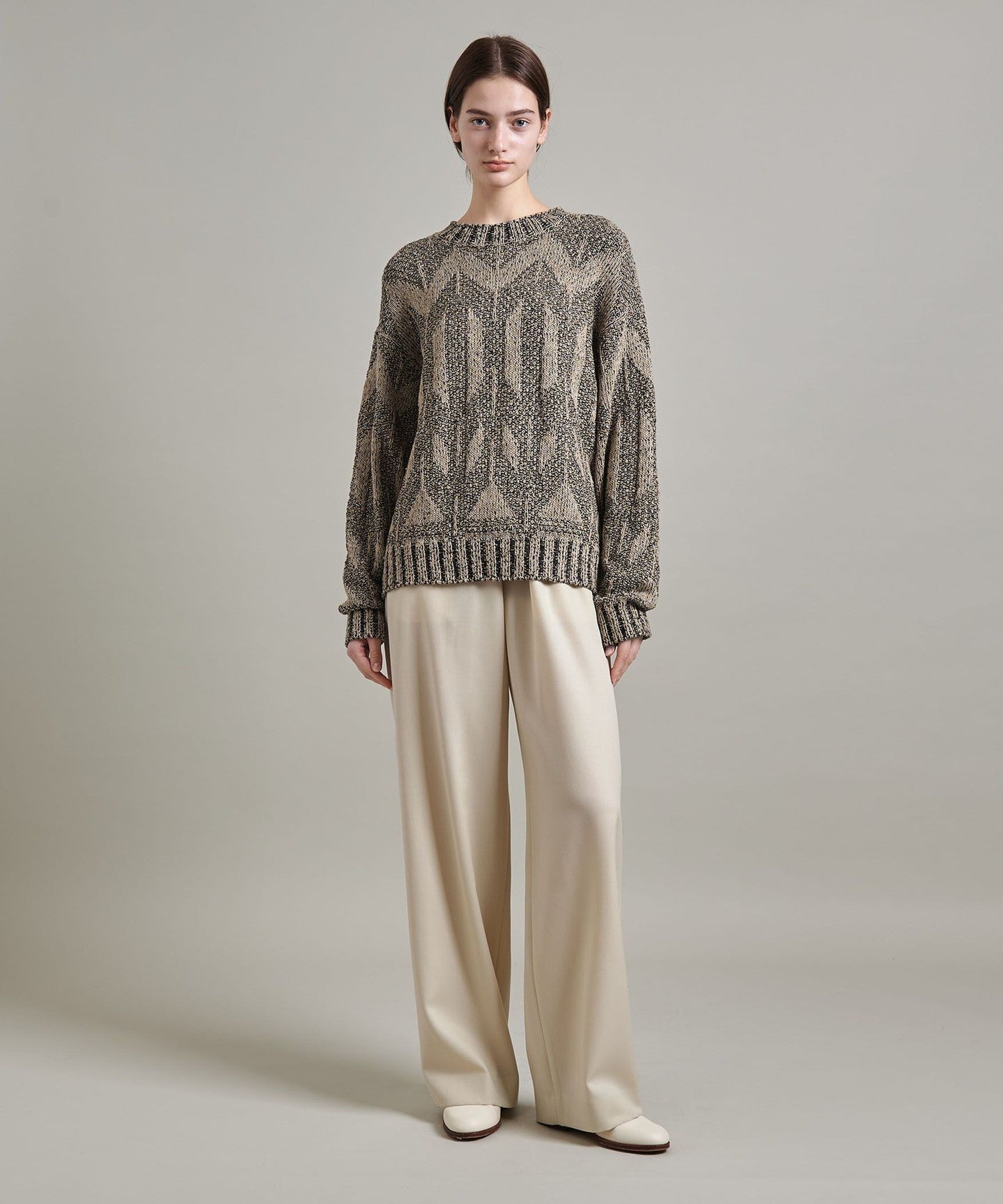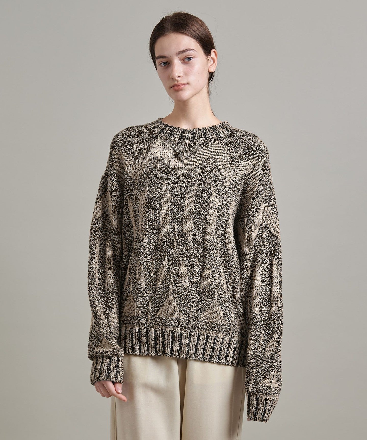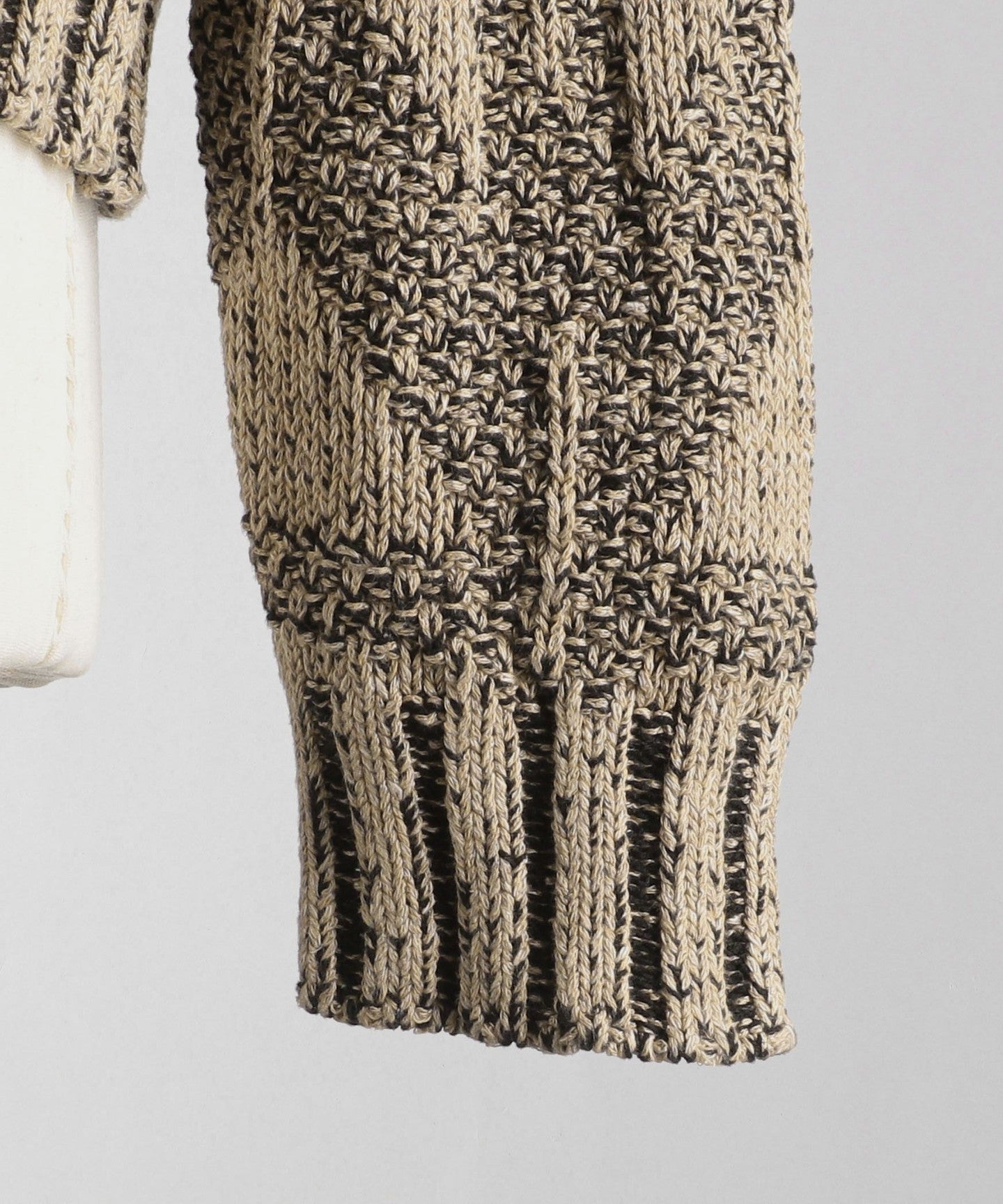 A low-gauge knit made from thick yarn with a clean texture, jacquard-like with double millwork knitting.
