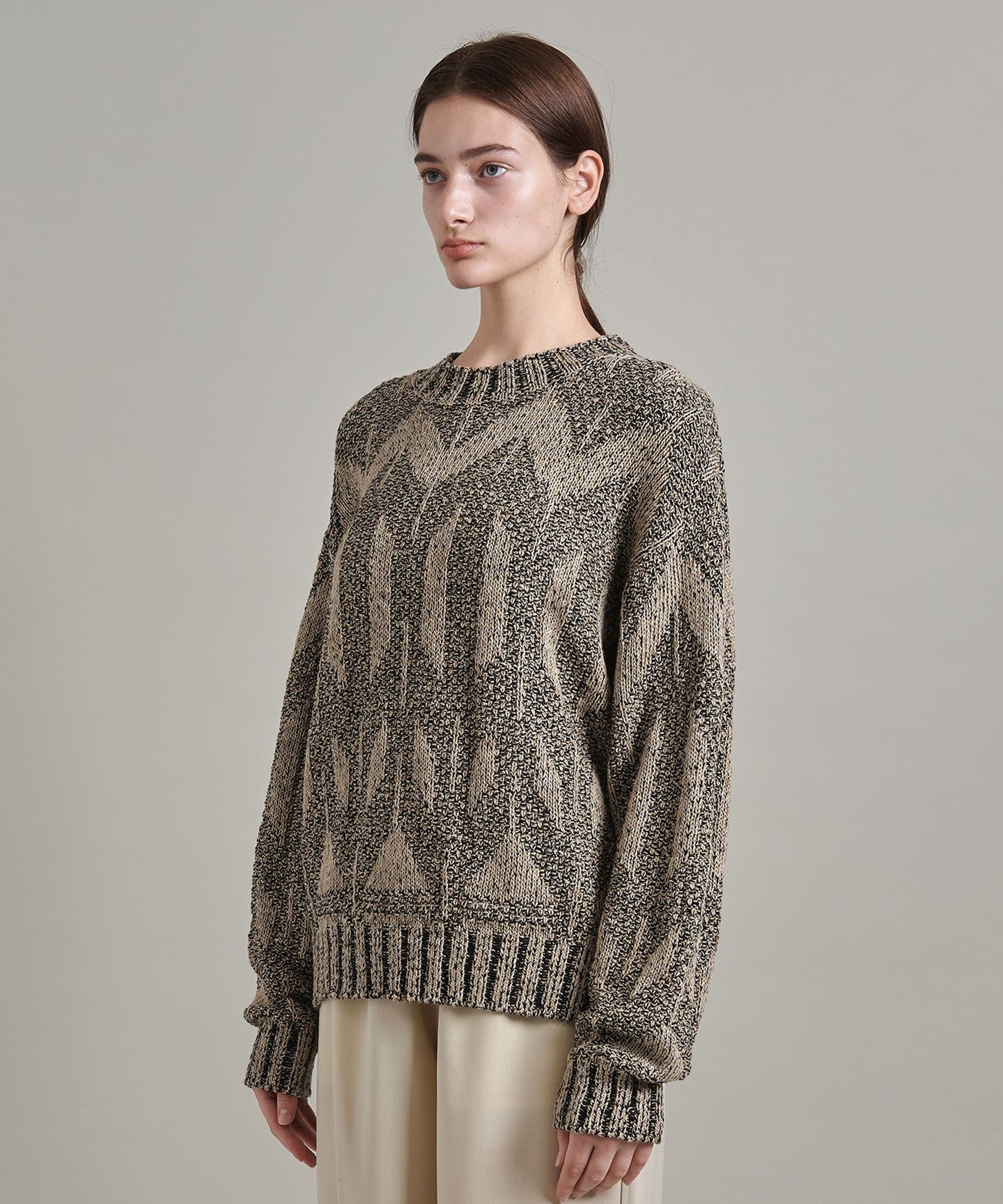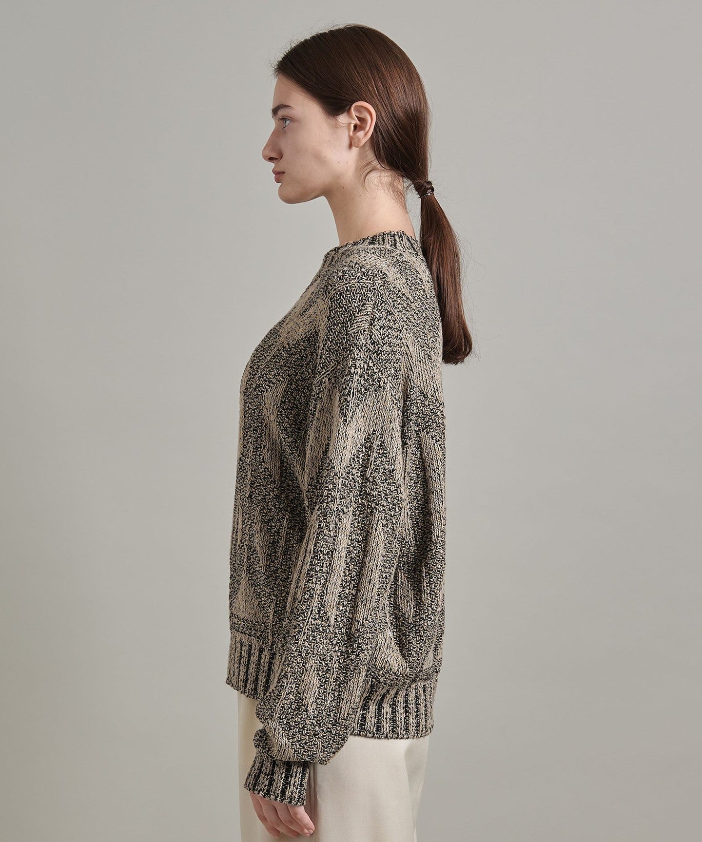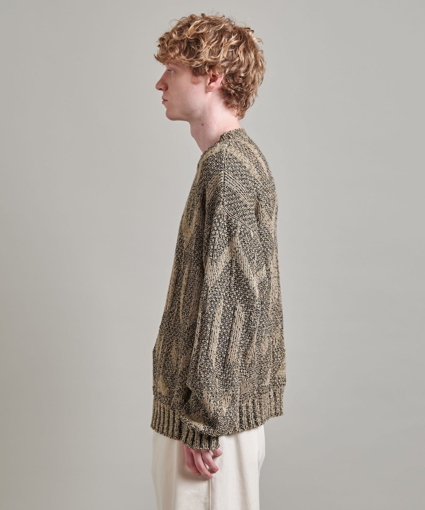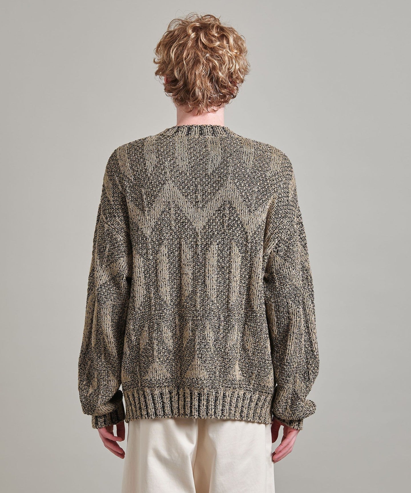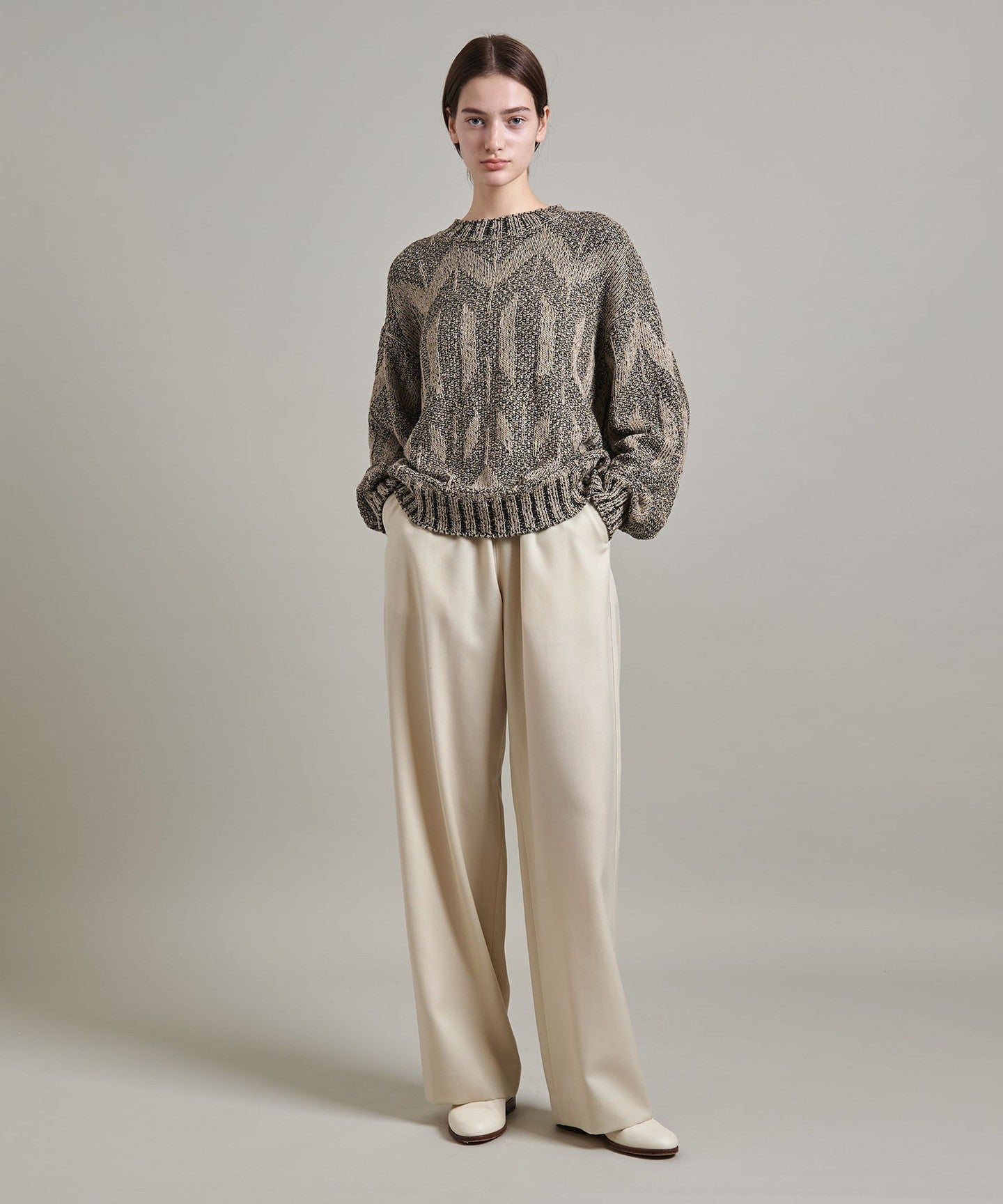 A low-gauge knit made from thick yarn with a clean texture, jacquard-like with double millwork knitting.