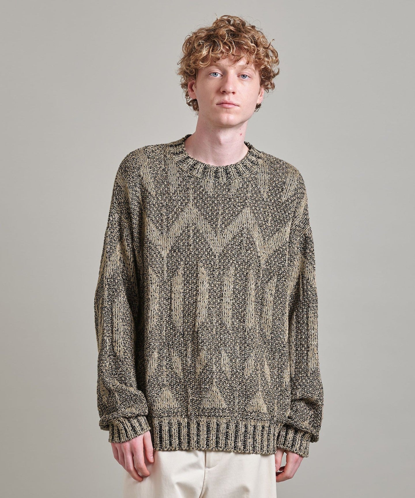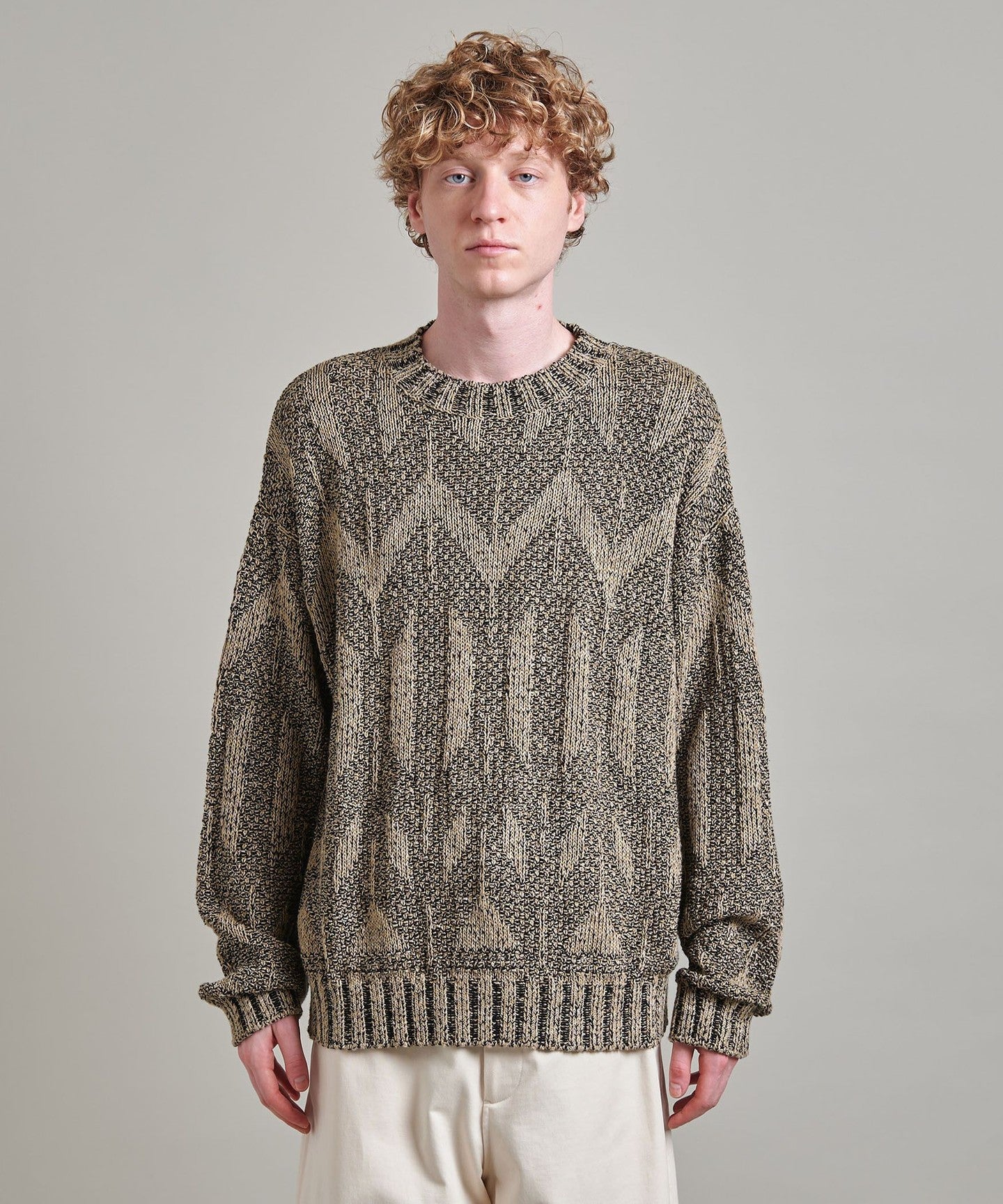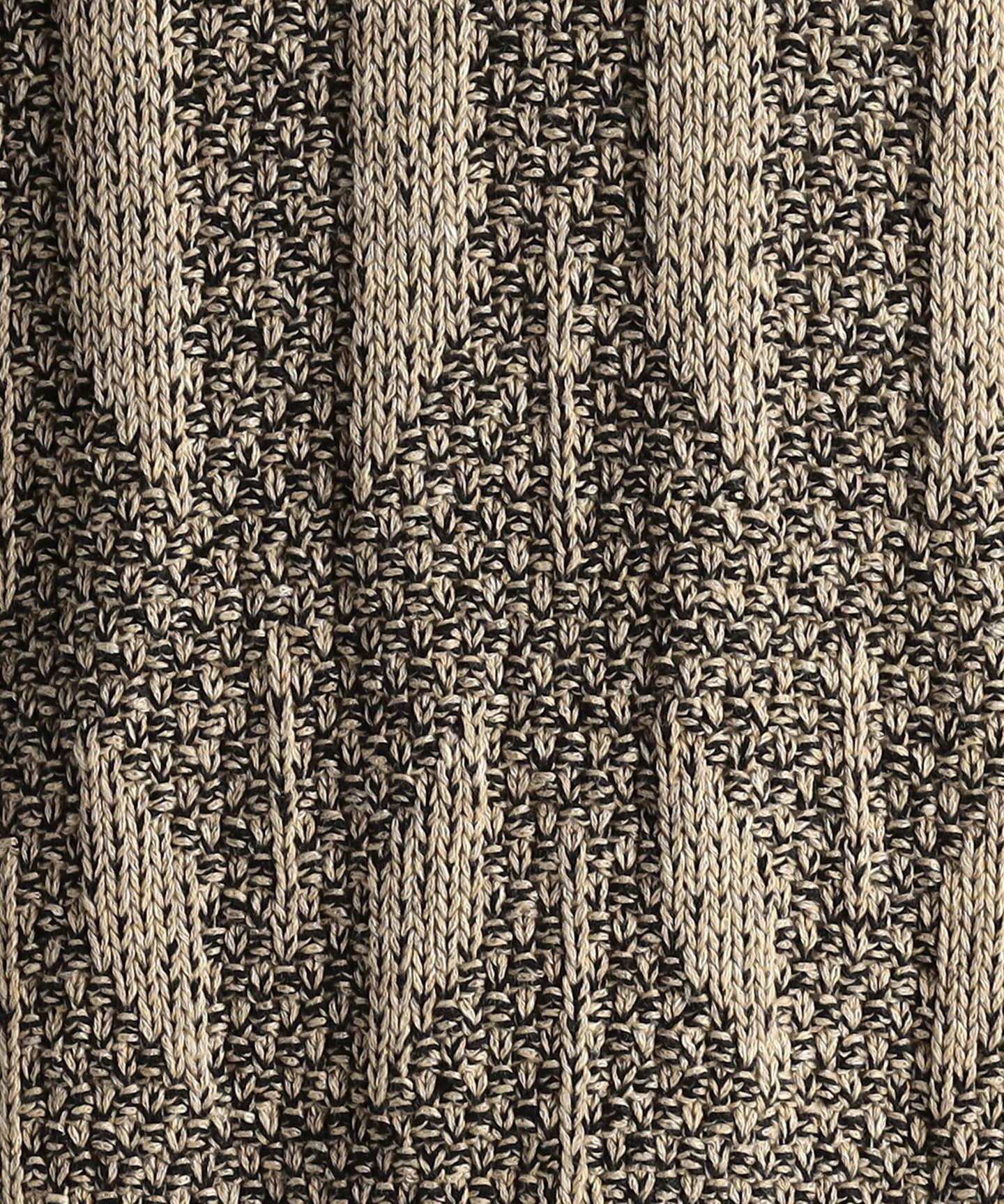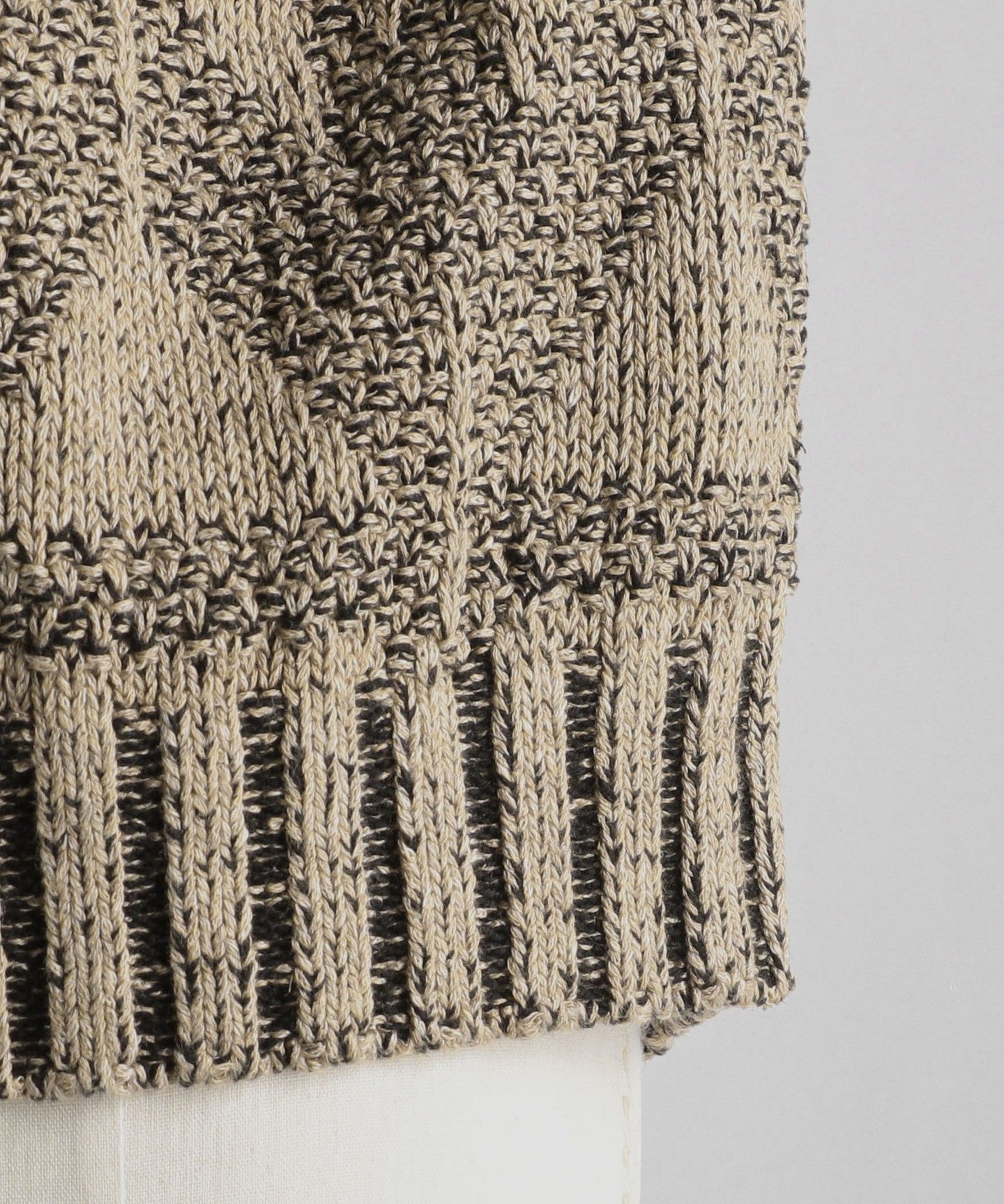 A low-gauge knit made from thick yarn with a clean texture, jacquard-like with double millwork knitting.