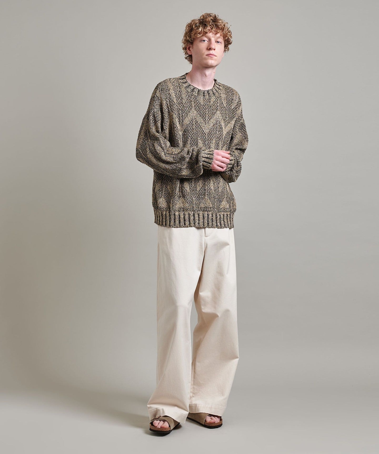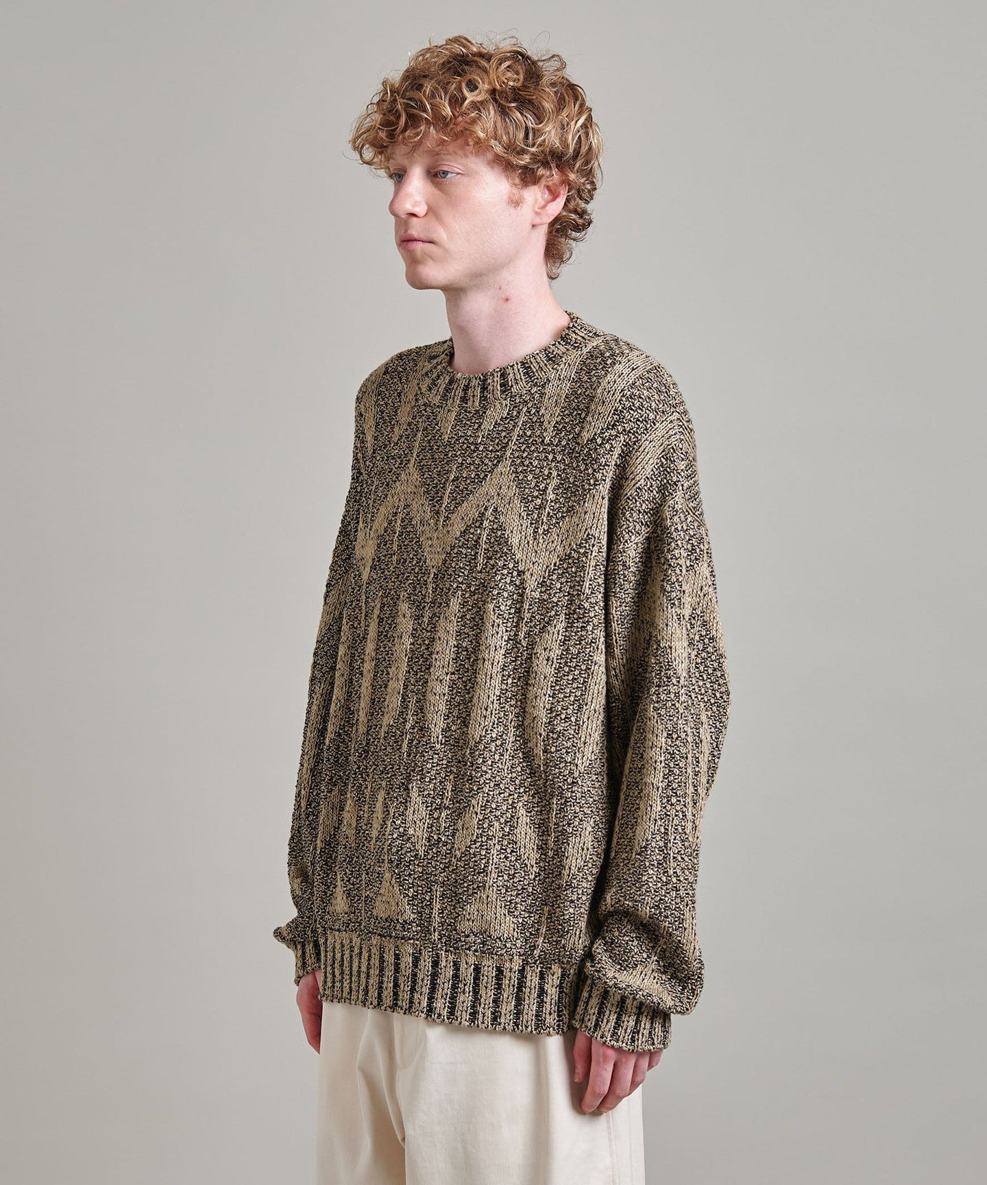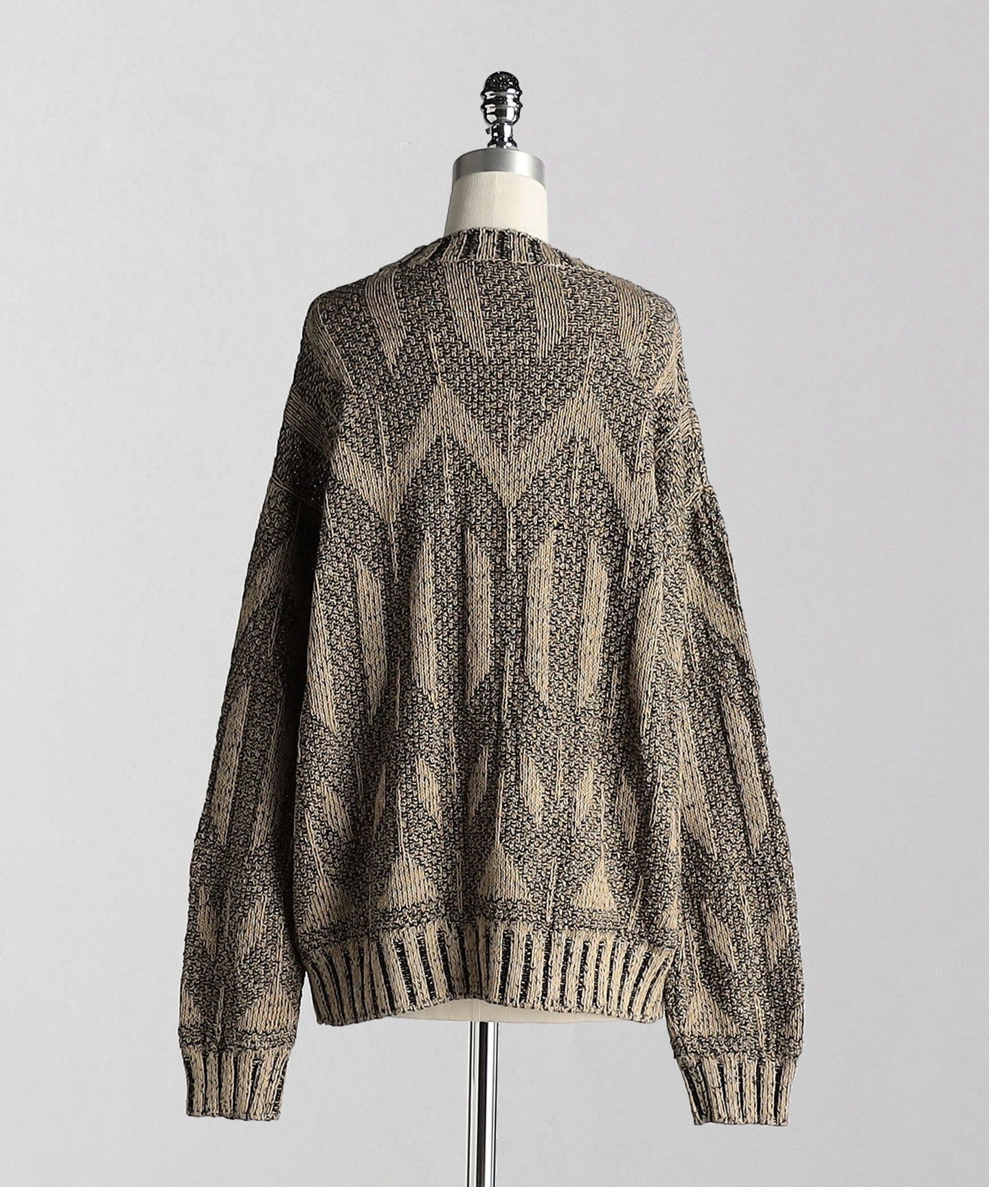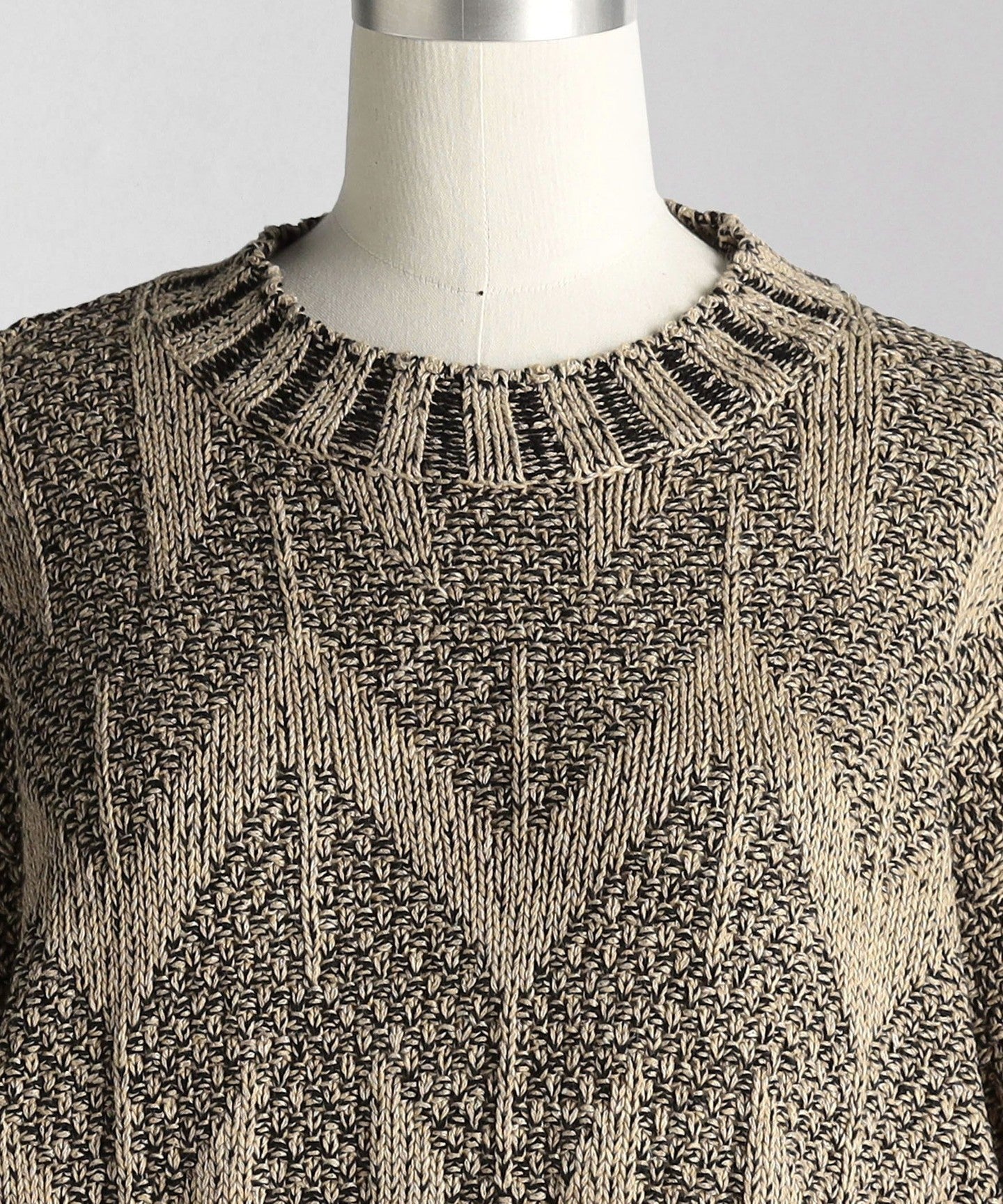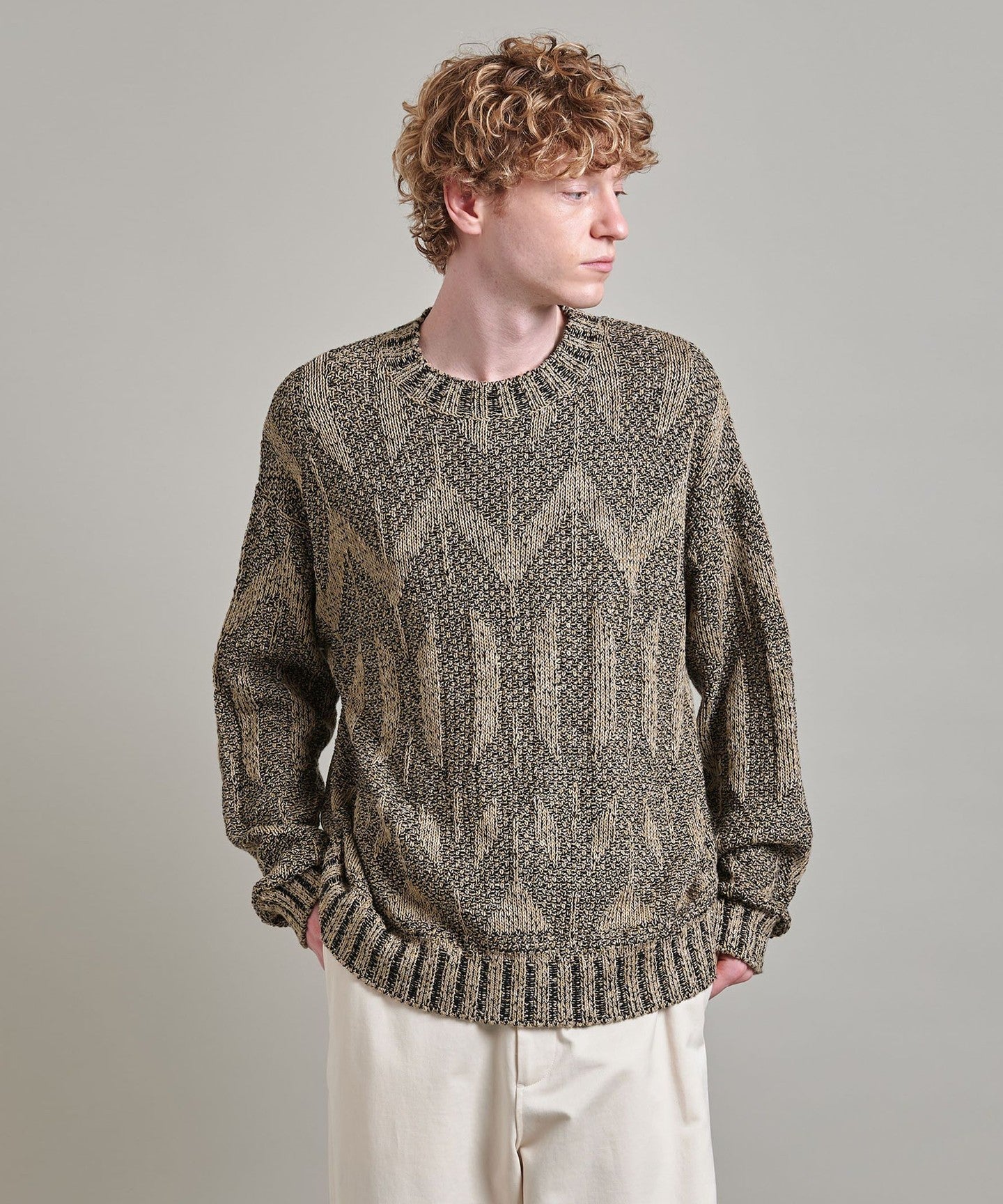 A low-gauge knit made from thick yarn with a clean texture, jacquard-like with double millwork knitting.