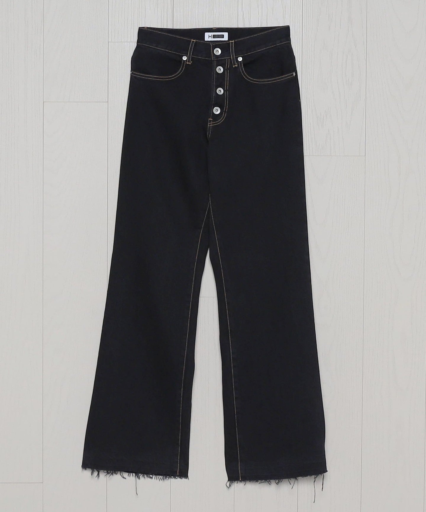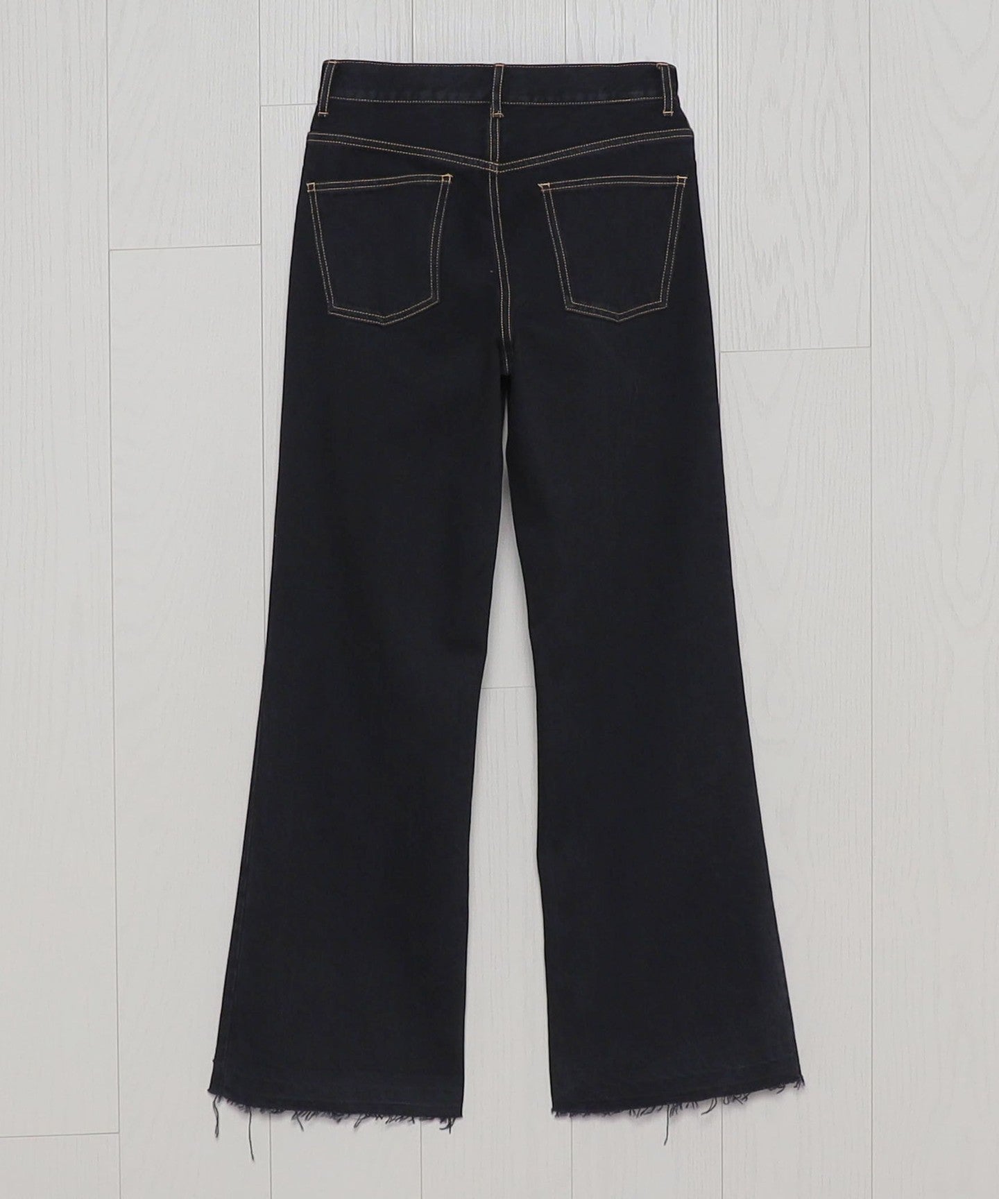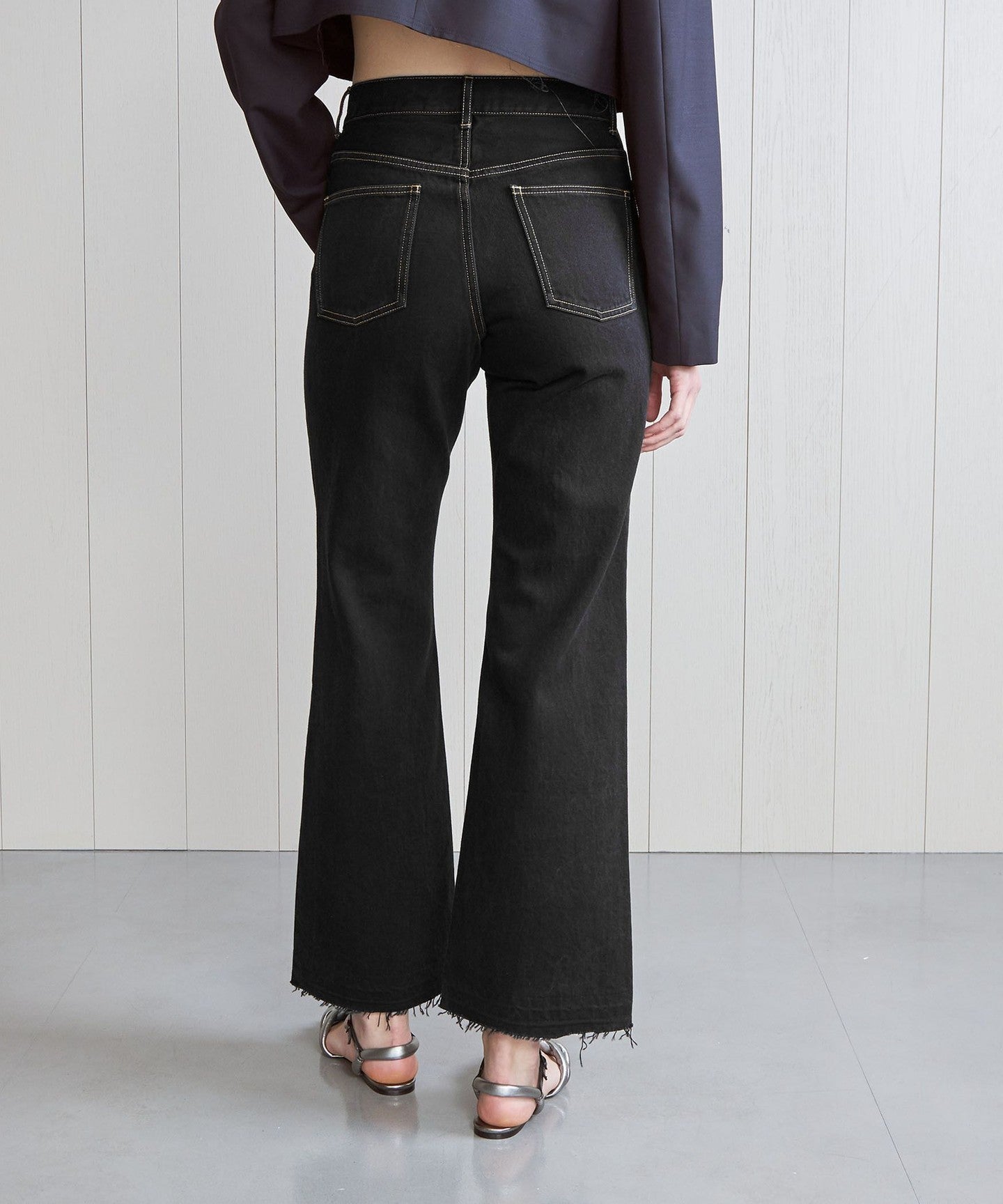 The slightly shallow rise and classic button fly detail are visible, while the cut-off hem adds a sophisticated touch.