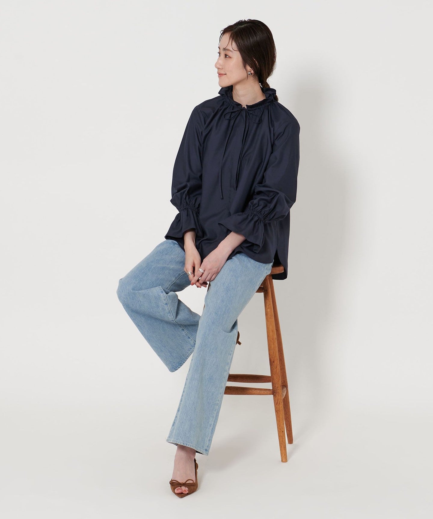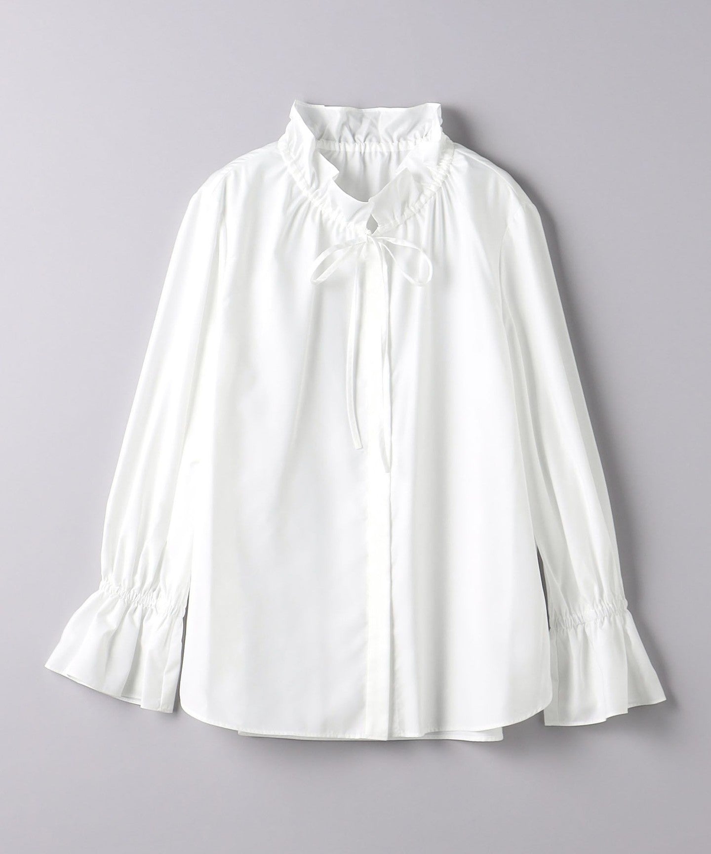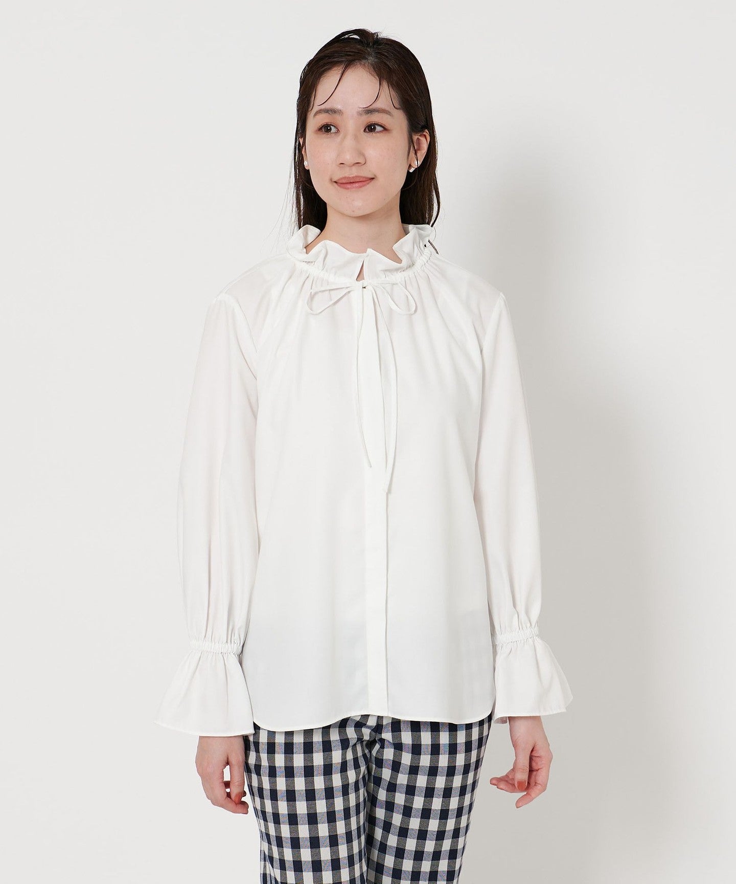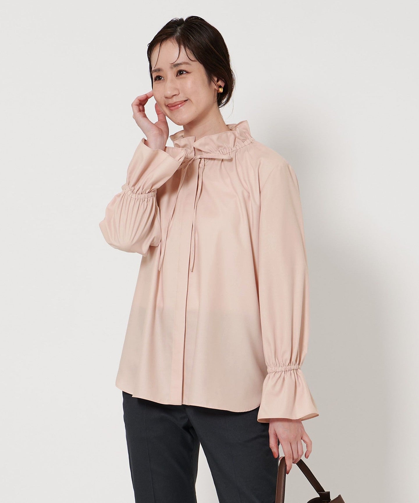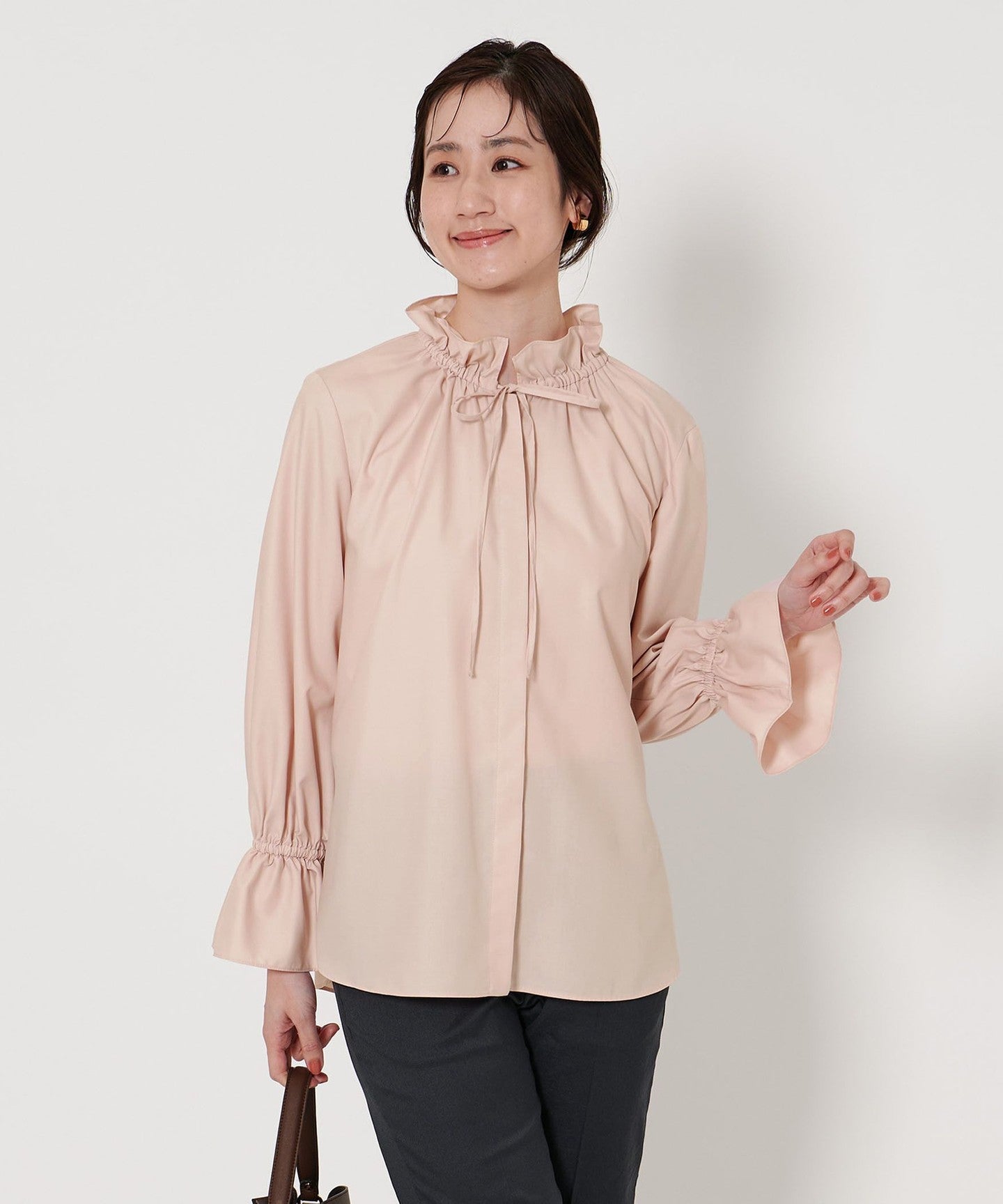 A feminine blouse with a ruffle and drawstring collar and bell sleeve cuffs.