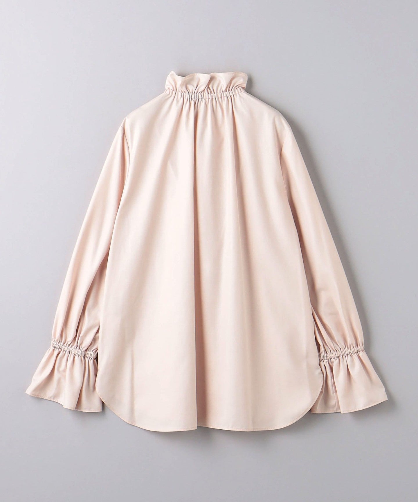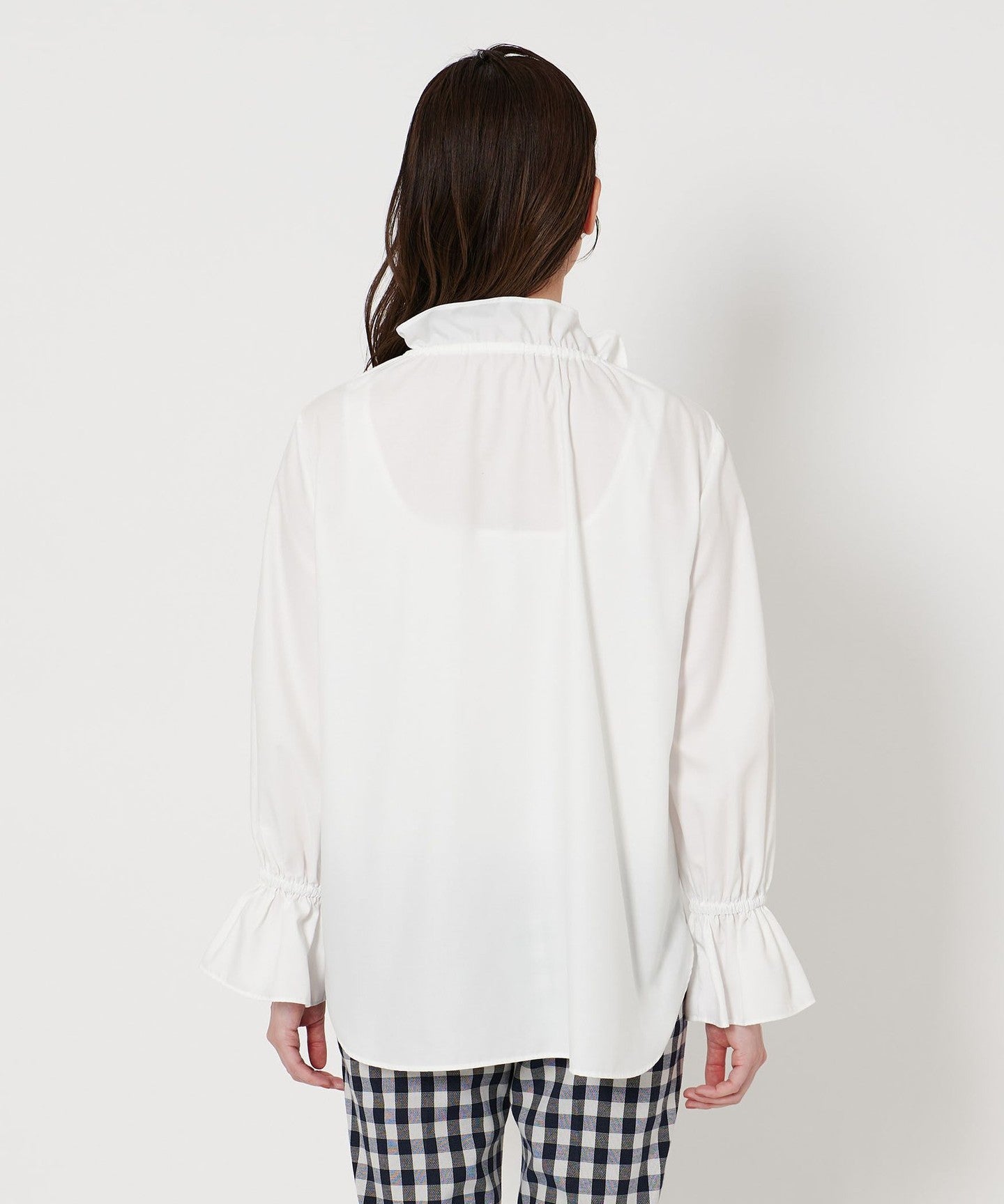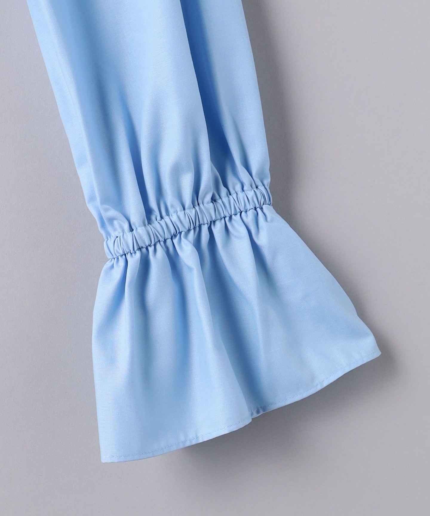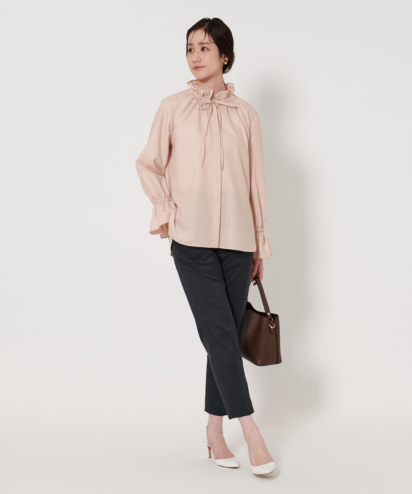 A feminine blouse with a ruffle and drawstring collar and bell sleeve cuffs.